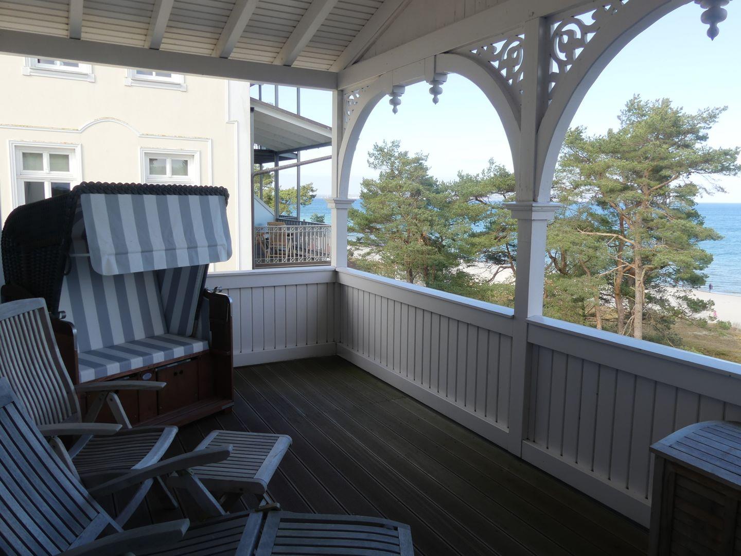 * Großer Balkon mit Meerblick, Balkonmöbel (Liegen und großer Tisch) sowie ein Strandkorb