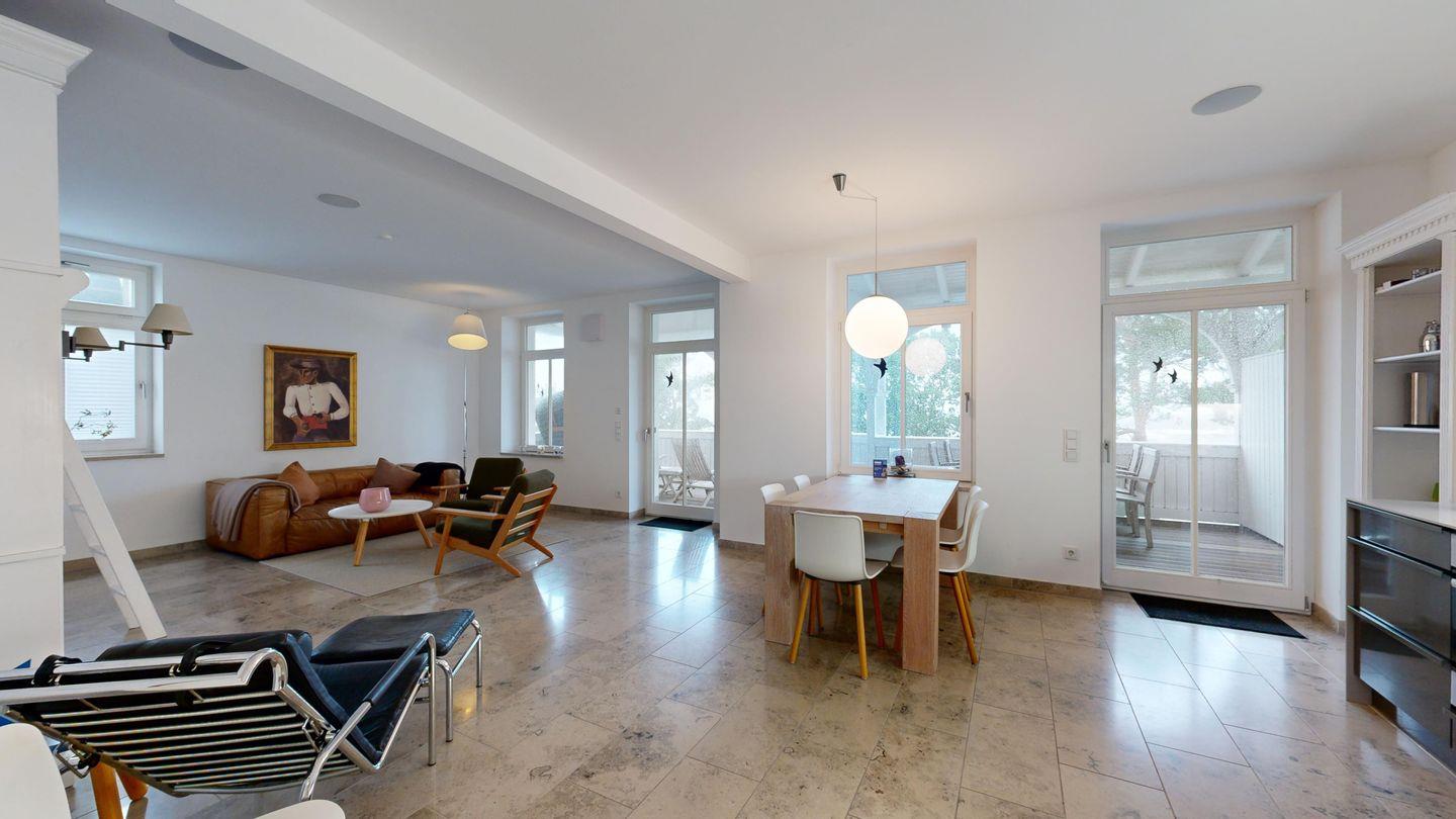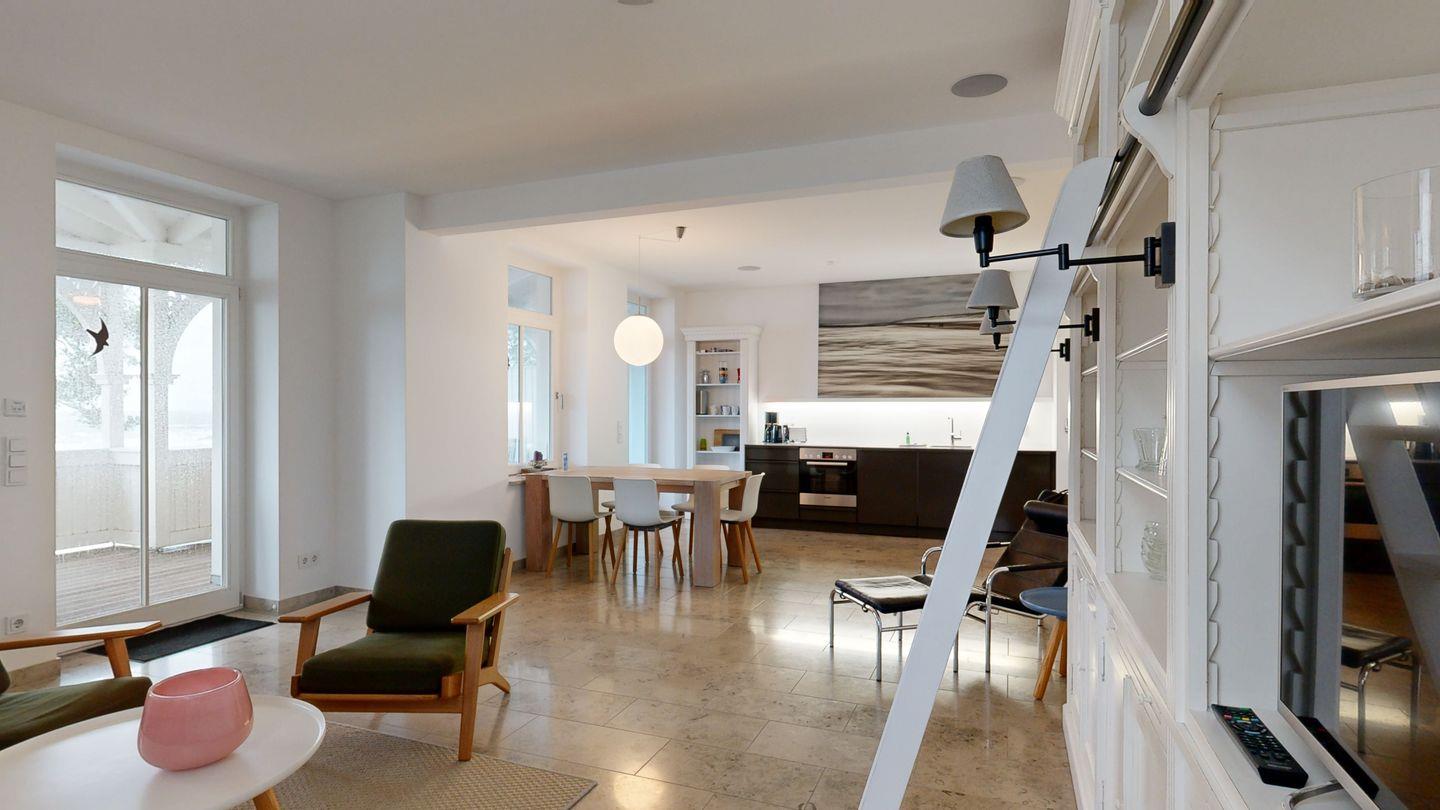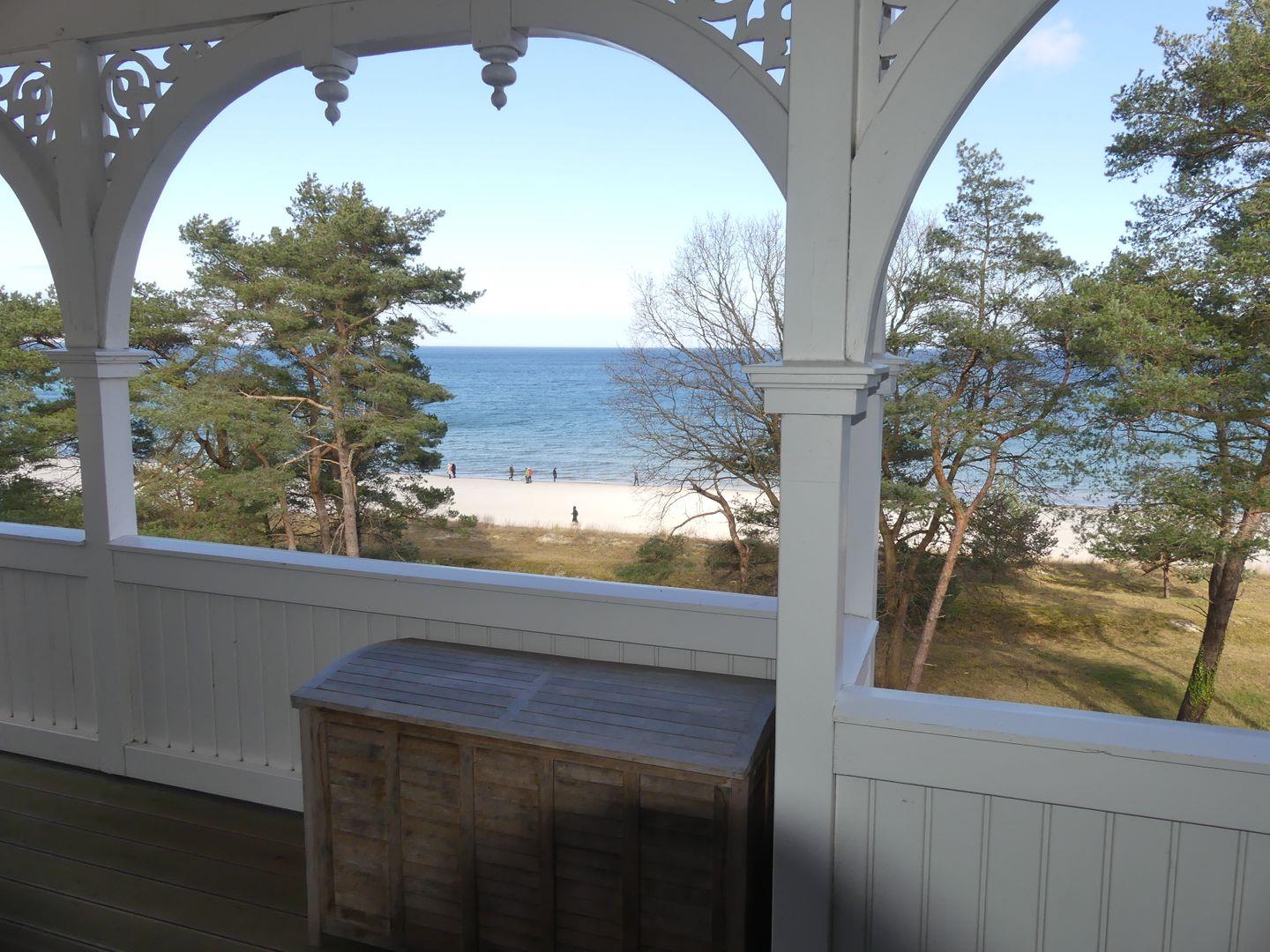 * Wohnzimmer: Heller, freundlicher Wohnraum mit einer gemütlichen Couch und 2 Sessel, LCD-Flachbildschirm, DVD-Player, Stereoanlage, Internetzugang (WLAN inkl.), Esstisch für 6 Personen, sehr großer Balkon zur Ostsee mit Meerblick, Balkonmöbeln und einem Strandkorb