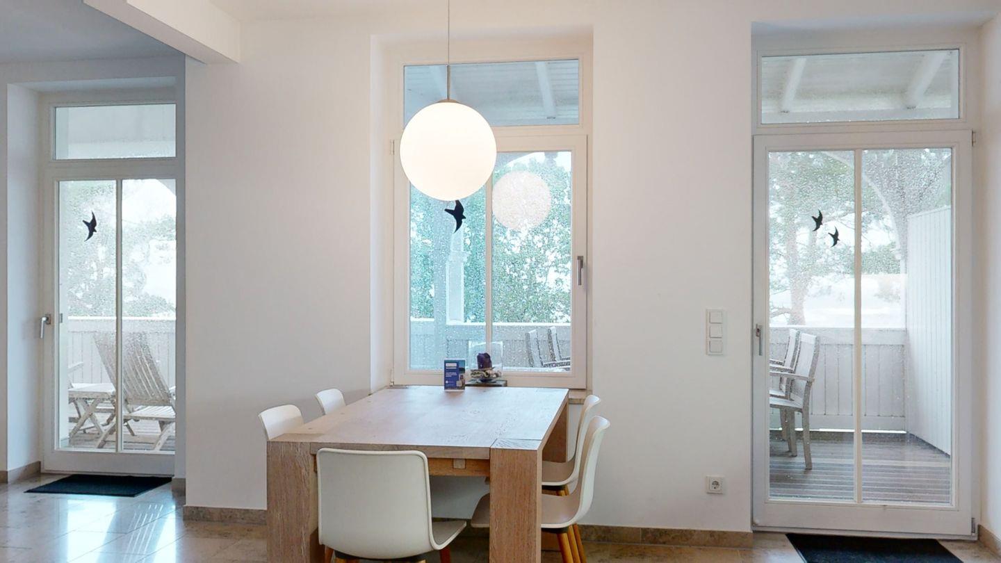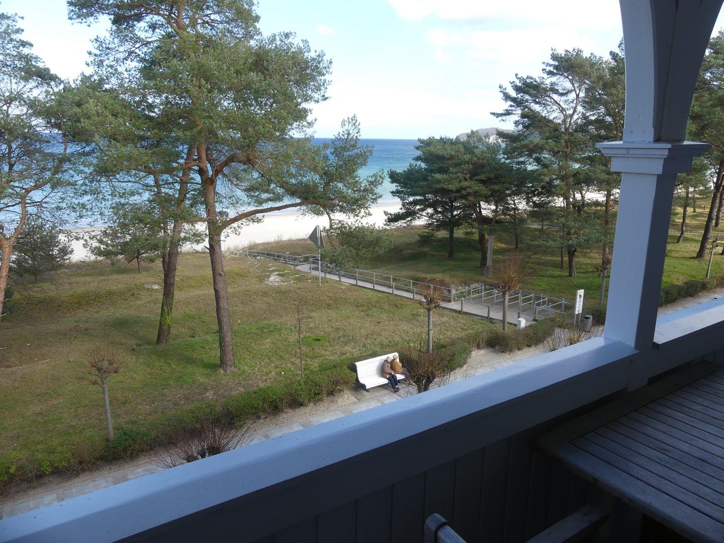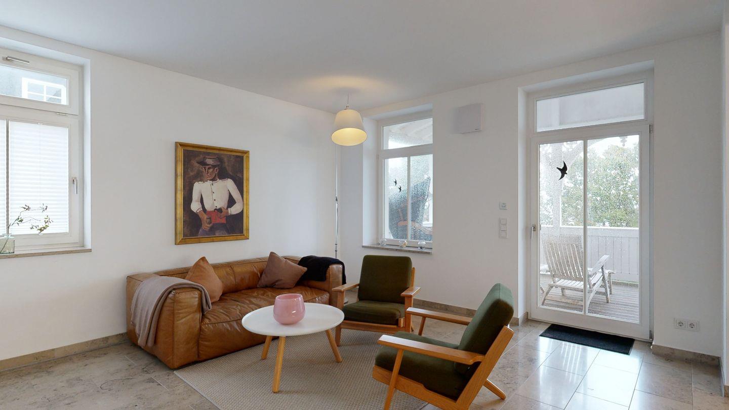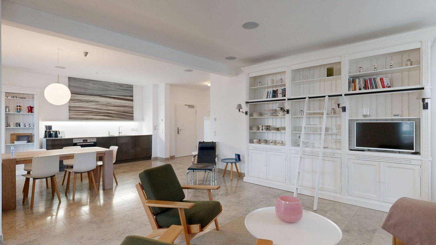 * Wohnzimmer: Heller, freundlicher Wohnraum mit einer gemütlichen Couch und 2 Sessel, LCD-Flachbildschirm, DVD-Player, Stereoanlage, Internetzugang (WLAN inkl.), Esstisch für 6 Personen, sehr großer Balkon zur Ostsee mit Meerblick, Balkonmöbeln und einem Strandkorb