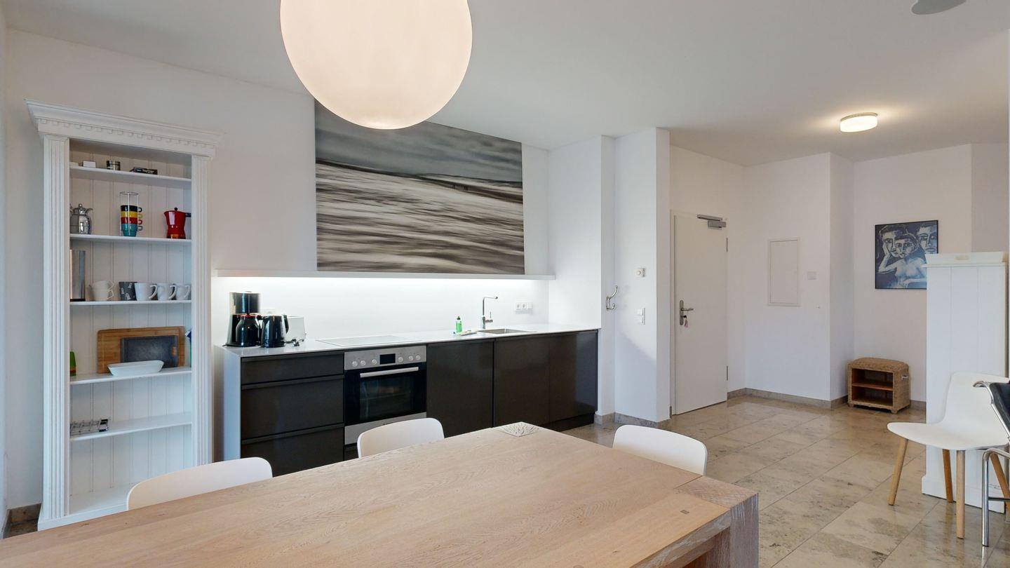 * Küche: Hochwertige, neue Küchenzeile im Wohnraum integriert mit Ceran-Herd und Backofen, Spülmaschine, Kühlschrank mit Gefrierfach, Kaffeemaschine, Toaster, Wasserkocher