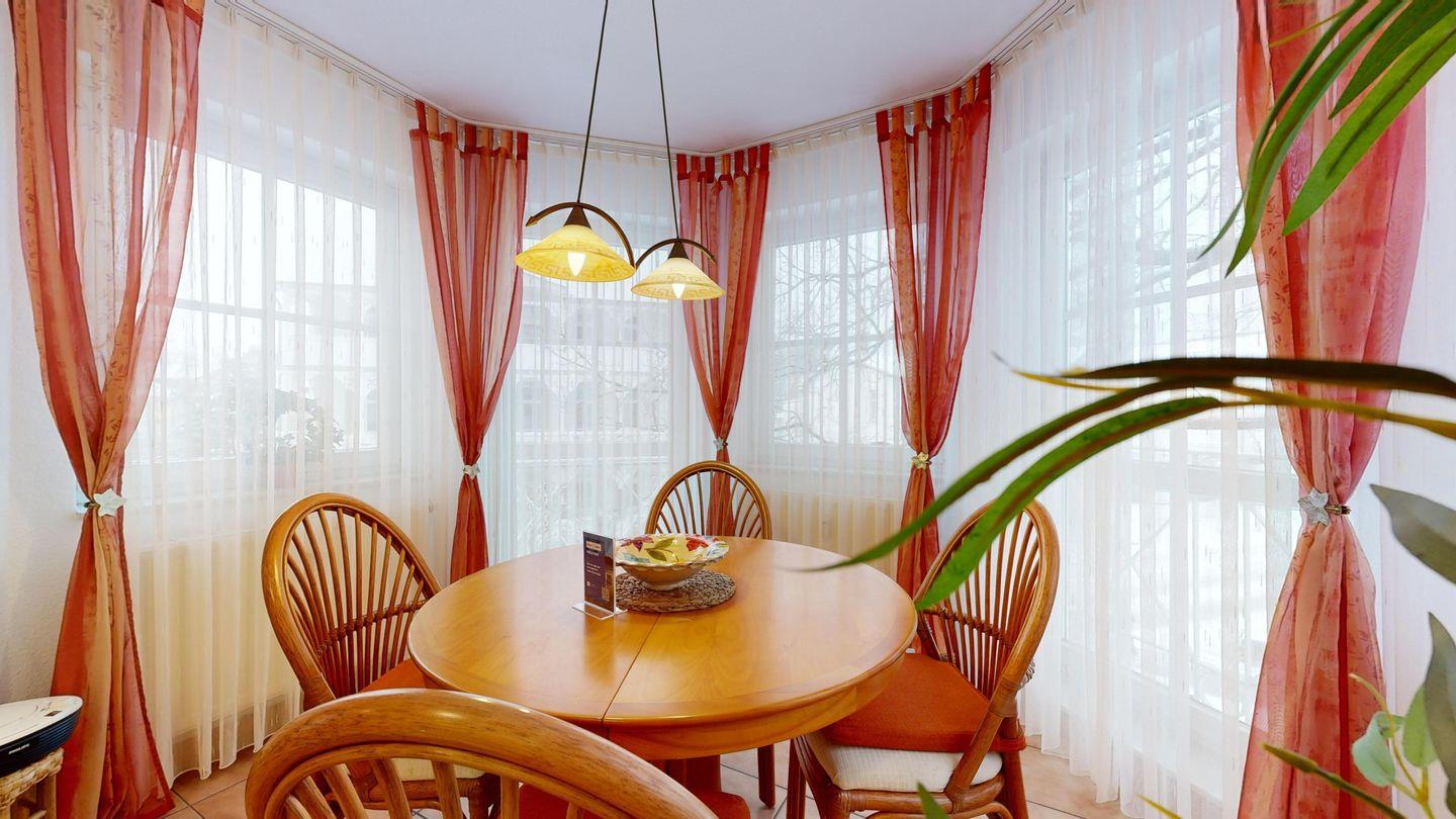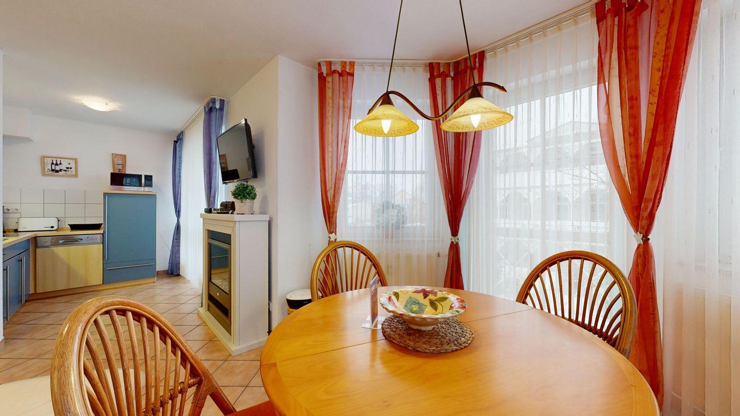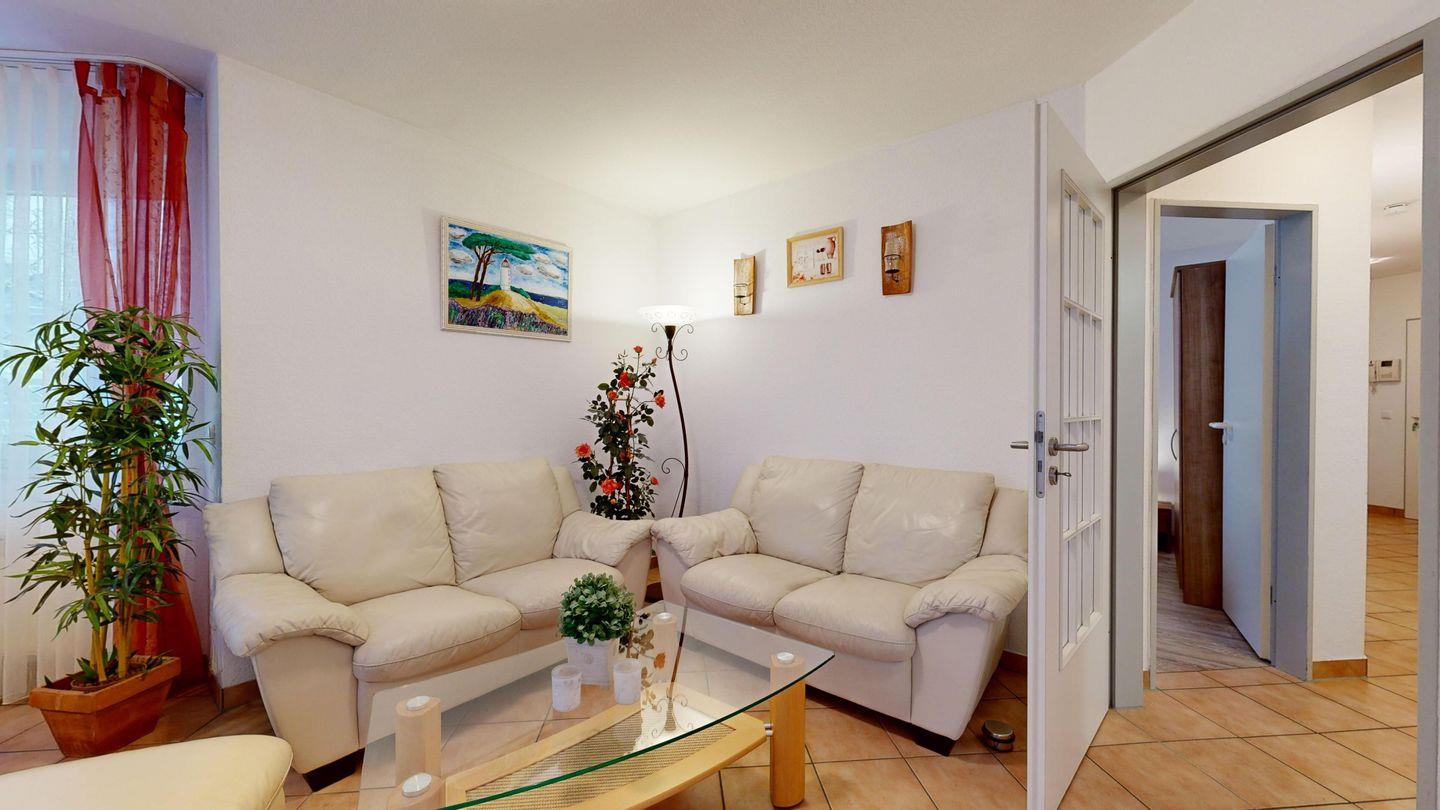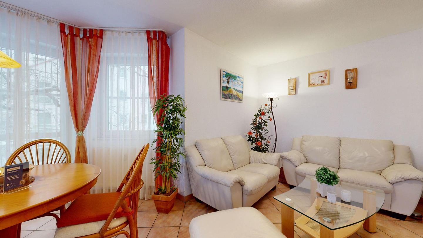 * Wohnzimmer: 2 Ledercouchen, Kabel-TV, Essplatz für 4 Personen im Erker, großer Elektrokamin und WLAN-Internetzugang; Ausgang zum Balkon