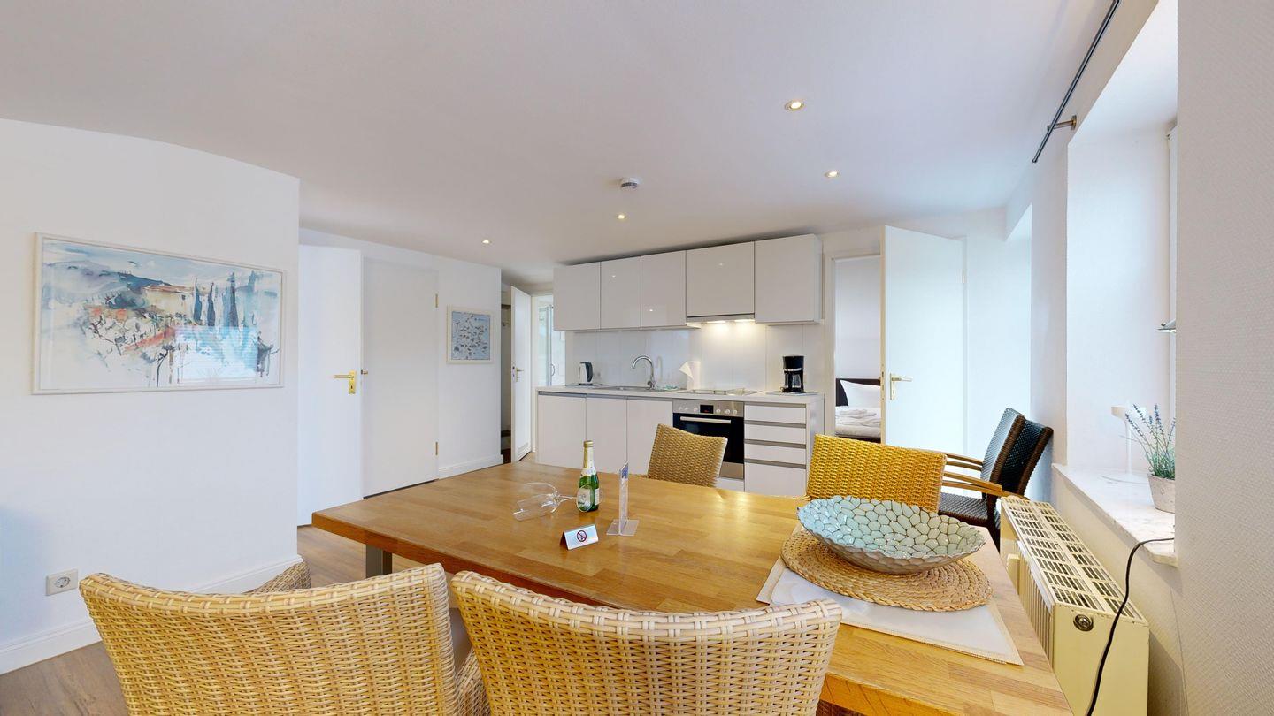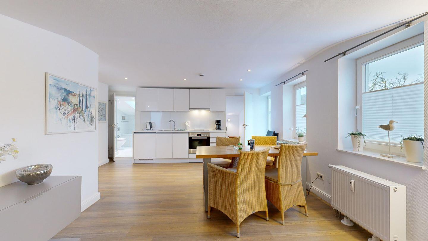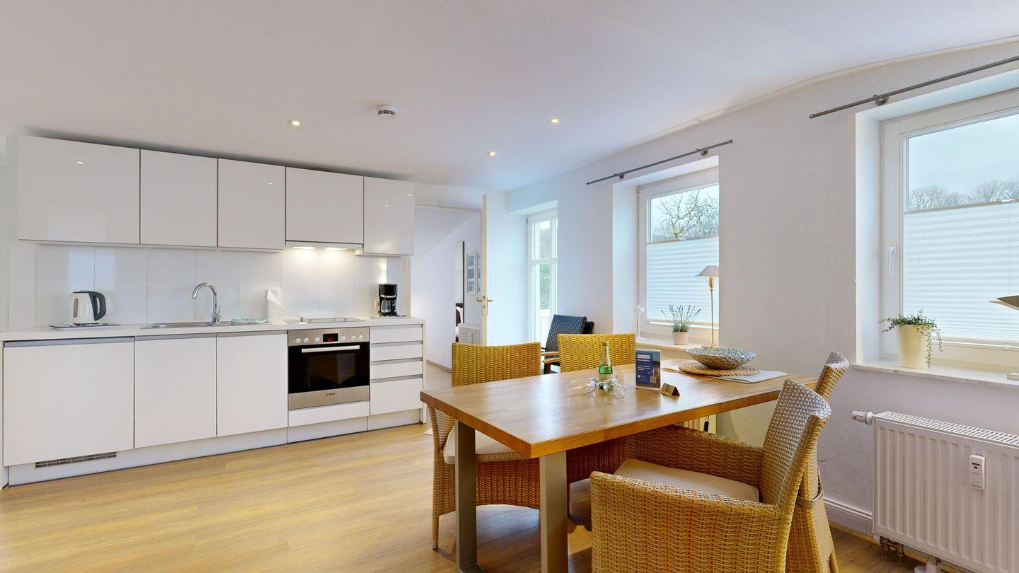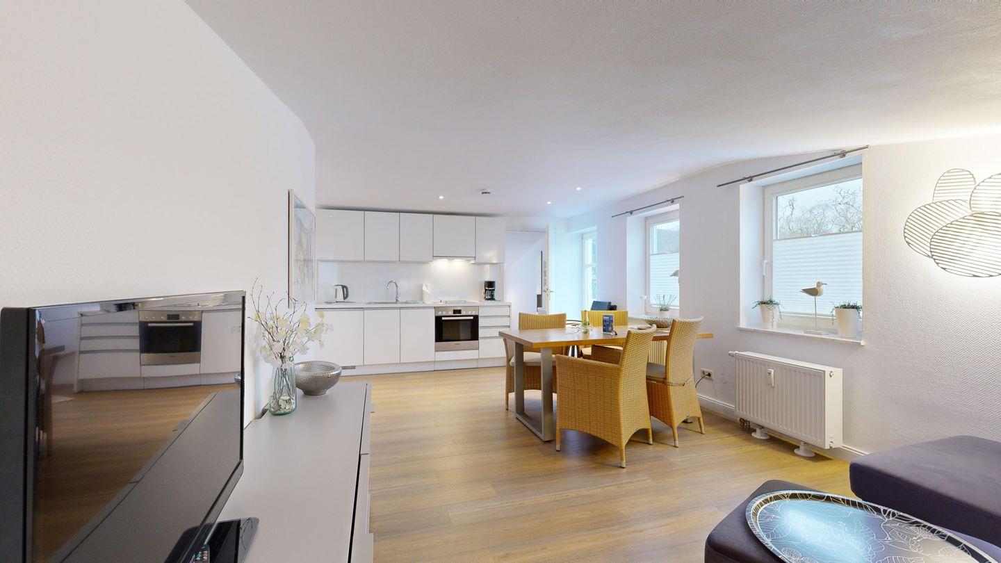 * Wohnzimmer: Moderne Couchgarnitur, Kabel-TV, W-LAN-Internetanschluss, Esstisch mit Blick Richtung Kurmittelhaus, hochwertige Küchenzeile mit Spülmaschine, Ceranherd, Backofen, Wasserkocher, Kaffeemaschine und Toaster