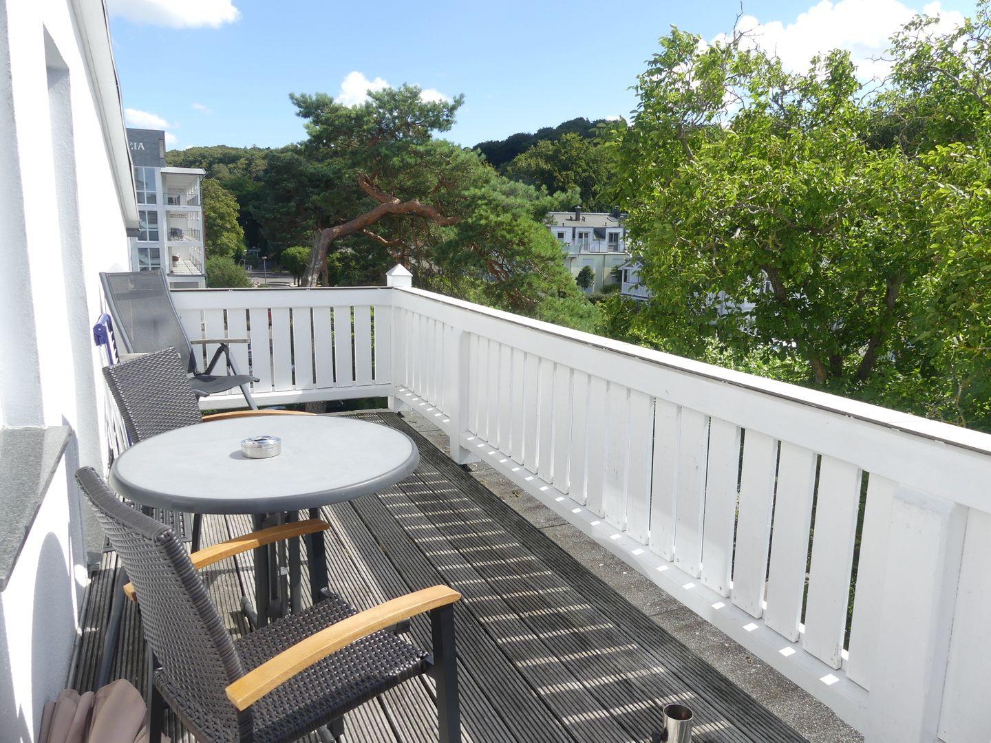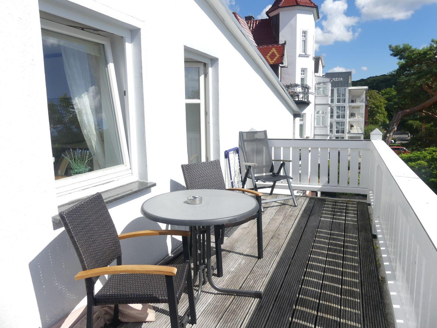 * Balkon zur Südseite mit Balkonmöbeln und Sonnenschirm