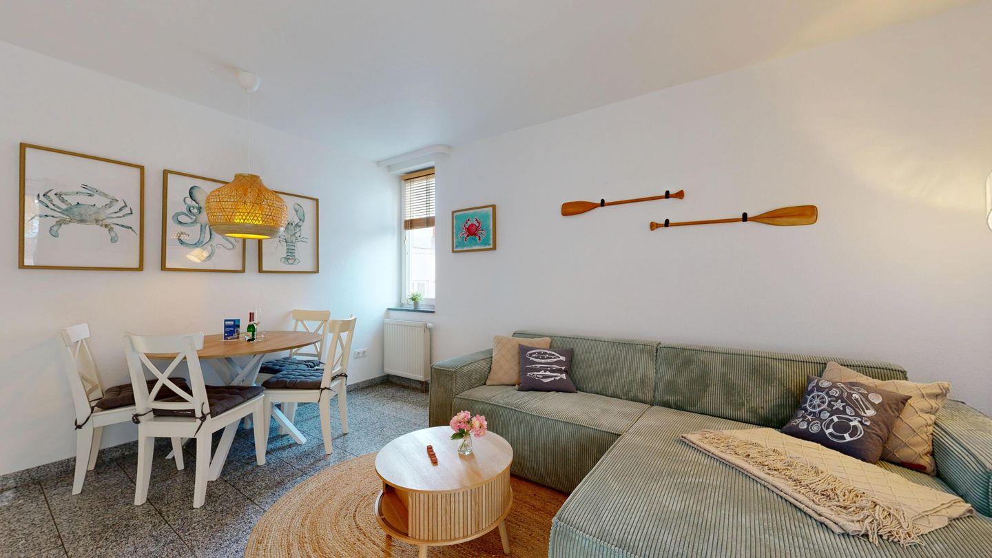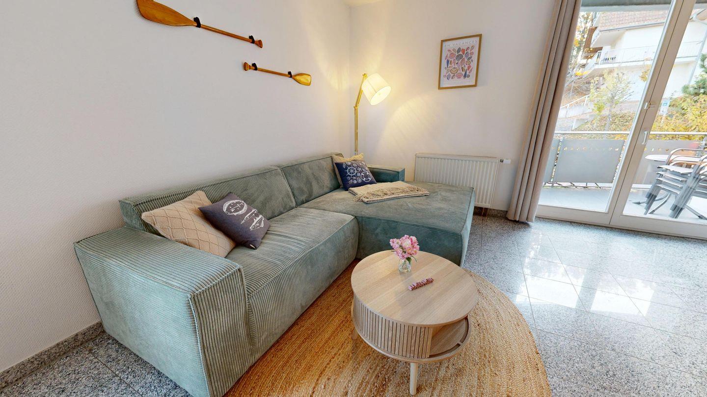 * Wohnzimmer: Couchgarnitur, Kabel-TV, Radio, Schrankbett mit Platz für 1-2 Personen, Essplatz, kostenfreies WLAN