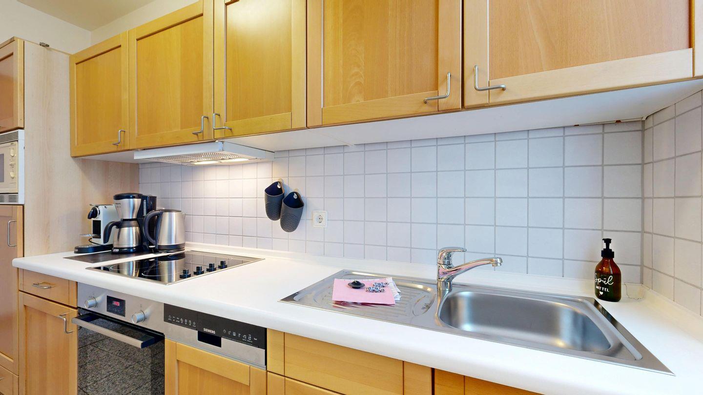* Separate Küche mit moderner Küchenzeile, mit E-Herd, Backofen, Spülmaschine, Kühlschrank mit kleinem Gefrierfach, Mikrowelle, Wasserkocher, Kaffeemaschine, Toaster