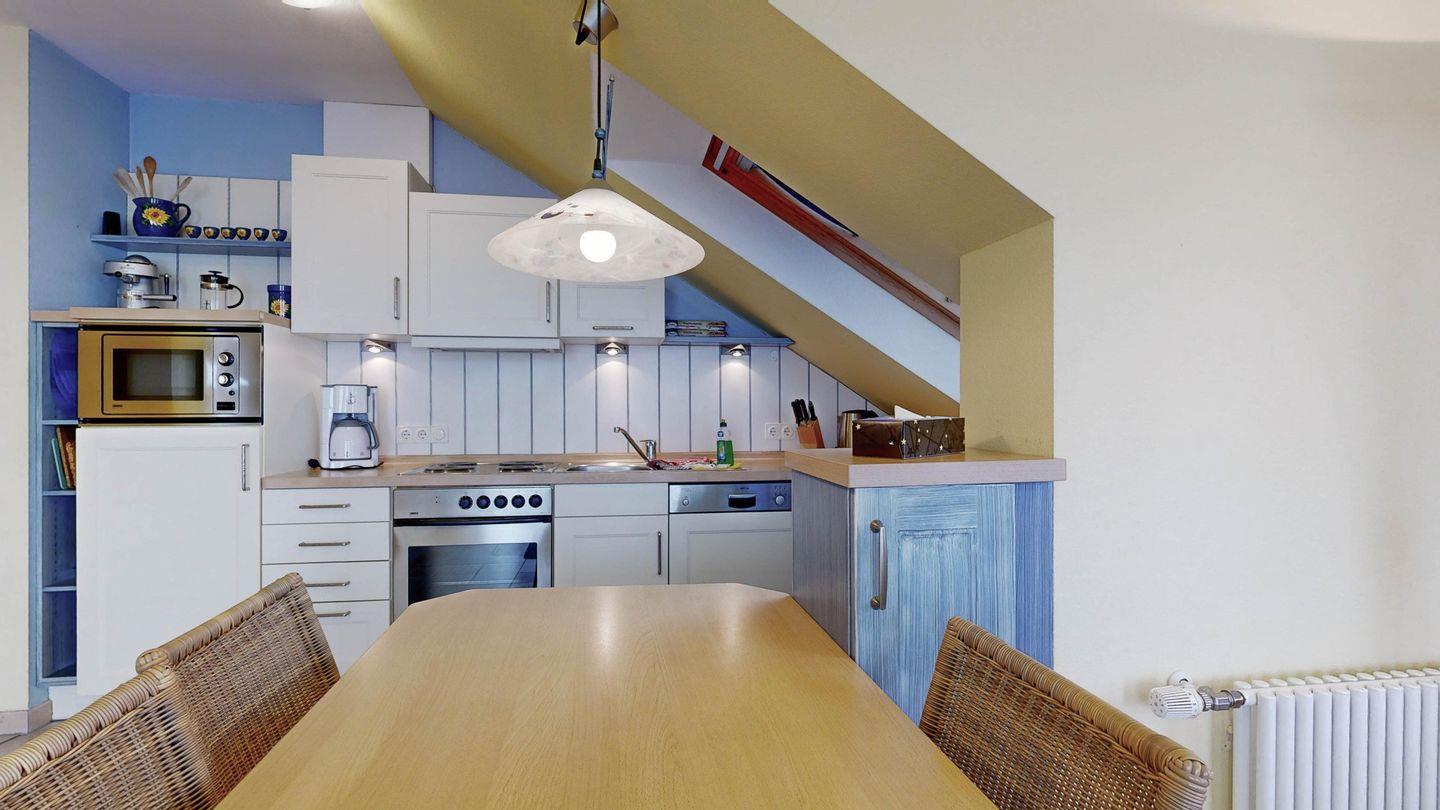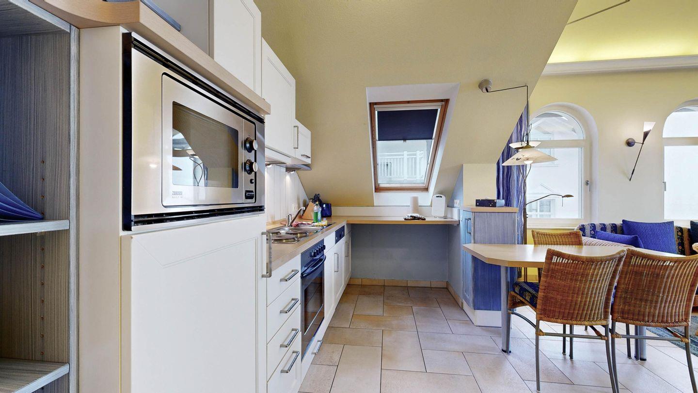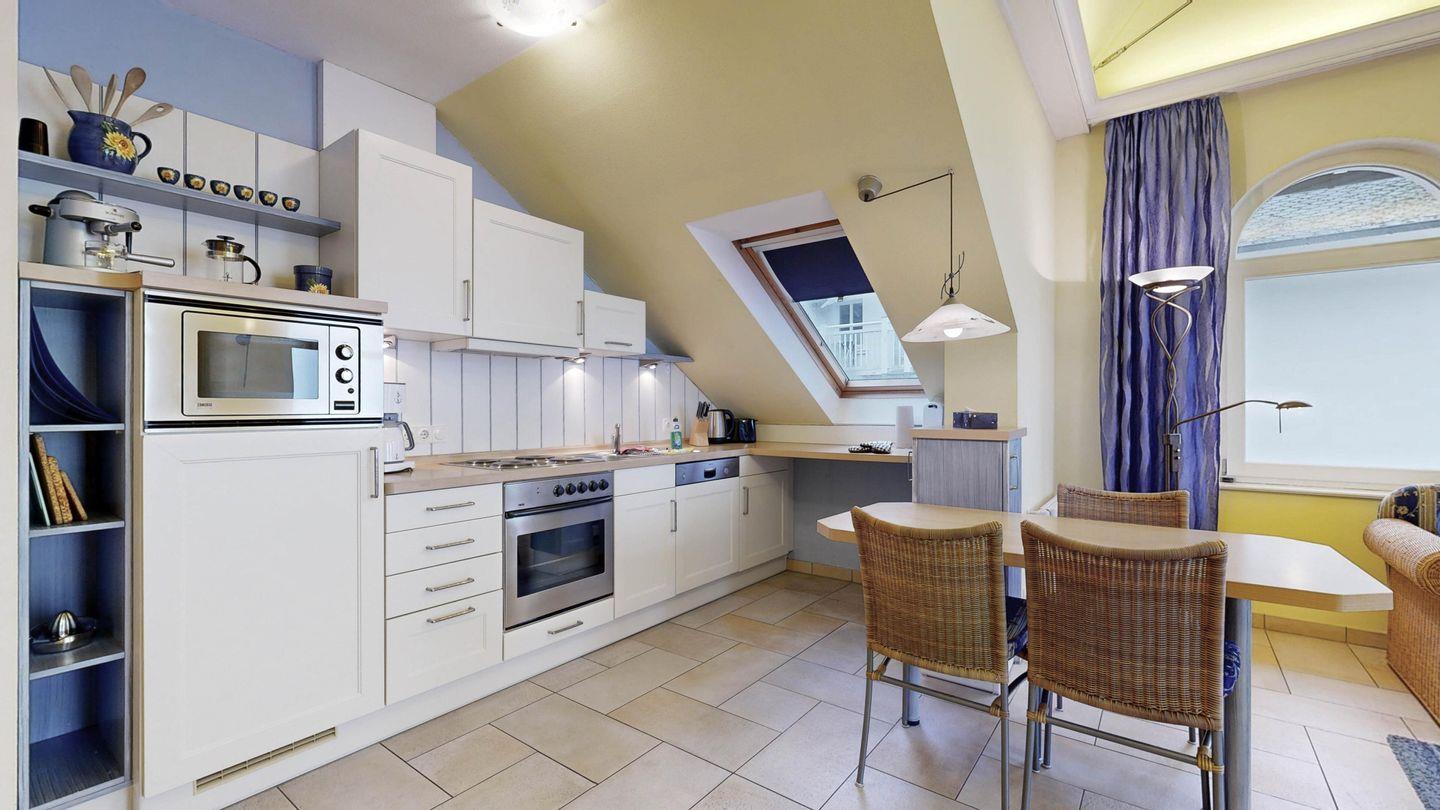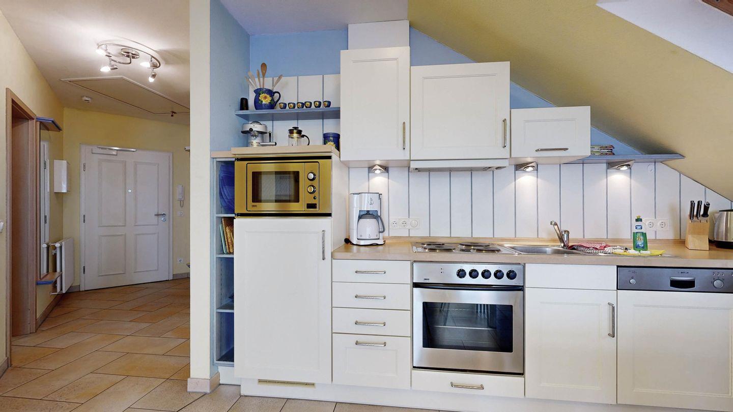 * Küche: Moderne Küchenzeile mit Spülmaschine, E-Herd mit Backofen, Mikrowelle, Essplatz, Wasserkocher, Kaffeemaschine, Toaster