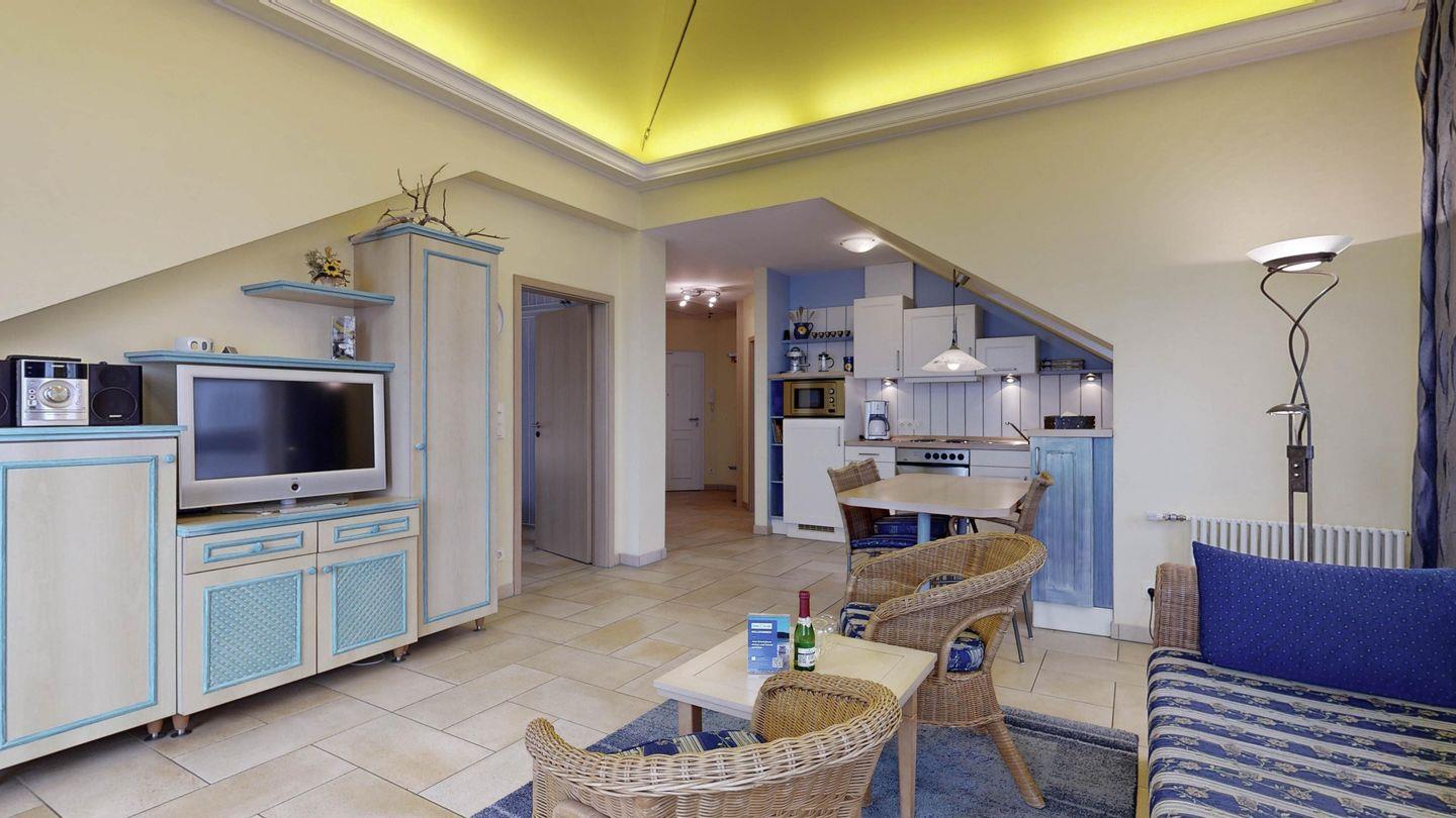* Wohnzimmer: Couchgarnitur, Fernseher und Radio, WLAN-Internetanschluss