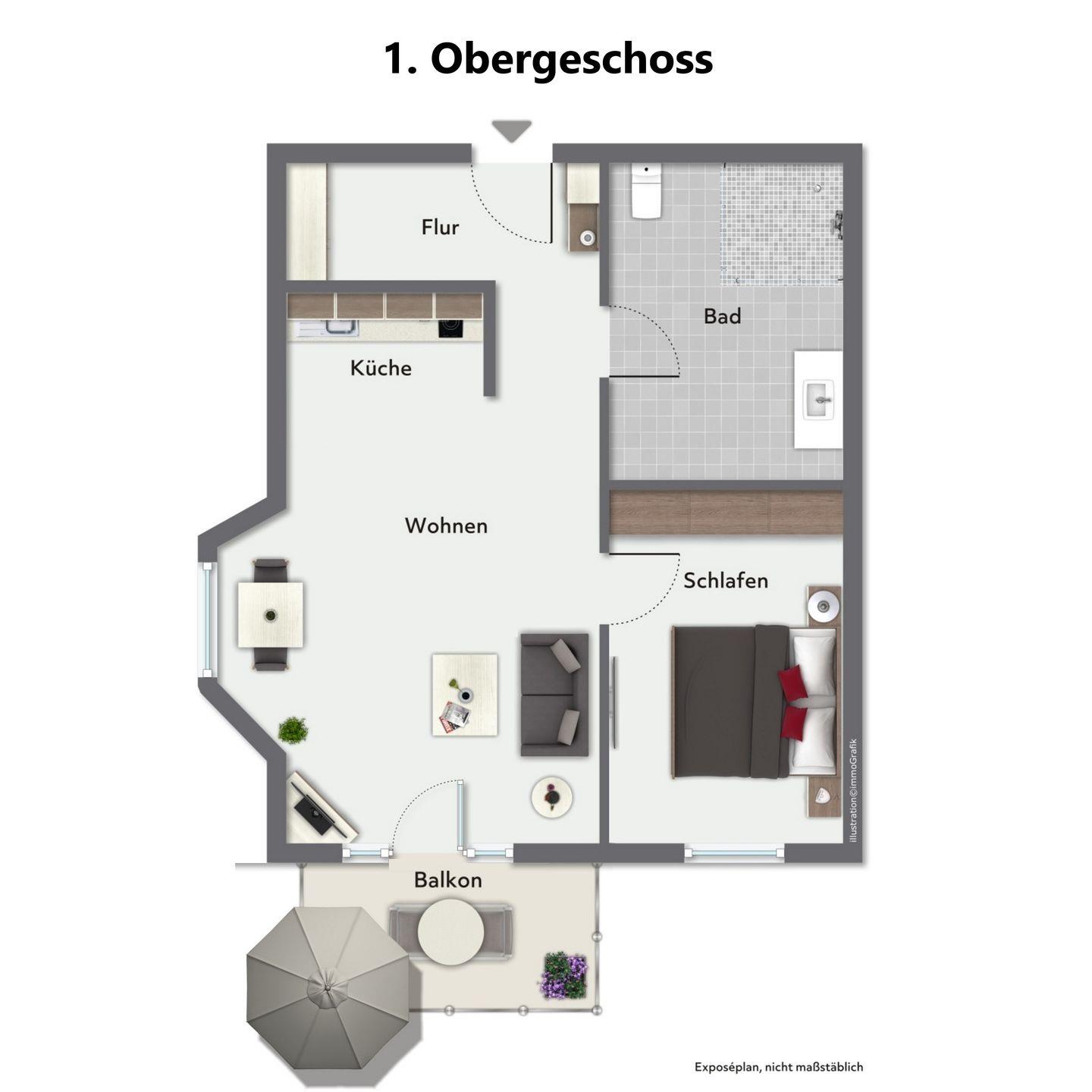 Der Balkon ist mit Gartenmöbeln und einem Sonnenschirm ausgestattet und bietet Dir einen geschützten Platz an der frischen Luft – ideal für ruhige Momente mit einem Buch oder einem Getränk.