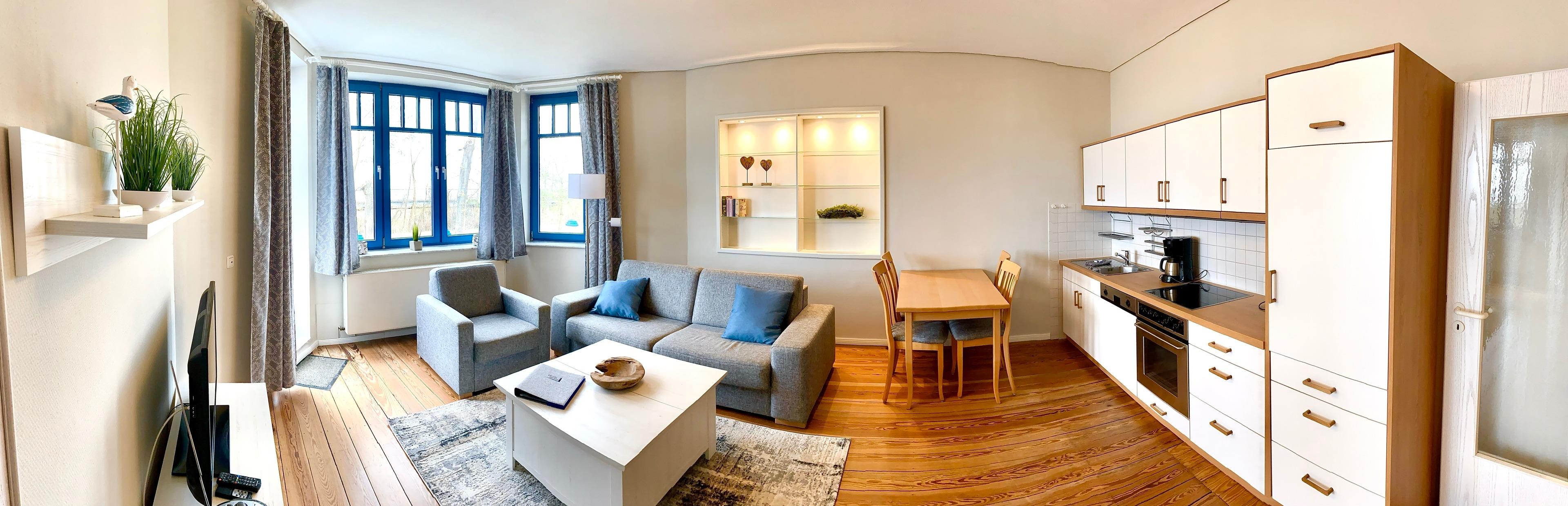 Das gemütlich eingerichtete Wohnzimmer mit ausklappbarer sehr hochwertiger Schlafcouch ( eingebaute Matratze mit Lattenrost ) , Satelliten-TV, kostenlosem WLAN- Anschluß & kleiner Audio-Kompaktanlage läßt sich einen schnell wie zu Hause fühlen. Die große Kochküchenzeile in Verbindung mit dem Wohnraum verfügt über einen Backofen mit integrierter Mikrowelle, Spülmaschine, Kaffeemaschiene, Toaster, Wasserkocher, Geschirr und Esstisch. Der Sanitärbereich mit Dusche/WC, die Diele mit Einbauschrank und die 10m² große Meerseitige Lounge Terrasse runden das positive Gesamtbild der Ferienwohnung ab.