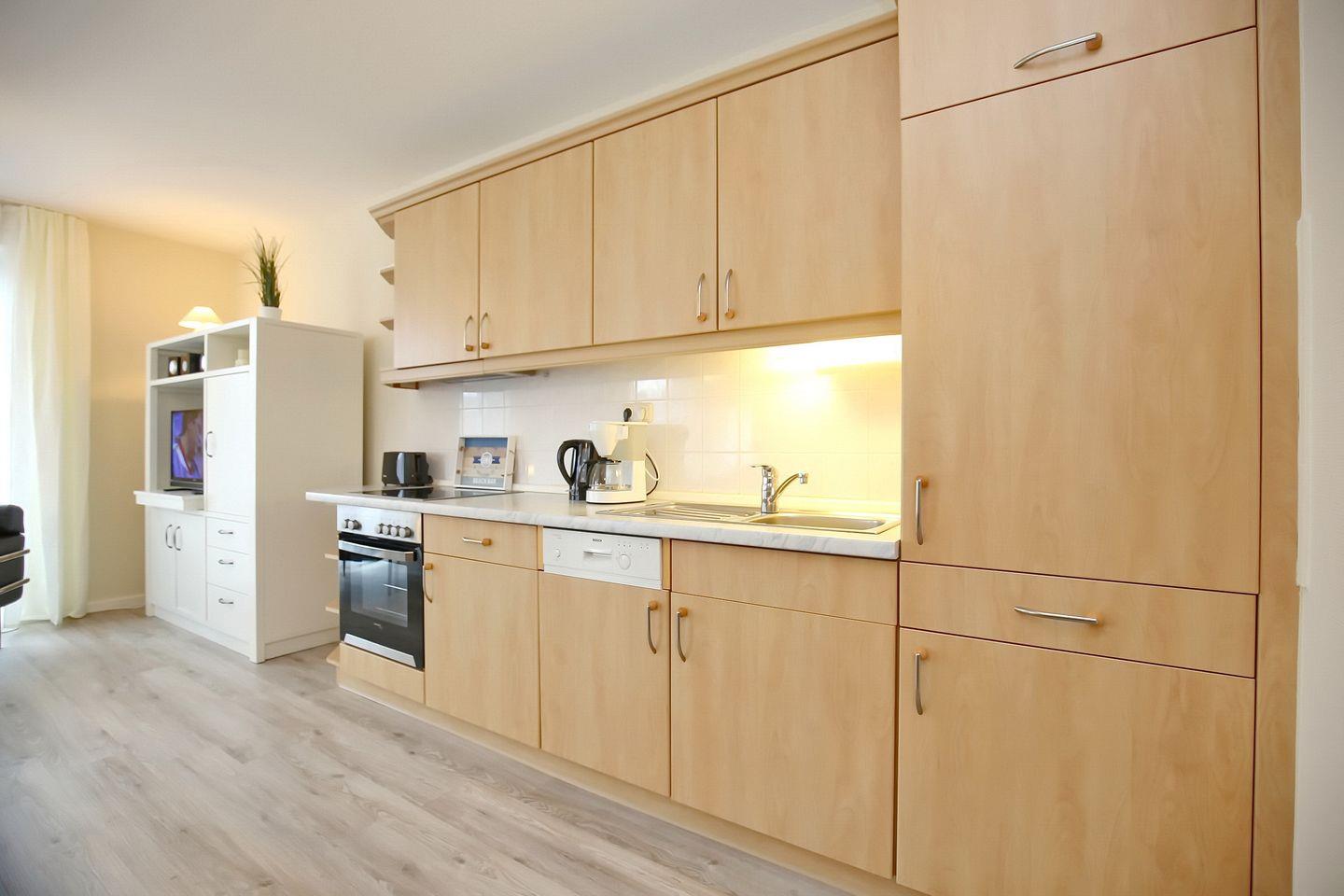 In der modernen Küchenzeile verfügst du neben einem Einbauherd mit einem 4-Platten-Cerankochfeld und Backofen, über eine Dunstabzugshaube, Kühlschrank mit Gefrierfach, diverse Küchengeräte, Mikrowelle und Geschirrspüler. In der gegenüberliegenden Essecke kannst du die gemeinsamen Mahlzeiten einnehmen oder in gemütlicher Runde einen Spieleabend verbringen.