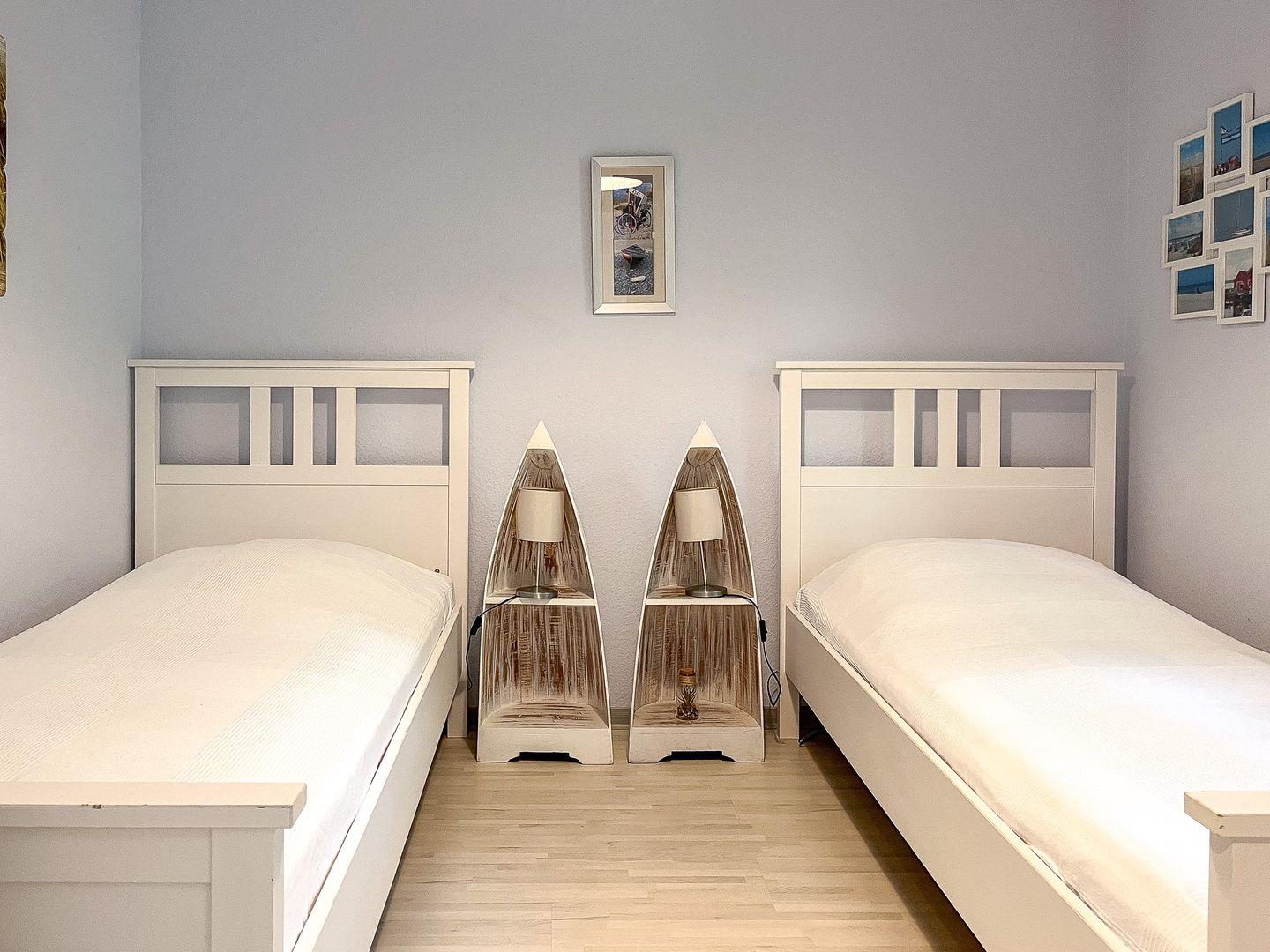 Im Schlafzimmer im Erdgeschoss stehen dir zwei Einzelbetten (90 x 200 cm) und ein Kleiderschrank zur Verfügung. Im zweiten Schlafzimmer, im 1.Obergeschoss, findest du ein Doppelbett (2 x 90 x 200 cm), einen geräumigen Kleiderschrank, einen Arbeitsplatz für deine Urlaubspost und einen weiteren TV vor. Das Gäste-WC befindet sich auch im Obergeschoss.