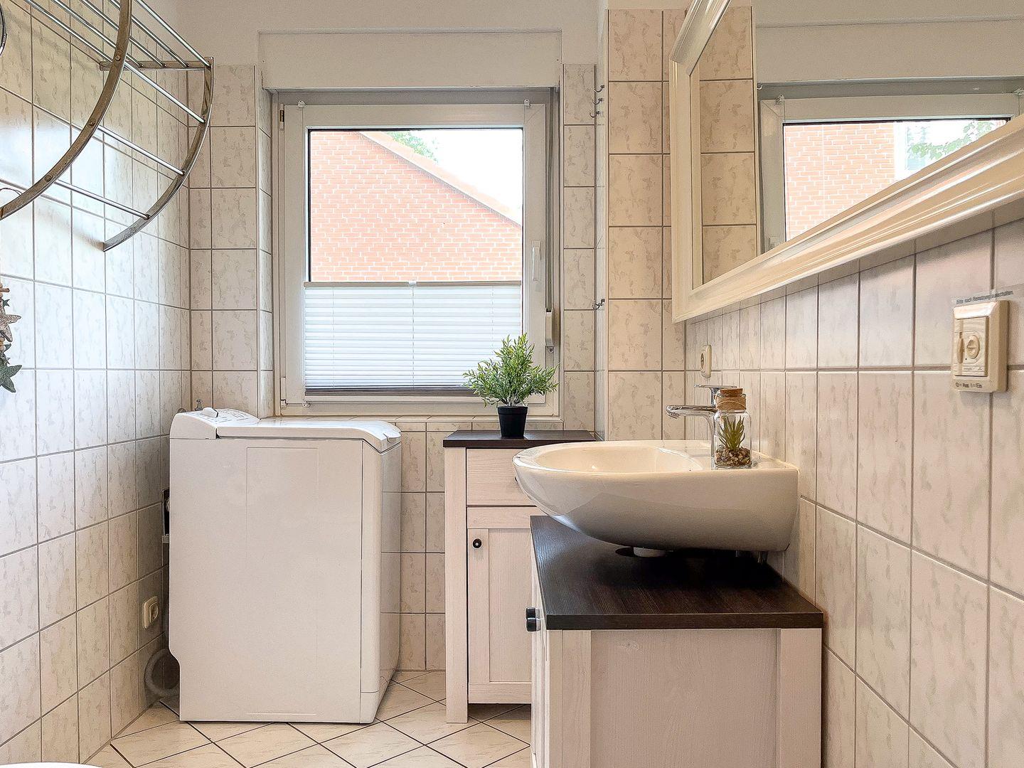 Ein gefliestes Duschbad mit Fußbodenheizung findest du im Erdgeschoss. Eine Waschmaschine sowie ein Fön sind vorhanden. Für die kleinen Gäste befindet sich ein Kinderbett im Ferienhaus. Als Bodenbelag wurden im Wohnbereich und im Flur Fliesen, in den Schlafräumen Laminat gewählt. Das Haus ist mit Rollläden ausgestattet und in den Schlafzimmern, sowie Wohnzimmer, befinden sich Fliegenschutzgitter. Ein Bügelbrett und ein Bügeleisen sind vorhanden.