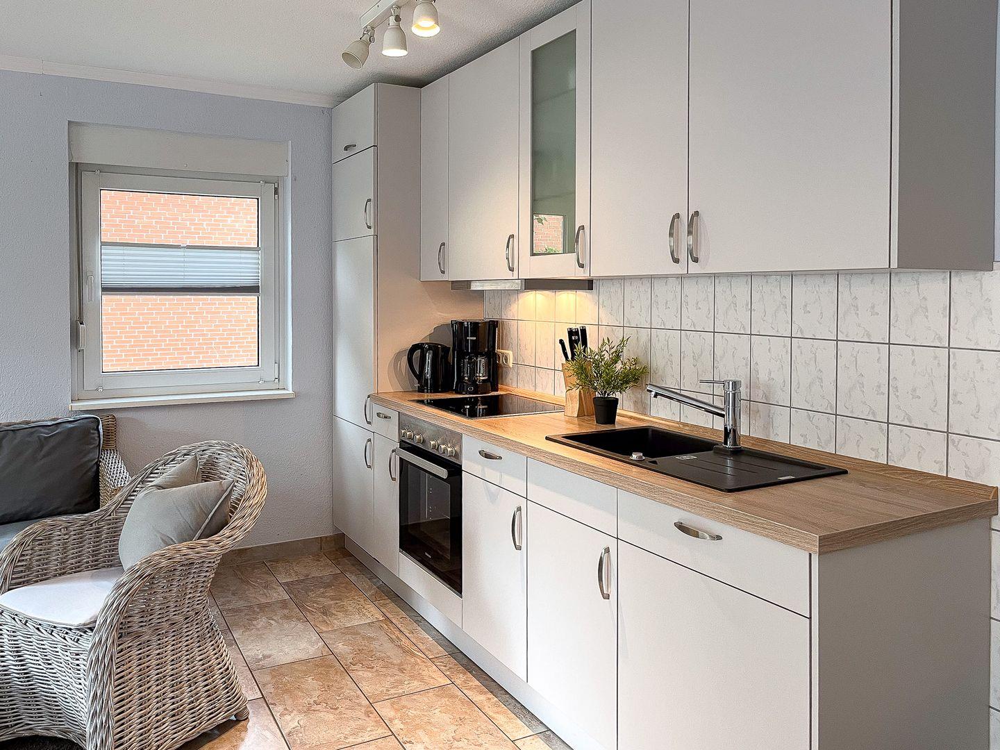 Die voll ausgestattete Küchenzeile verfügt u.a. über einen Geschirrspüler, ein 4-Platten-Cerankochfeld mit Backofen, einen Kühlschrank mit Gefrierfach und eine Mikrowelle. Auch der Essbereich mit Esstisch und Stühlen befindet sich im Wohnbereich.