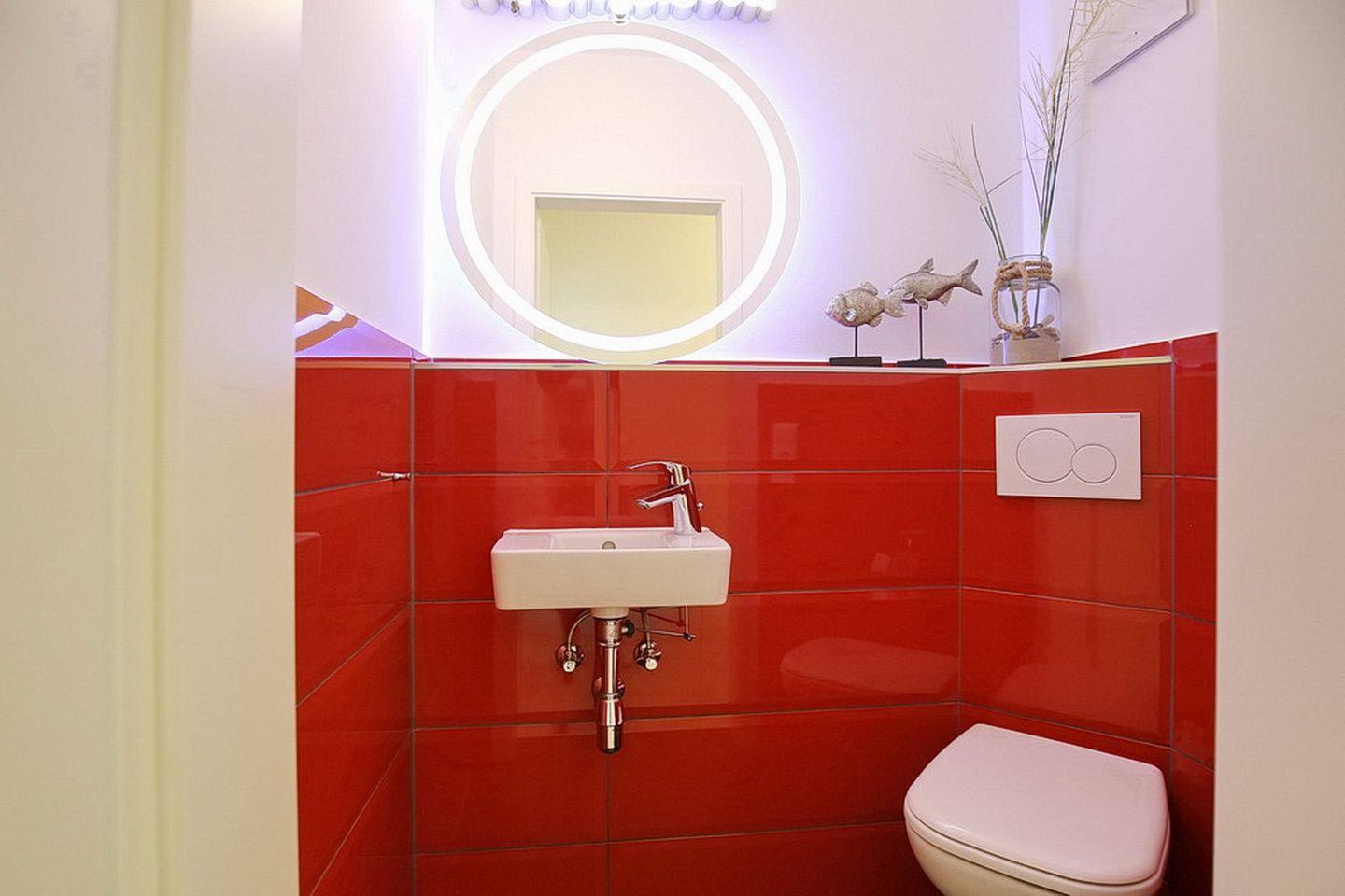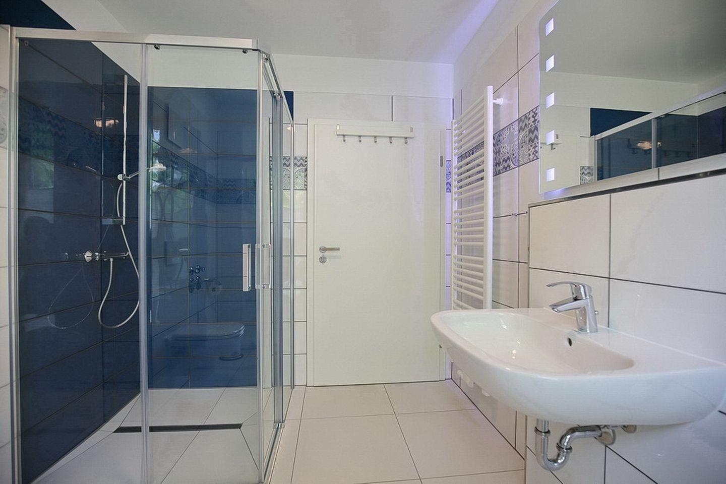 Das stilvolle Bad ist hell gefliest und mit einem Waschtisch, einer bodengleichen Dusche, einem WC sowie einem Handtuchheizkörper ausgestattet. Zusätzlich ist ein Gäste-WC vorhanden.