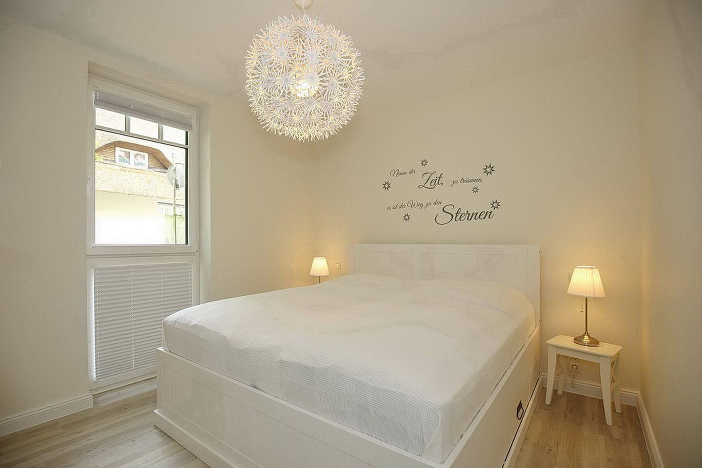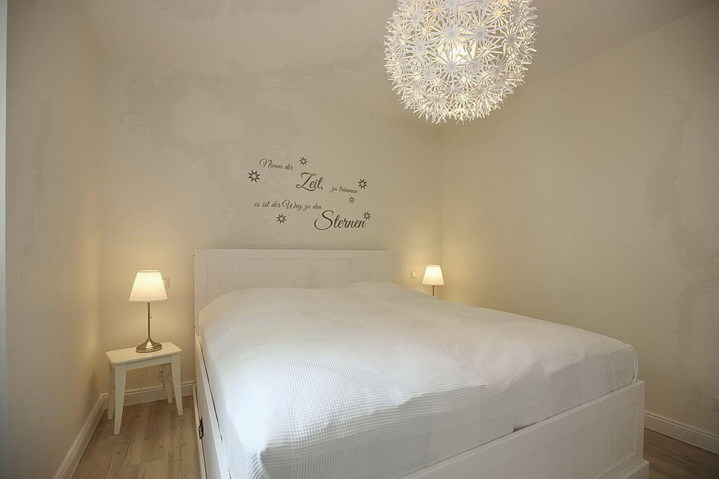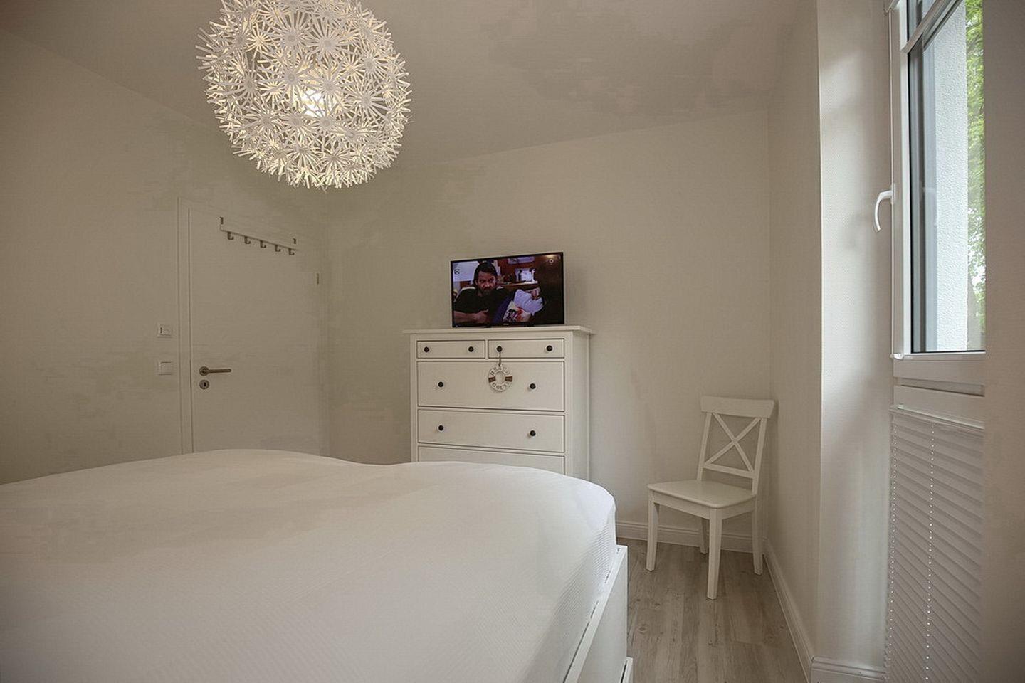 Das Schlafzimmer erreichst du über den Flur. Hier gibt es ein komfortables Doppelbett (2 x 90 x 200 cm). Die Aufbewahrung deiner Kleidung ist kein Problem, da das Schlafzimmer über einen großräumigen Kleiderschrank verfügt. Auch einen zusätzlichen Flachbildfernseher kannst du nutzen. Selbstverständlich können die Fenster mit Plissees verdunkelt werden.
