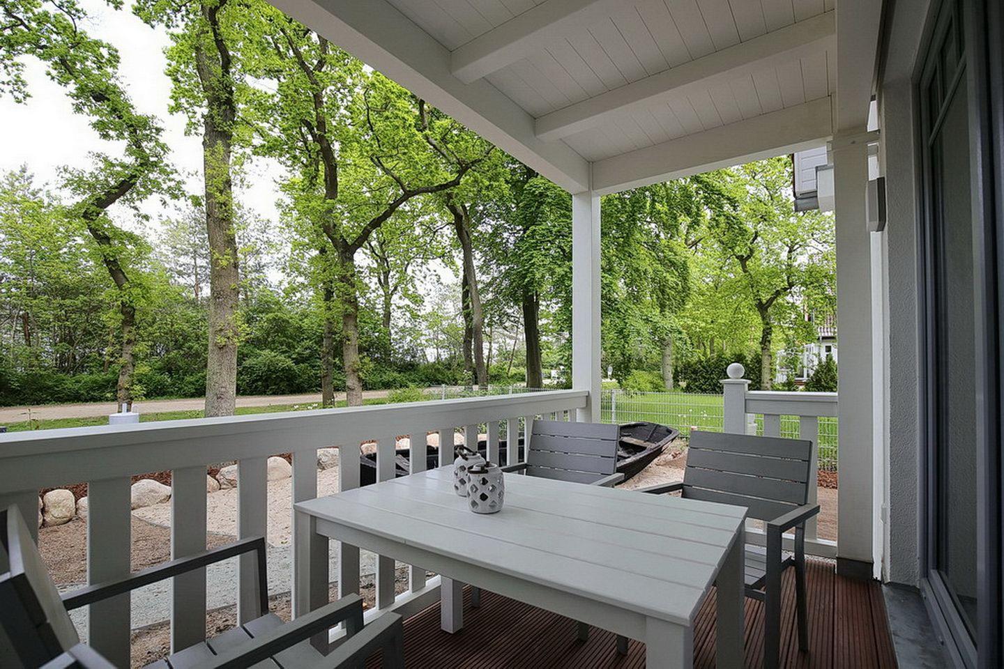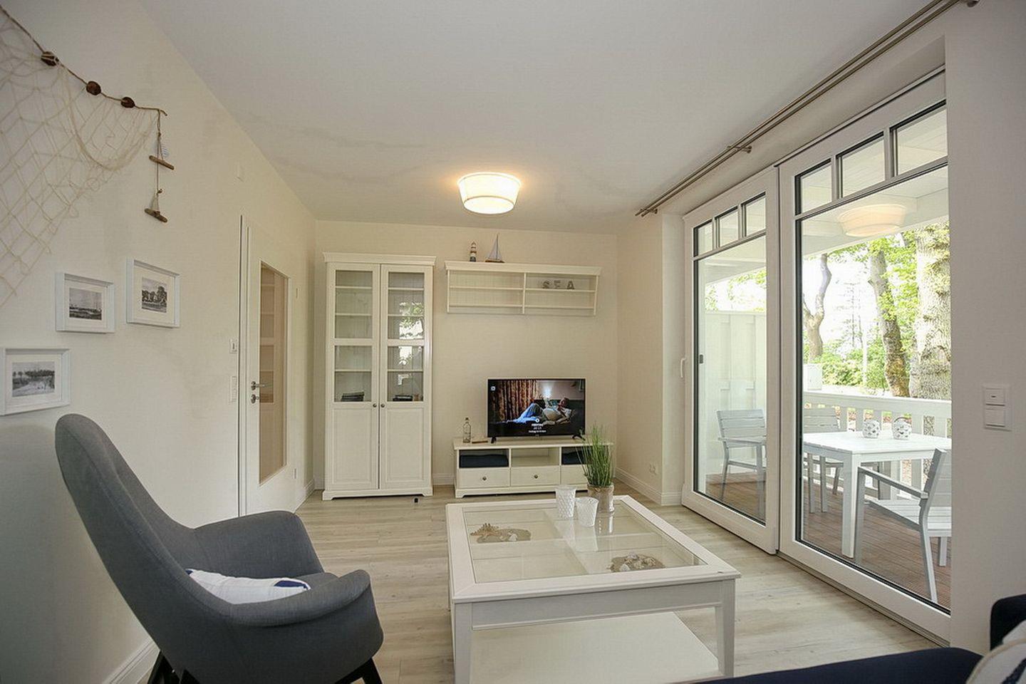Das Wohnzimmer lädt dich zum Wohlfühlen und Entspannen ein. Bodentiefe Fensterelemente bieten dir ein großzügiges Wohngefühl. Neben der Standardausstattung des Wohnzimmers, wie zum Beispiel einer Schlafcouch (180 x 200 cm), ist selbstverständlich ein Fernseher vorhanden. Die Couch ist ausklappbar und kann als weitere Schlafmöglichkeit für 2 Personen genutzt werden. Zur Verdunklung dienen Vorhänge und Plissees. Vom Wohnzimmer gelangst du auf den Balkon, der zur Seeseite ausgerichtet ist. Vom Balkon aus gelangst du in den Garten des Grundstücks. Besonders Kinder werden das Boot, das hier liegt, lieben.