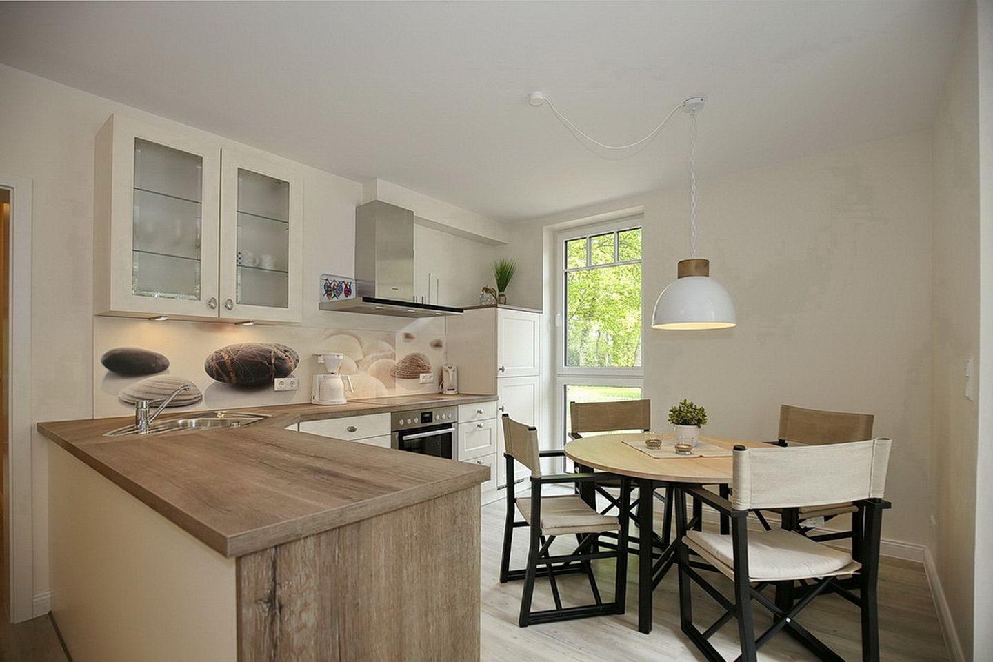 Direkt vom Hausflur gelangst du in die Küche. Die moderne Einbauküche lässt keine Wünsche offen. Es ist alles vorhanden, was du zur Zubereitung der Mahlzeiten benötigst. Dazu zählen ein Herd mit 4 Cerankochfeldern sowie Backofen, ein Kühlschrank mit Gefrierfach, eine Geschirrspülmaschine, ausreichend Geschirr und Gläser und vieles mehr. Die gemeinsamen Mahlzeiten kannst du an einer gemütlichen Essecke einnehmen. Genieße auf dem Südbalkon, den du von der Küche aus erreichst, die Nachmittagssonne. Auf dem Balkon kannst du den vorhandenen Elektrogrill (Tischgrill) nutzen.