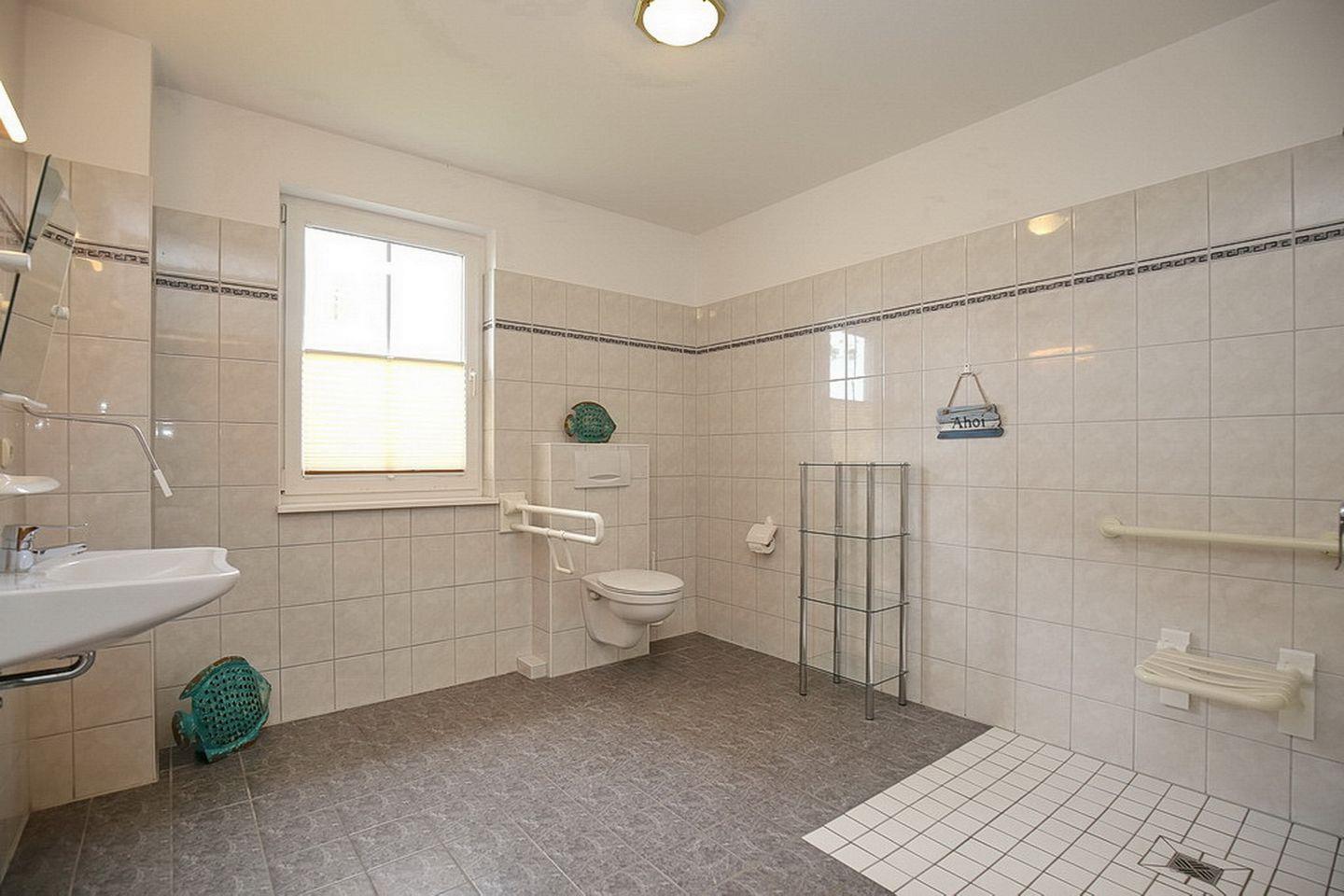 Das geräumige, geflieste Duschbad bietet genügend Platz für Rollstuhlfahrer - Dusche und WC sind dementsprechend ausgestattet. Die Strandvilla Krabbe (Whg. 1-7) und das dazugehörige Gästehaus (Whg. 8-15), mit direktem Strandzugang, verfügen über einen Freistellplatz und kostenfreie WLAN-Nutzung (ohne Gewähr).