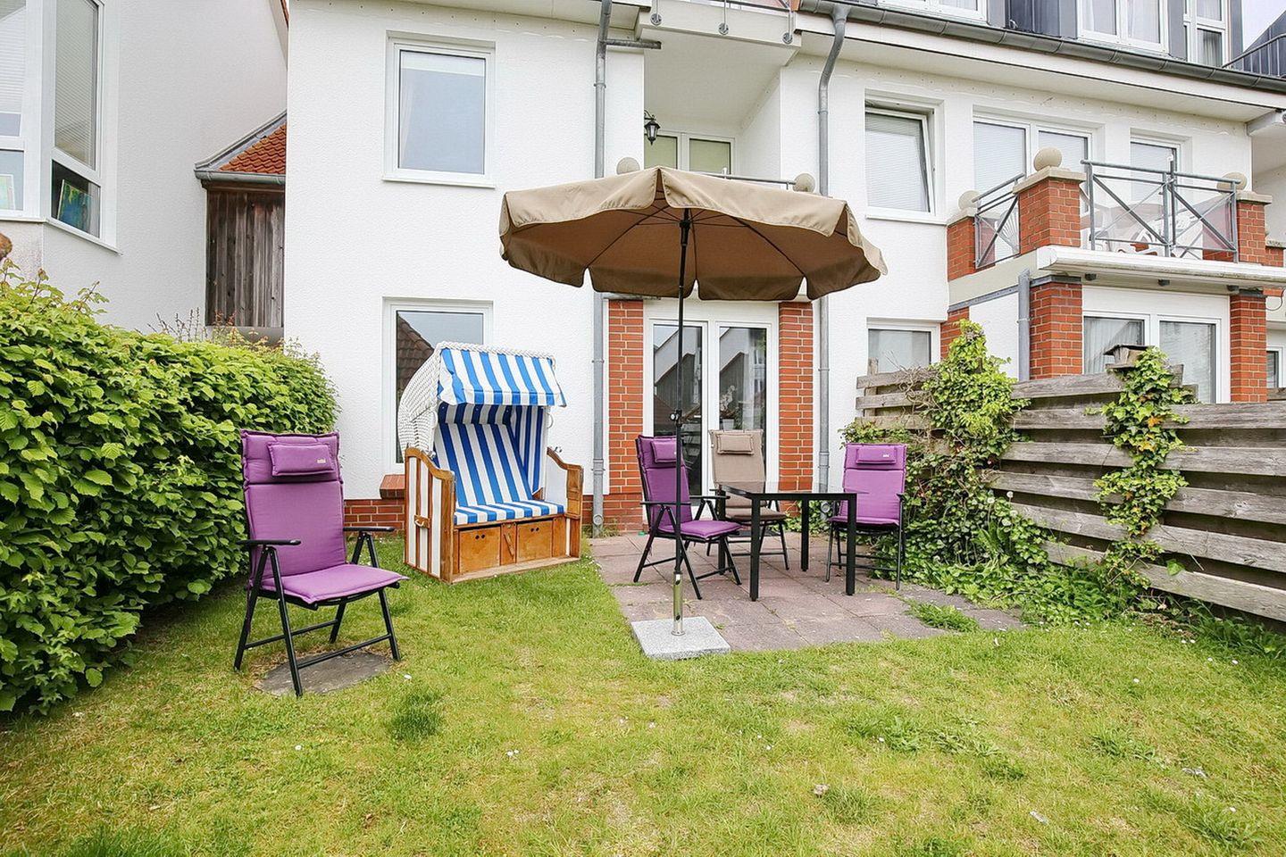 Direkt vor der Wohnung befindet sich der dazugehörige PKW-Stellplatz. Fahrräder können an einem Fahrradbügel am Haus oder im Schuppen abgestellt werden. Die Ferienanlage Sünnslag liegt eingebettet zwischen der Kastanienallee und begrünten, ruhigen Seitenstraßen. Einkaufsmöglichkeiten sind nur ca. 200 m entfernt.
