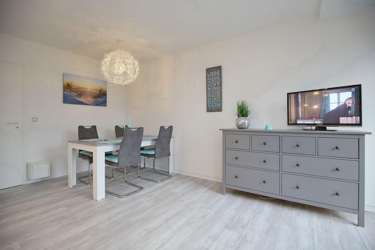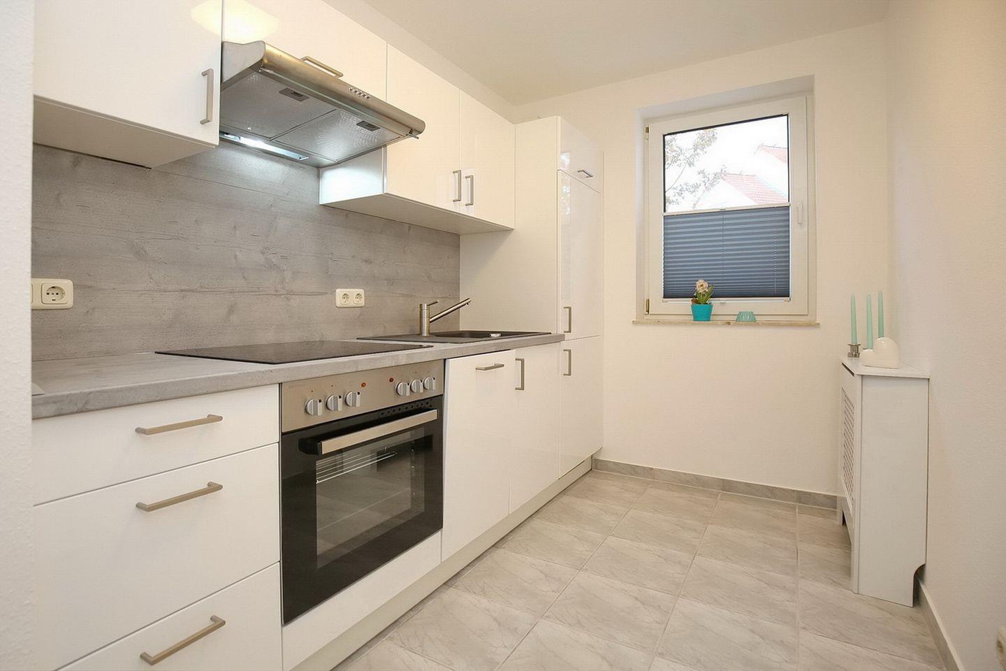 Die neue Küche der Ferienwohnung beinhaltet einen Kühlschrank mit Gefrierfach, ein Ceran-Kochfeld mit Backofen und ein Geschirrspüler. Ein gemütlicher Essplatz für 4 Personen erwartet dich im Wohnzimmer.