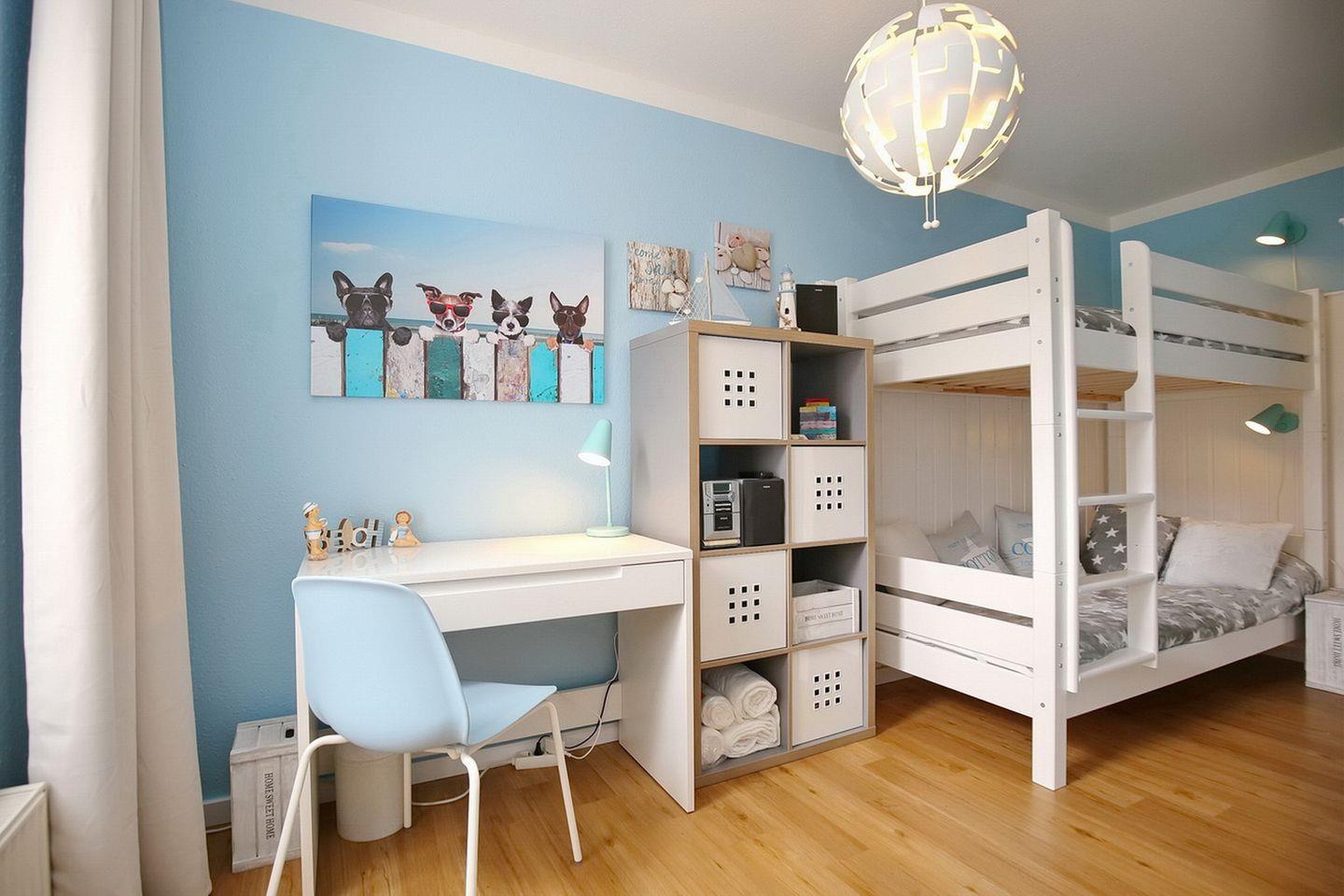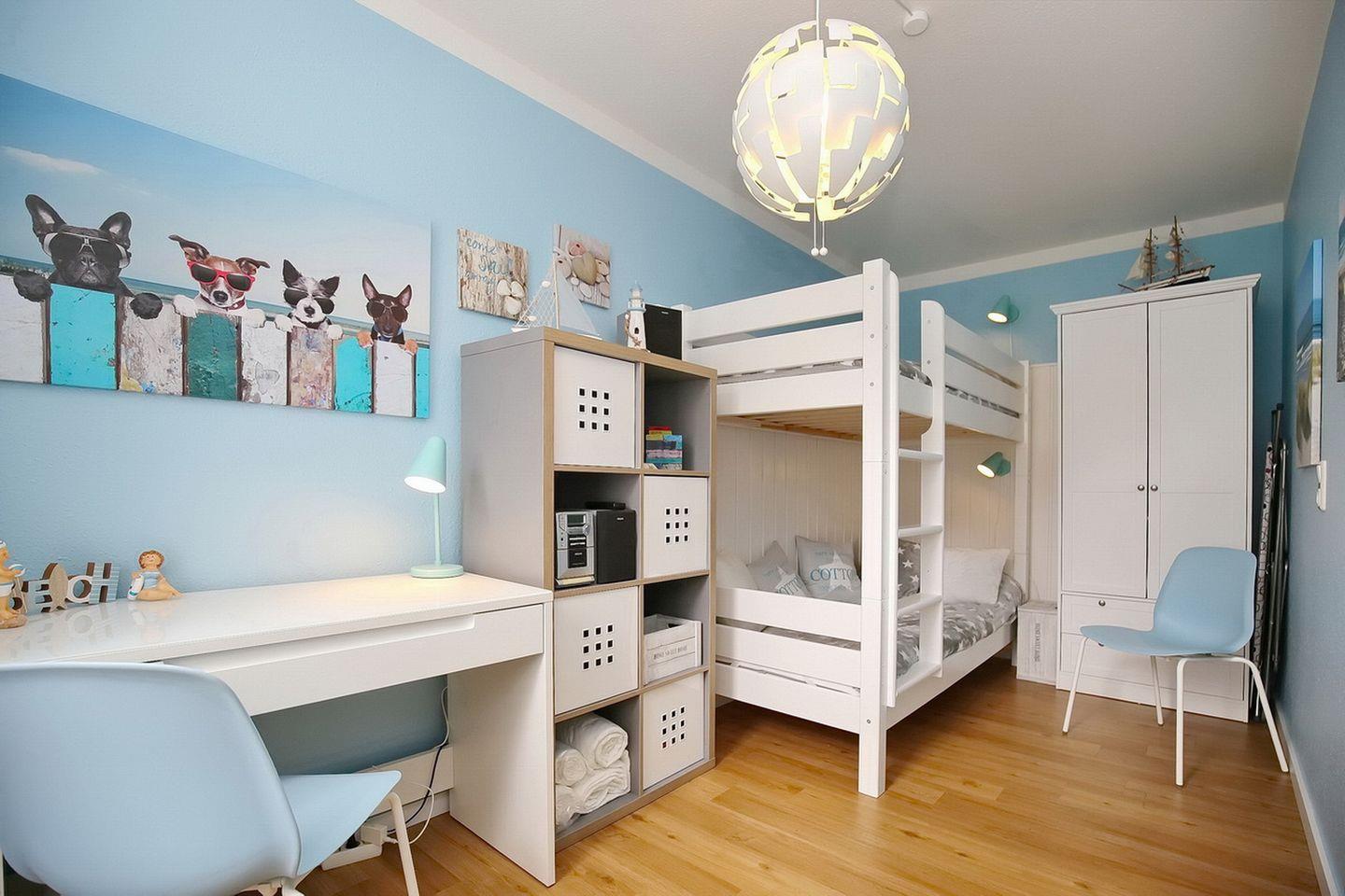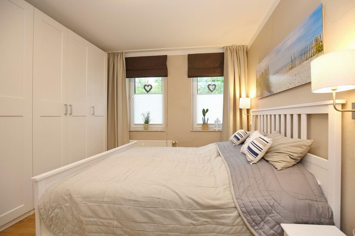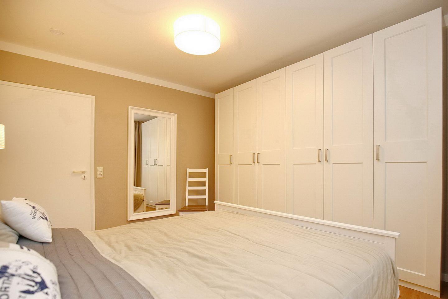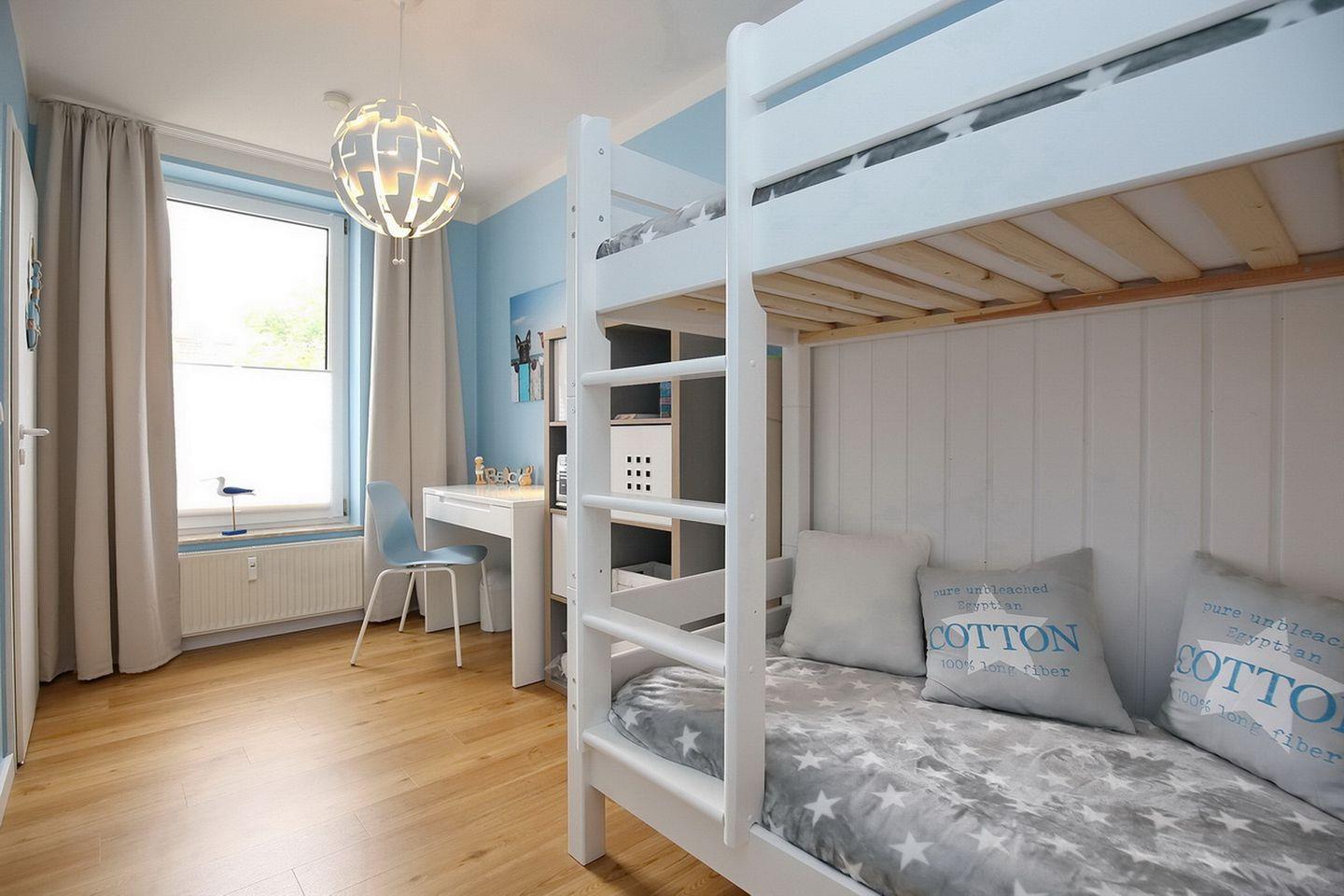 Das erste Schlafzimmer verfügt über ein Doppelbett (2 x 90 x 200 cm). Der zweite Schlafraum ist mit einem Etagenbett (2 x 80 x 200 cm) gestaltet und als Bodenbelag wurde Vinyl gewählt. Zu beiden Zimmern gehört jeweils ein Kleiderschrank. Die Fenster werden mit Rollos, Plissees und Vorhängen verdunkelt.
