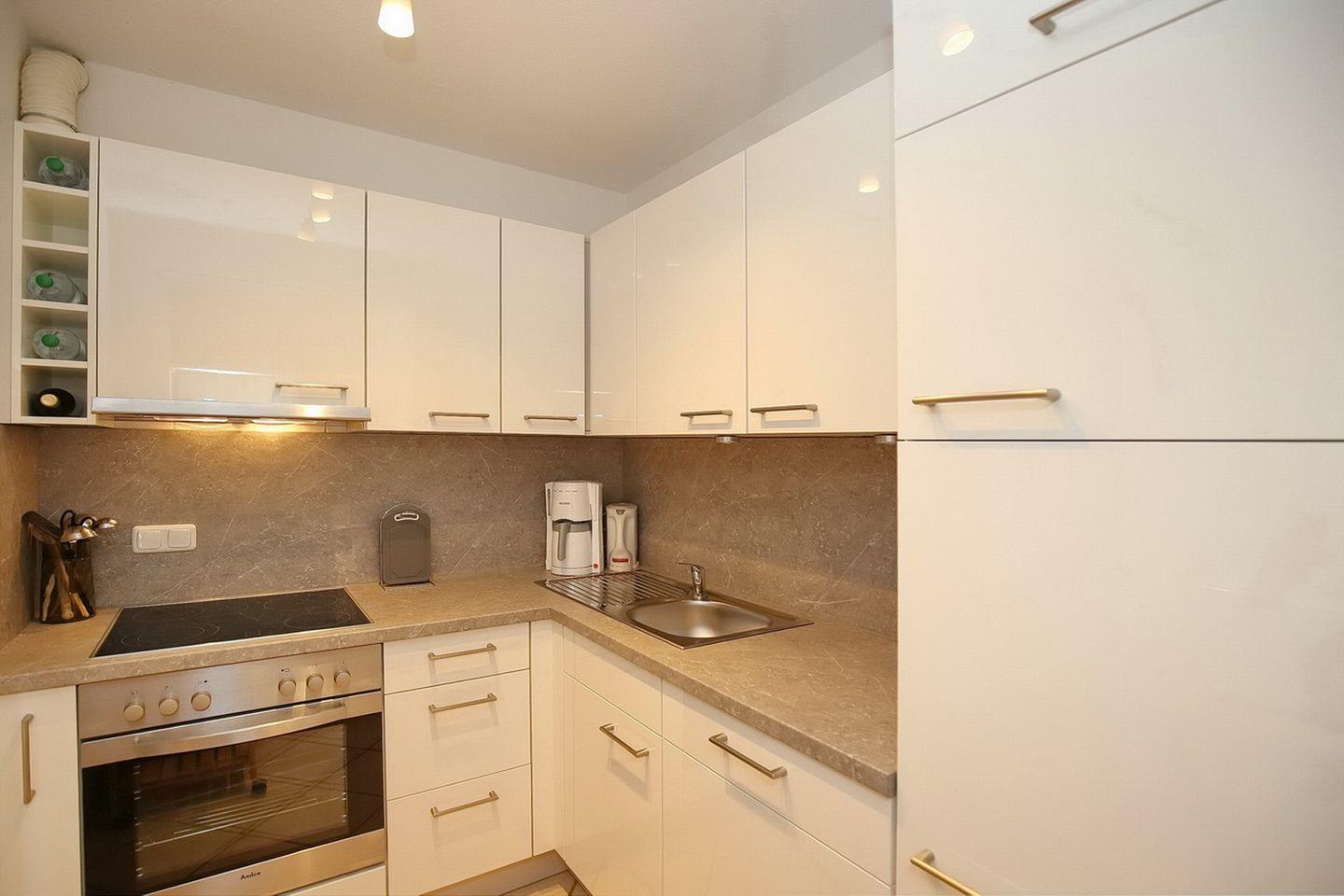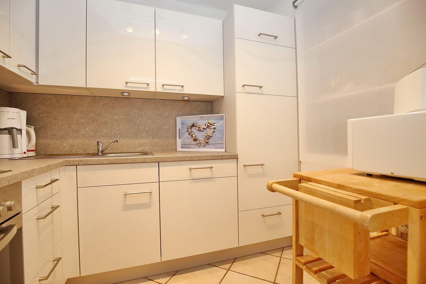 Die Küche liegt separat. Hier kannst du einen Geschirrspüler, ein Cerankochfeld mit Backofen, einen Kühlschrank mit Gefrierfach und eine Mikrowelle für die Zubereitung der Mahlzeiten nutzen. Der Bodenbelag wurde im Küchenbereich mit Fliesen ausgelegt.