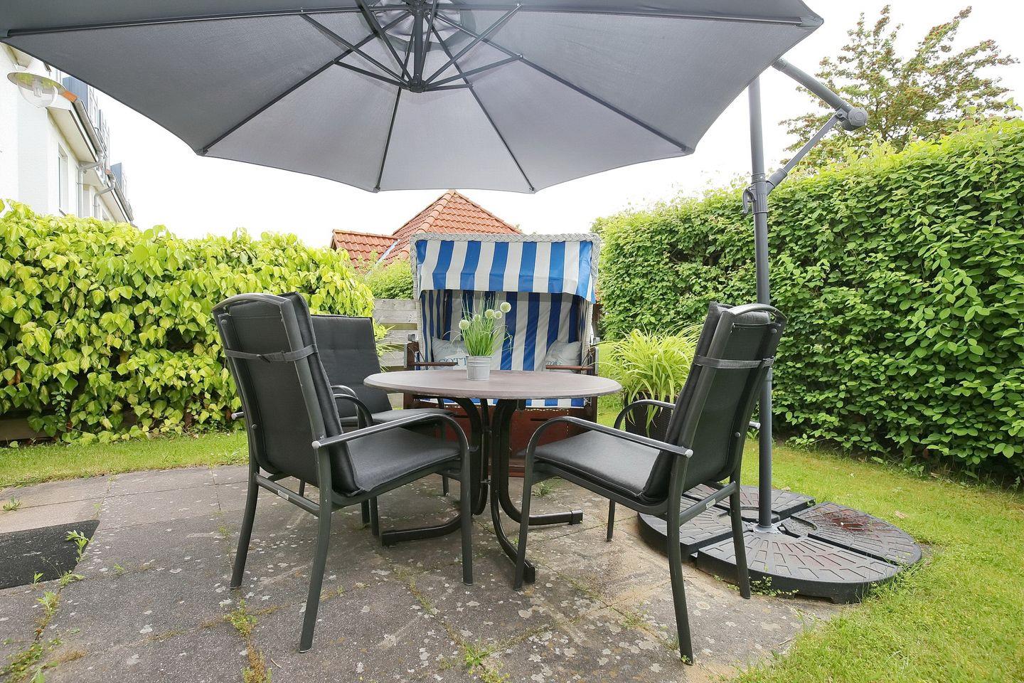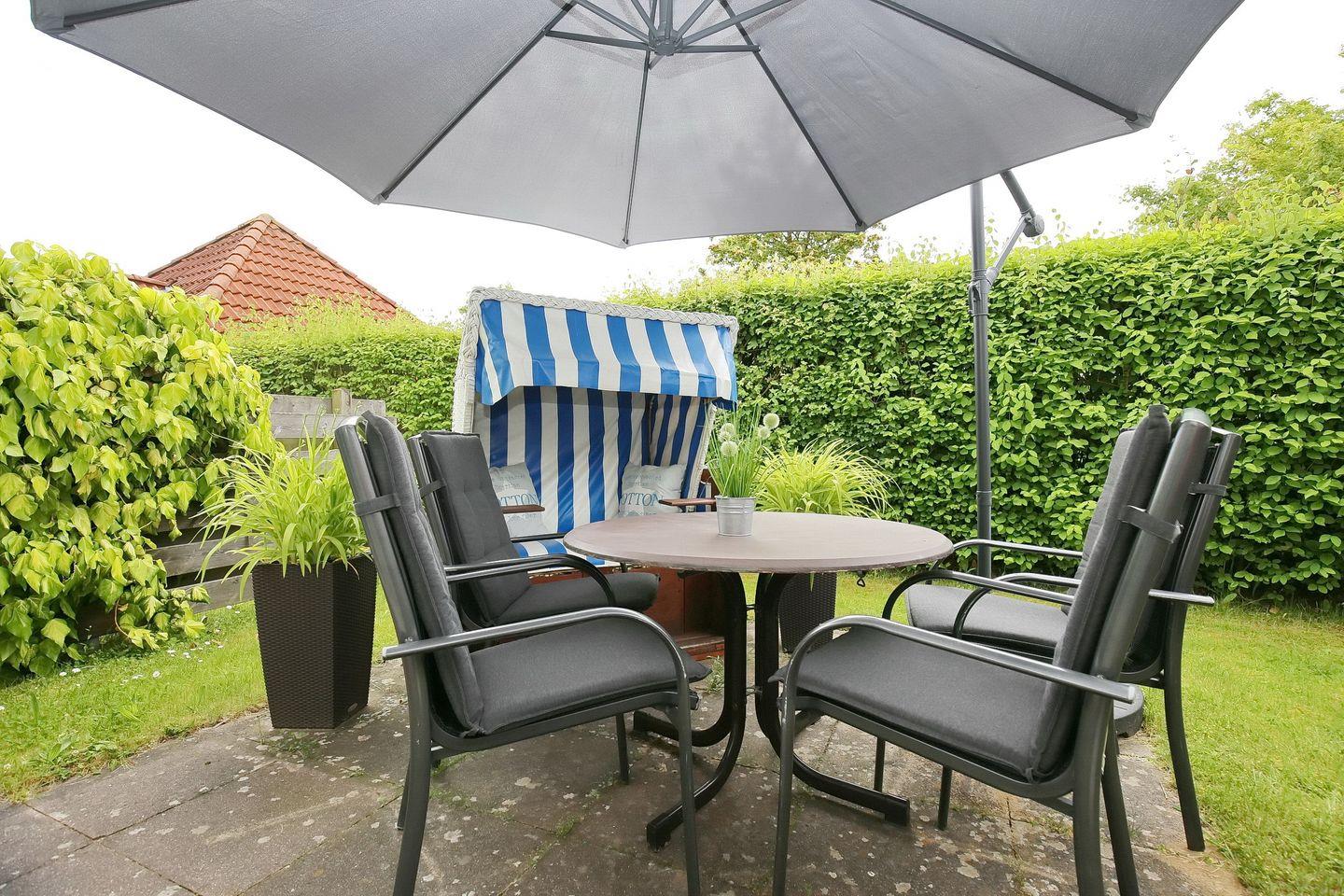 Vom Wohnbereich aus gelangst du auf die möblierte Terrasse, wo sich auch ein Strandkorb befindet. Eine kleine Hecke dient als Sichtschutz. Im lichtdurchfluteten Wohnzimmer befinden sich eine gemütliche Wohnlandschaft und der Essbereich. Zum Zeitvertreib stehen dir sowohl ein TV, eine Stereoanlage als auch eine Auswahl an Büchern zur Verfügung. Der Bodenbelag ist hier Laminat.