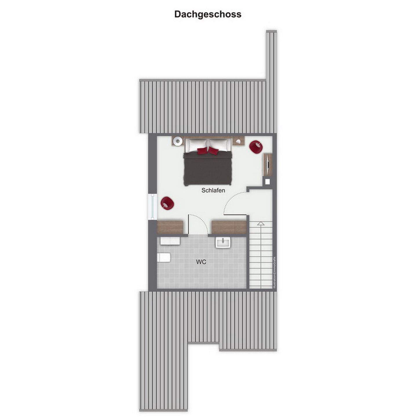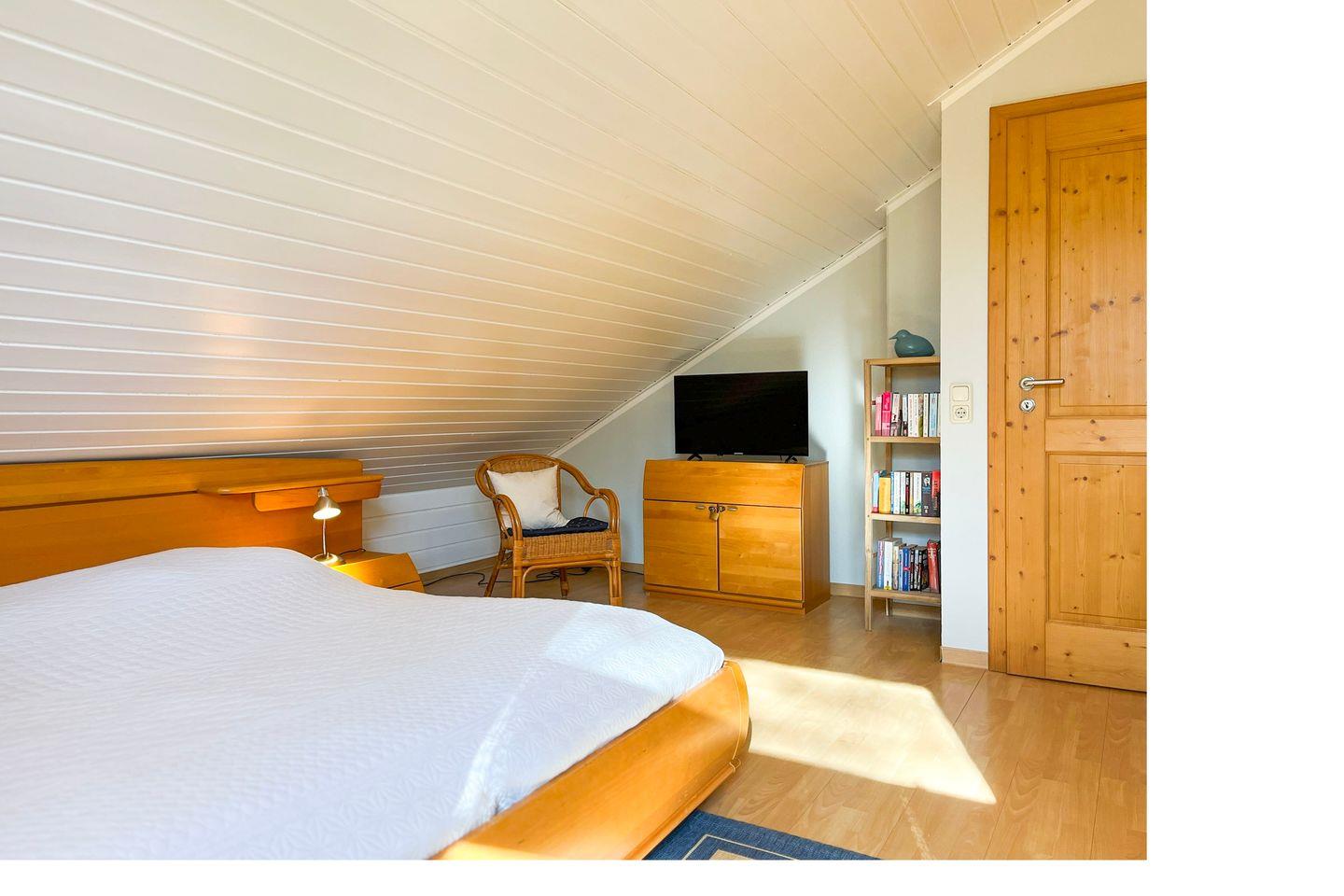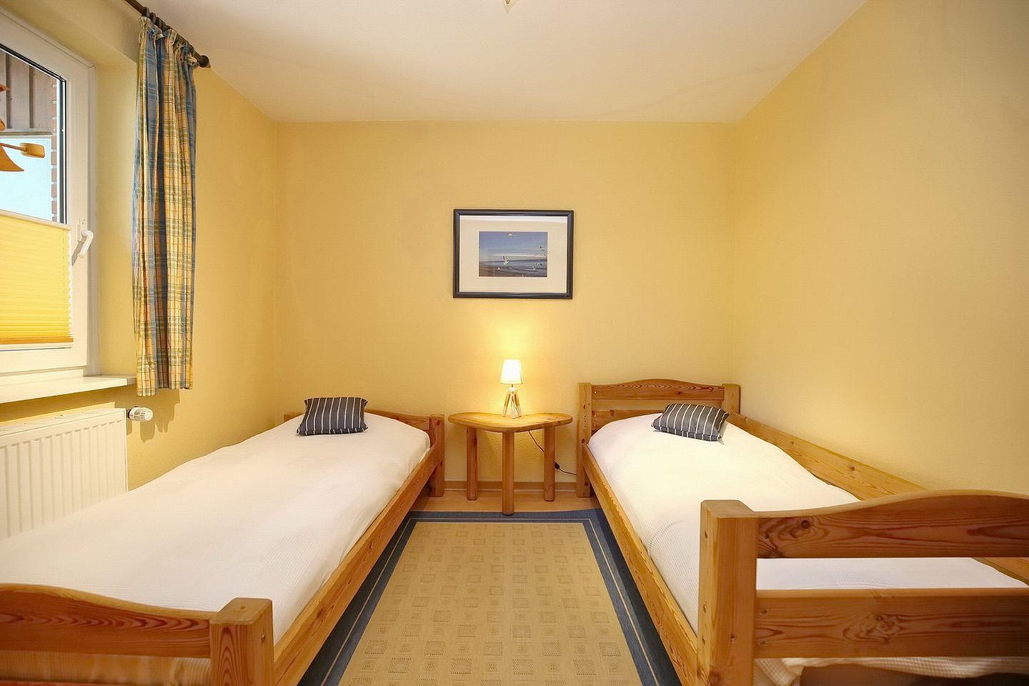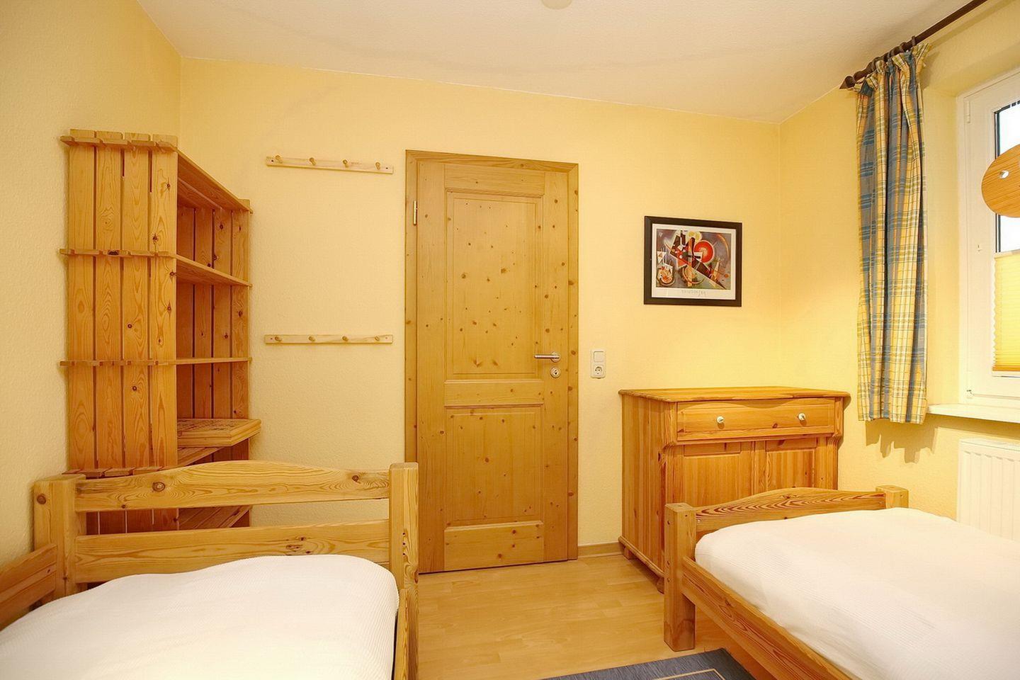 Im oberen Schlafzimmer mit einem zweiten TV-Gerät und DVD-Player stehen als Schlafgelegenheit ein Doppelbett (2 x 90 x 200 cm) und im unteren Schlafzimmer zwei gemütliche Einzelbetten (je 90 x 200 cm) zur Verfügung. Für die kleinen Gäste gibt es kostenlos einen Bollerwagen (ohne Rechtsanspruch).