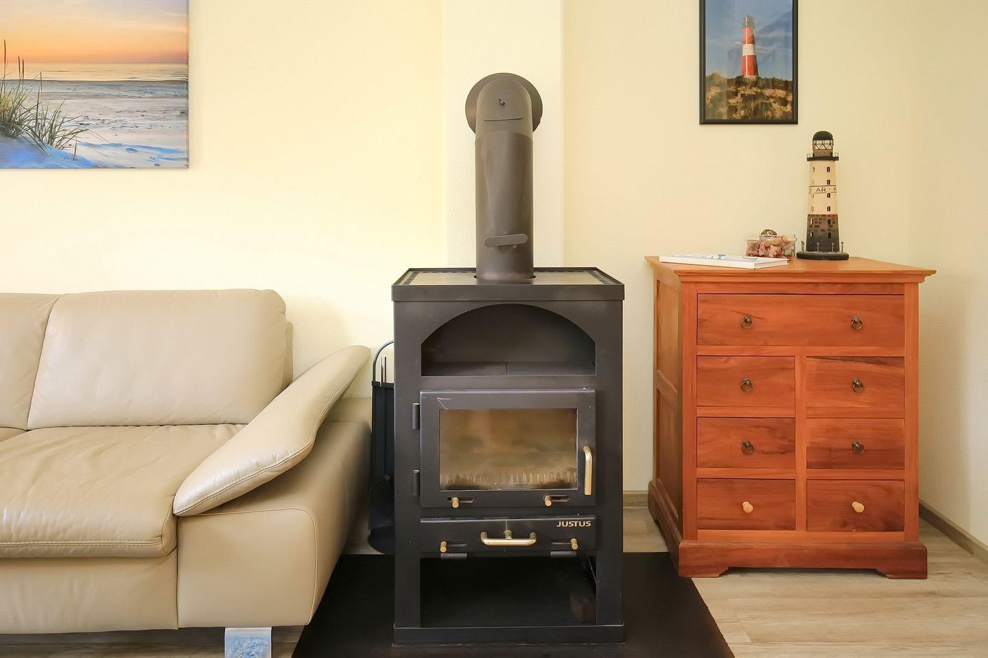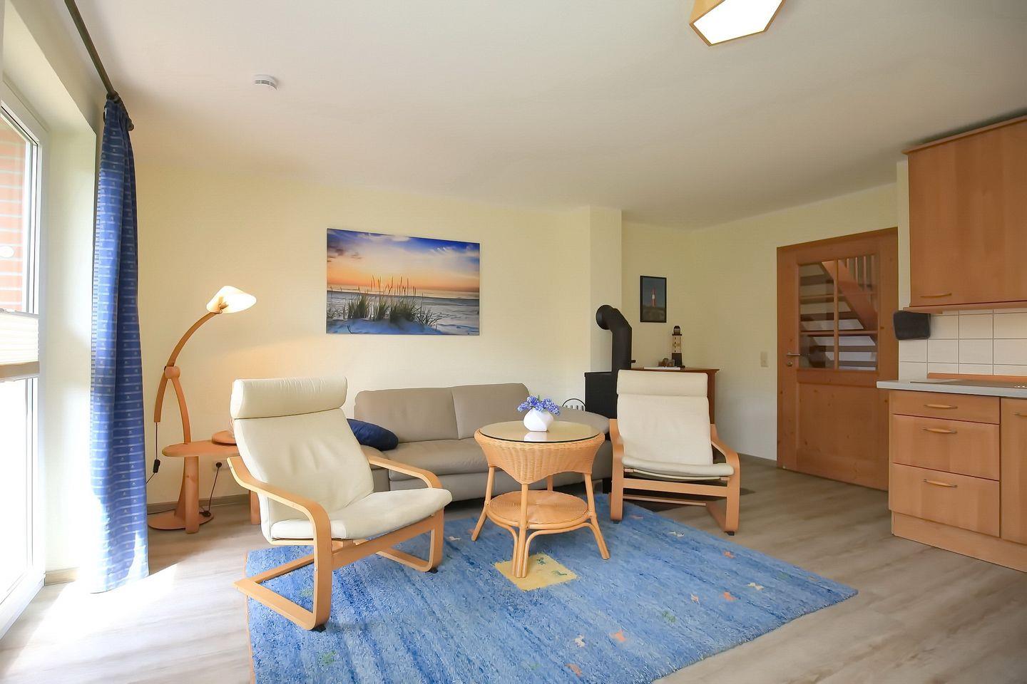 Im Erdgeschoss des Ferienhauses befindet sich das gemütliche Wohnzimmer mit integrierter Küchenzeile. Hier stehen dir ein moderner Flachbildfernseher, eine Stereoanlage und ein DVD-Player zur Verfügung. Der Kamin sorgt in der kalten Jahreszeit für eine behagliche Atmosphäre. Als Belag für das Wohnzimmer wurde Laminat gewählt.