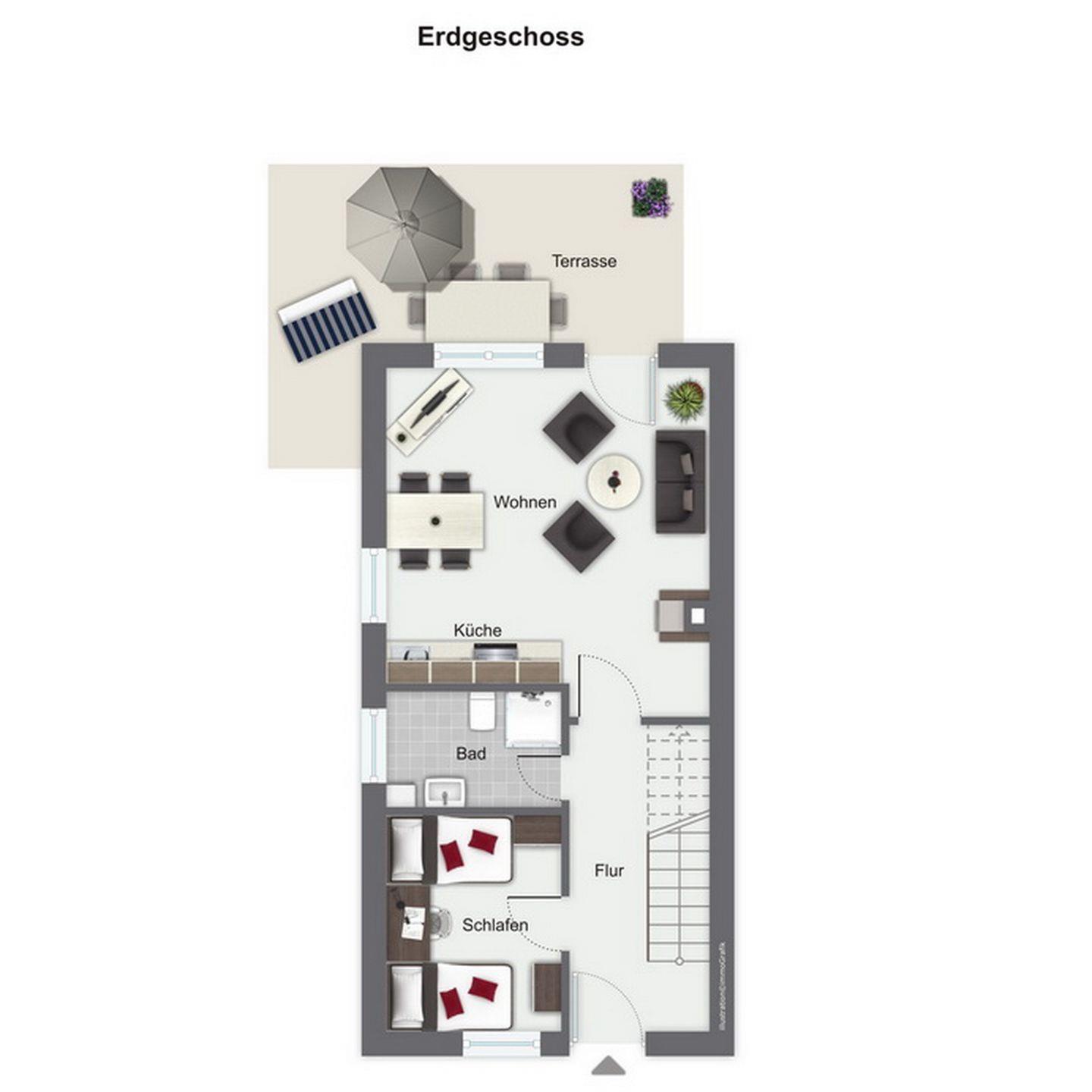 Vor dem Eingang befindet sich eine weitere Terrasse, deren dichte Bepflanzung ebenfalls eine Nutzung ermöglicht. Im Abstellraum neben dem Eingang können Grill, Fahrräder, Bollerwagen, etc. abgestellt werden.