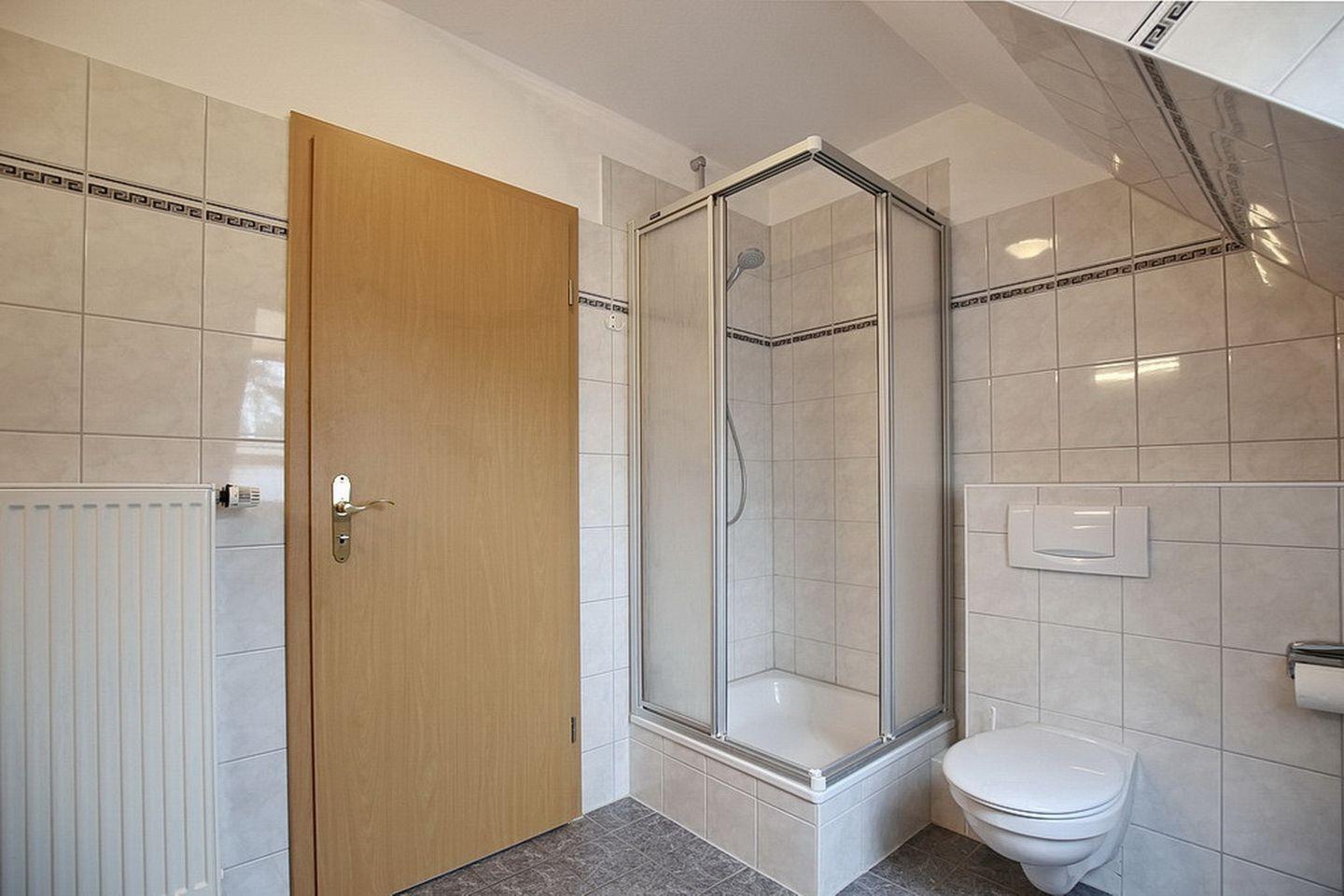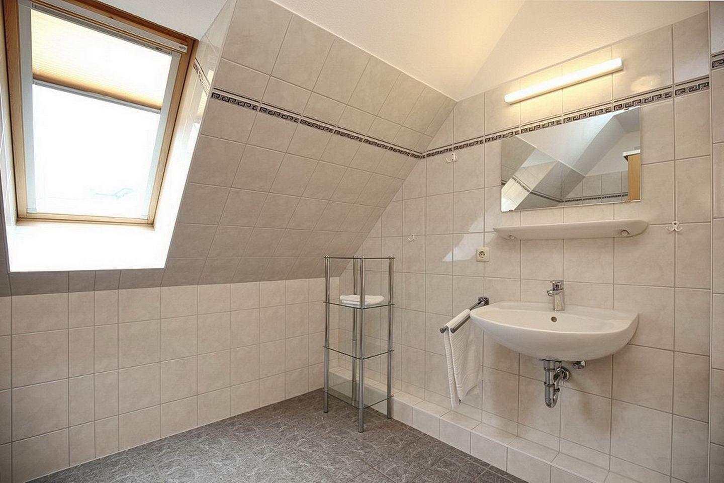 Das geflieste Duschbad mit Fenster ist funktionell ausgestattet.