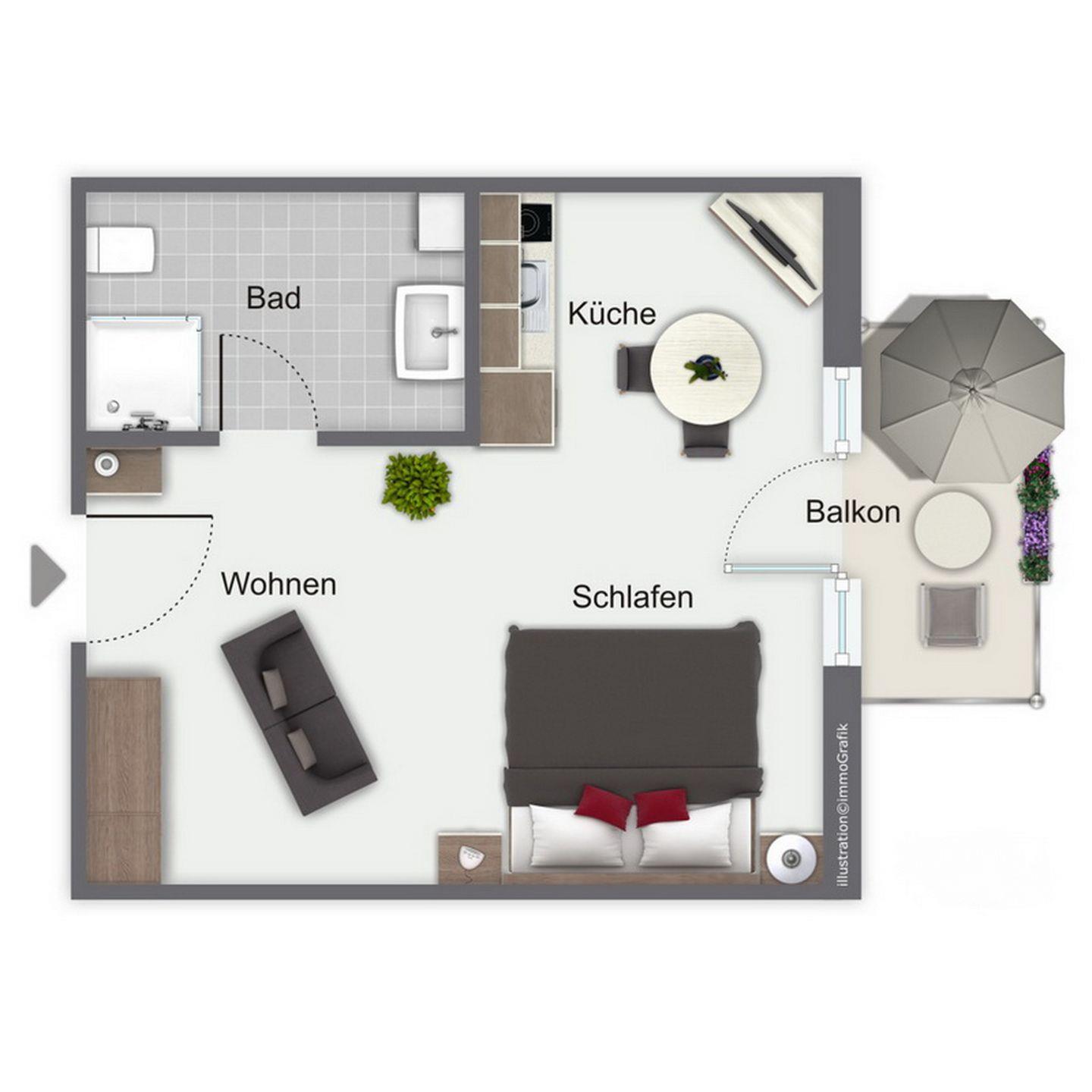 Im Wohnbereich befindet sich ein komfortables Doppelbett (2 x 80 x 200 cm). Eine Stereoanlage mit CD-Player und ein TV-Flatscreen sorgen für Kurzweil an den Abenden. Der Boden ist mit Designbelag ausgelegt. In der kalten Jahreszeit kannst du vom Balkon aus einen Teilseeblick genießen.