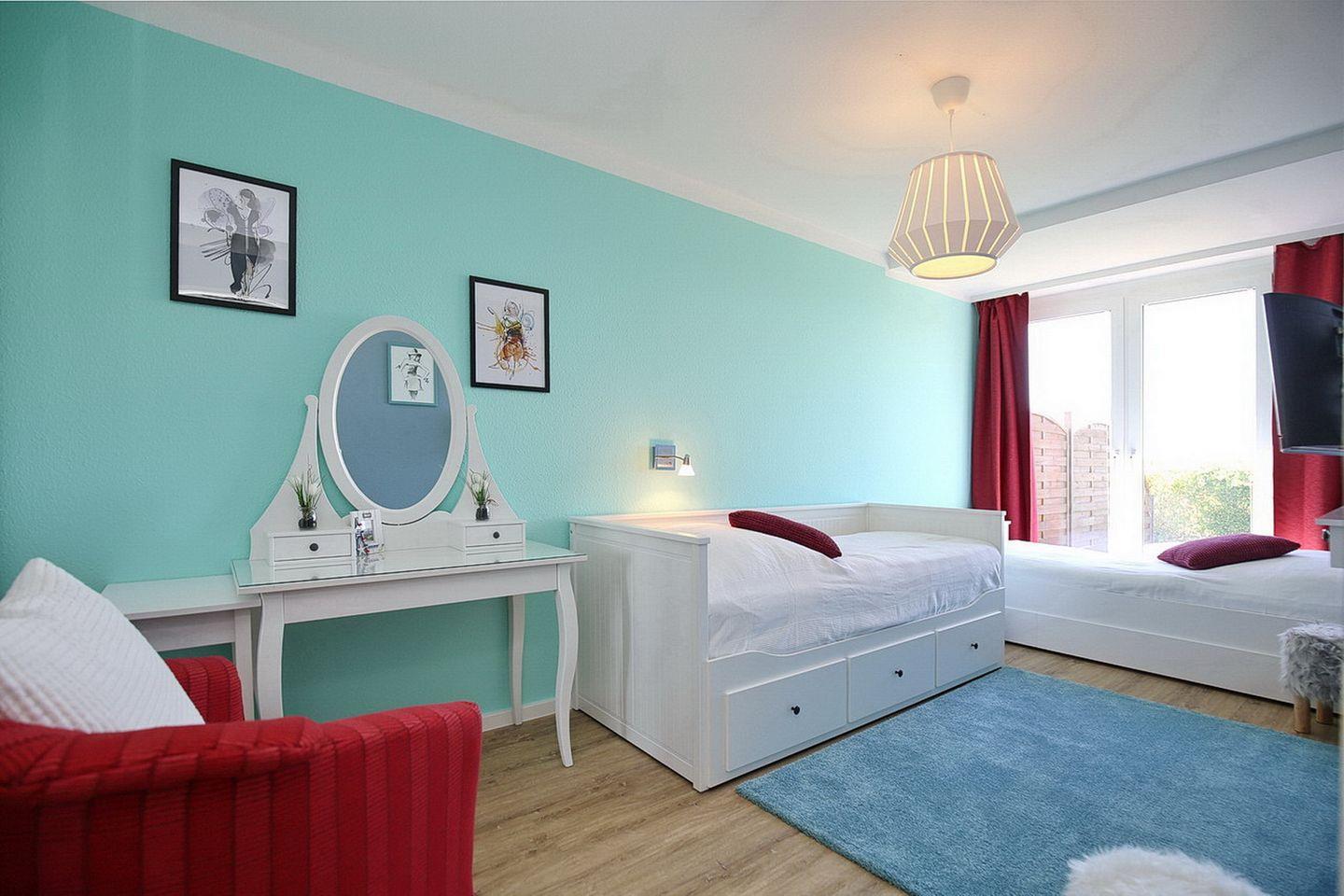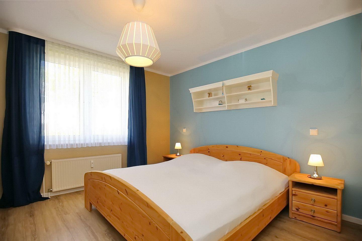 Für einen erholsamen Schlaf sorgen im ersten Schlafzimmer ein Doppelbett (2 x 90 x 200 cm) und im zweiten Schlafraum zwei Einzelbetten (90 x 200 cm). Dein Urlaubsgepäck kannst du in den jeweiligen Bereichen in einem Kleiderschrank verstauen. Zur Abdunkelung sind an den Fenstern Vorhänge angebracht. Als Bodenbelag wurde in beiden Räumen Auslegware gewählt.