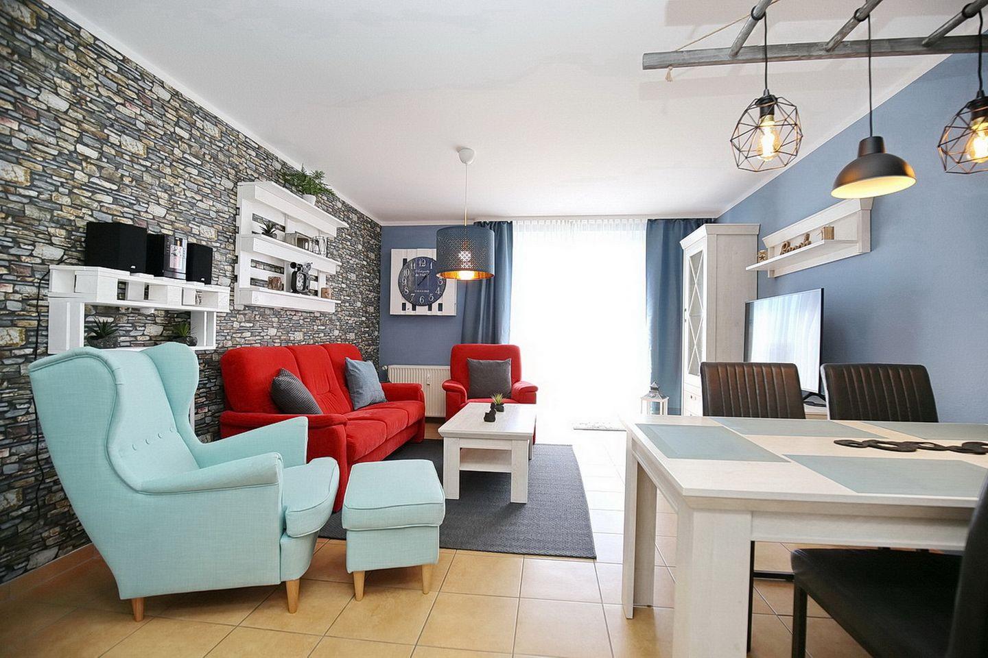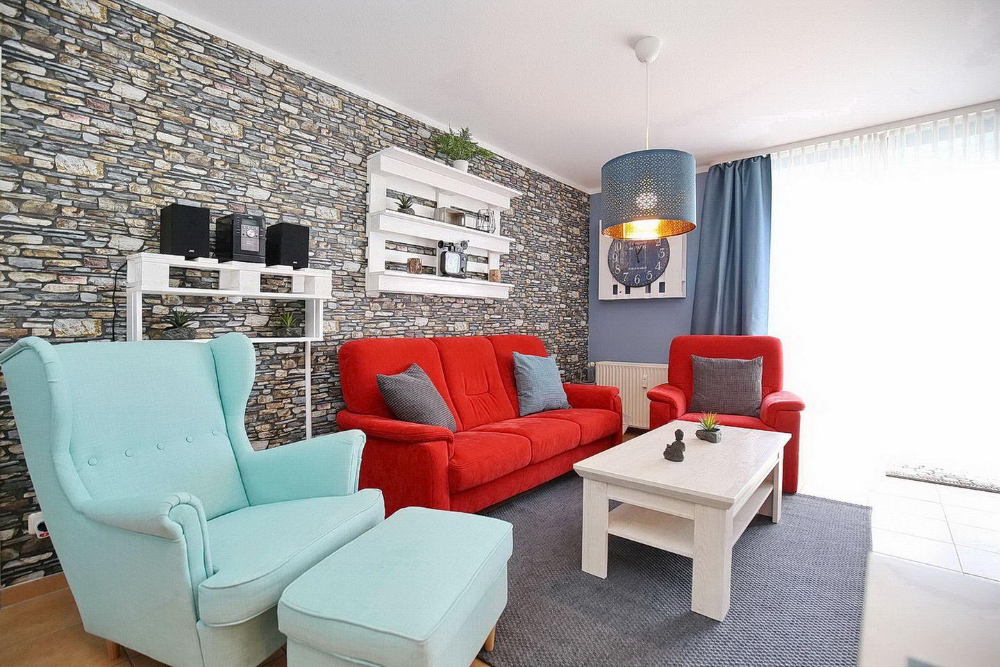 Vom Wohnbereich aus gelangst du auf die möblierte Terrasse. Eine kleine Hecke dient als Sichtschutz. Im lichtdurchfluteten Wohnzimmer befinden sich eine bequeme Couchgarnitur und der Essbereich. Zur Unterhaltung stehen dir sowohl ein Flachbild-TV, eine Stereoanlage sowie eine Auswahl an Büchern und Spielen zur Verfügung.