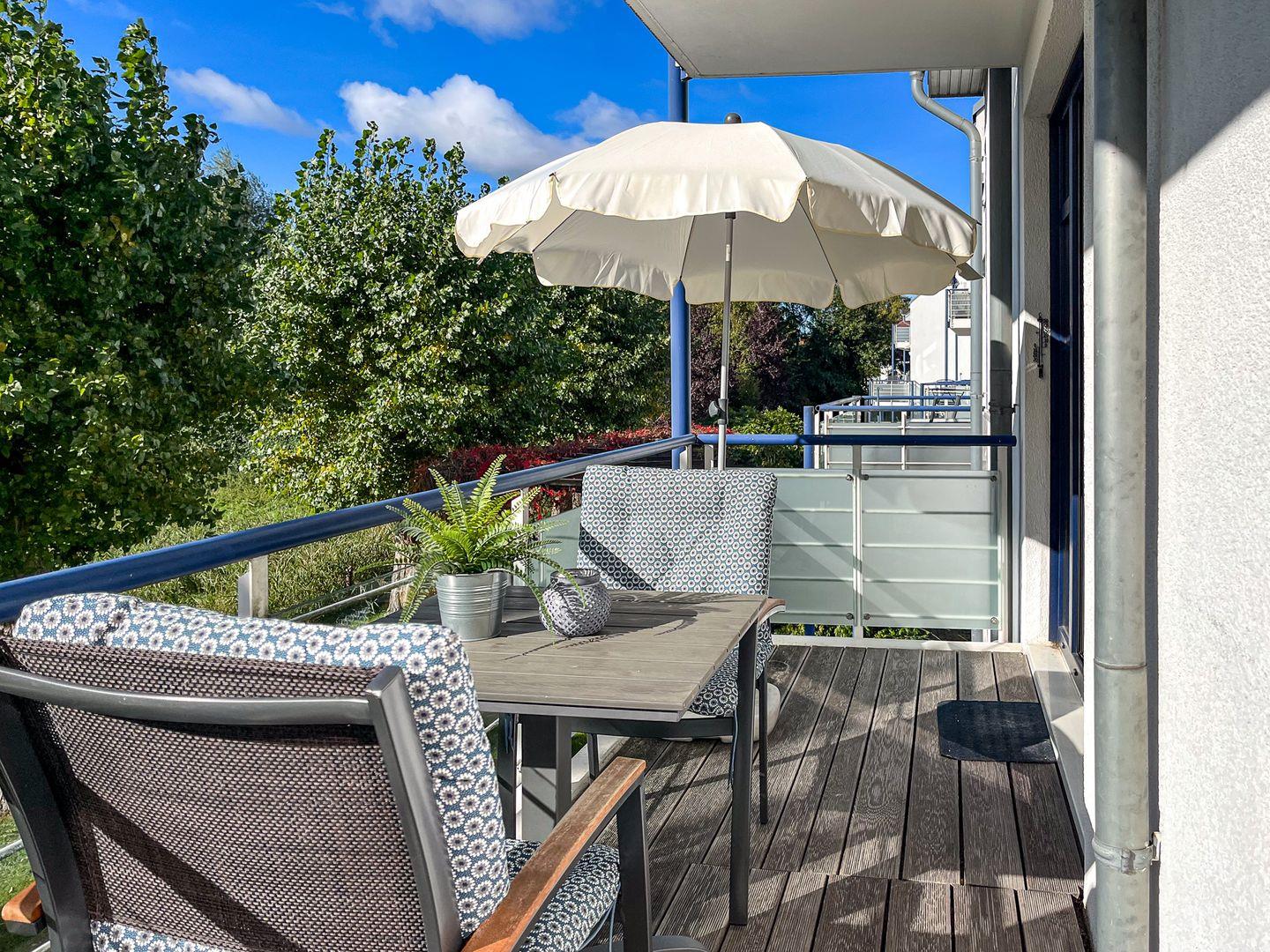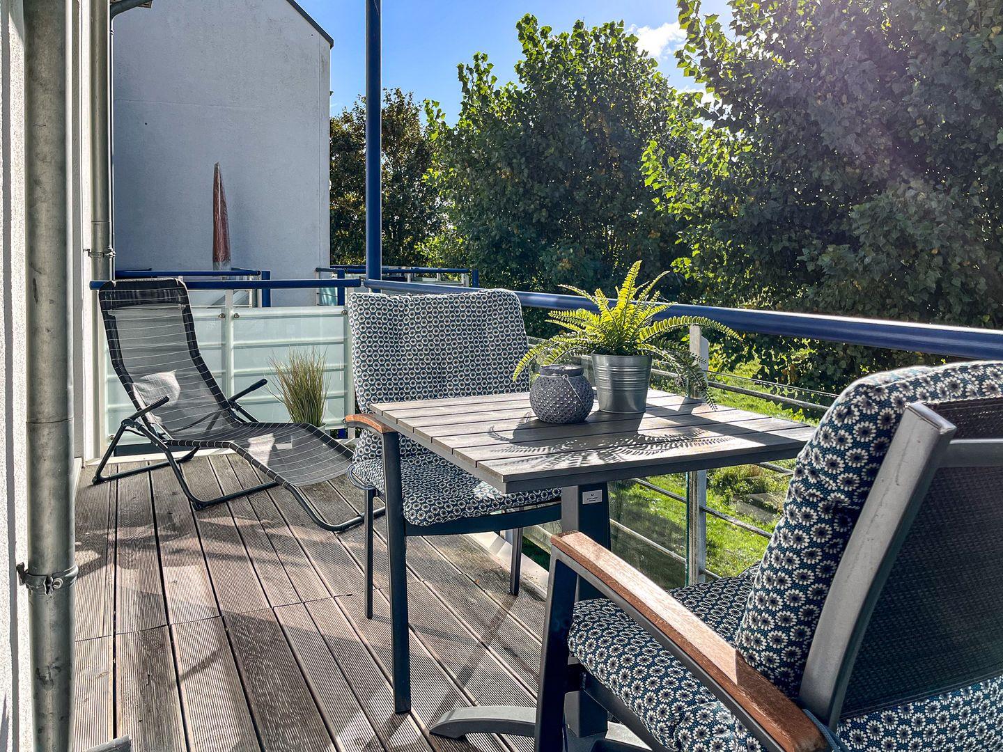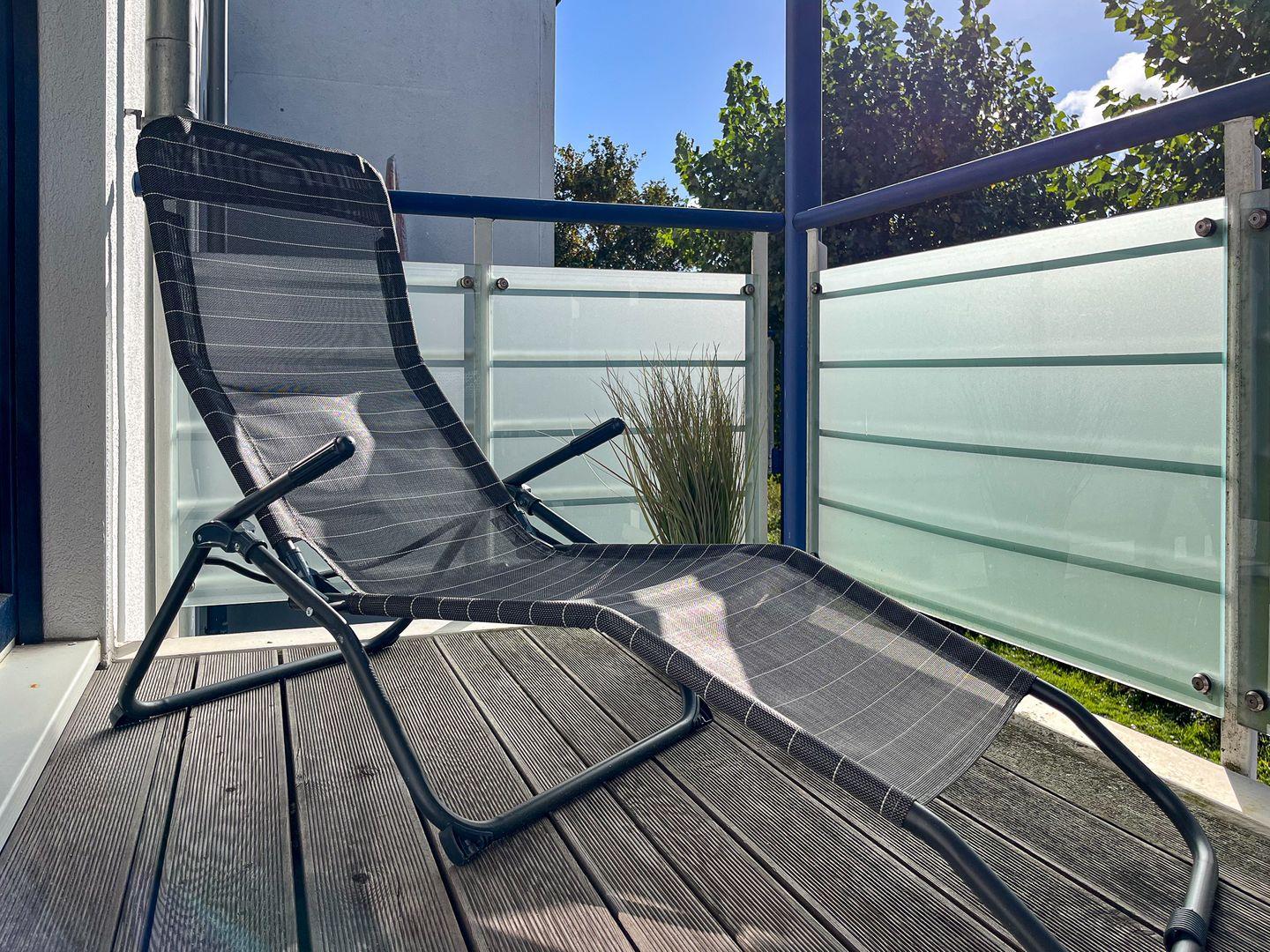 Im sonnendurchfluteten Wohnzimmer mit einer ausziehbaren Doppelschlafcouch sorgt ein SAT-Flatscreen-Fernseher mit Sky-Empfang für Kurzweil – nicht nur an Regentagen. Direkt vom Wohnzimmer gelangst du auf den großen Südbalkon mit den gemütlichen Balkonmöbeln. Der Blick auf die Haffwiesen ist phänomenal.