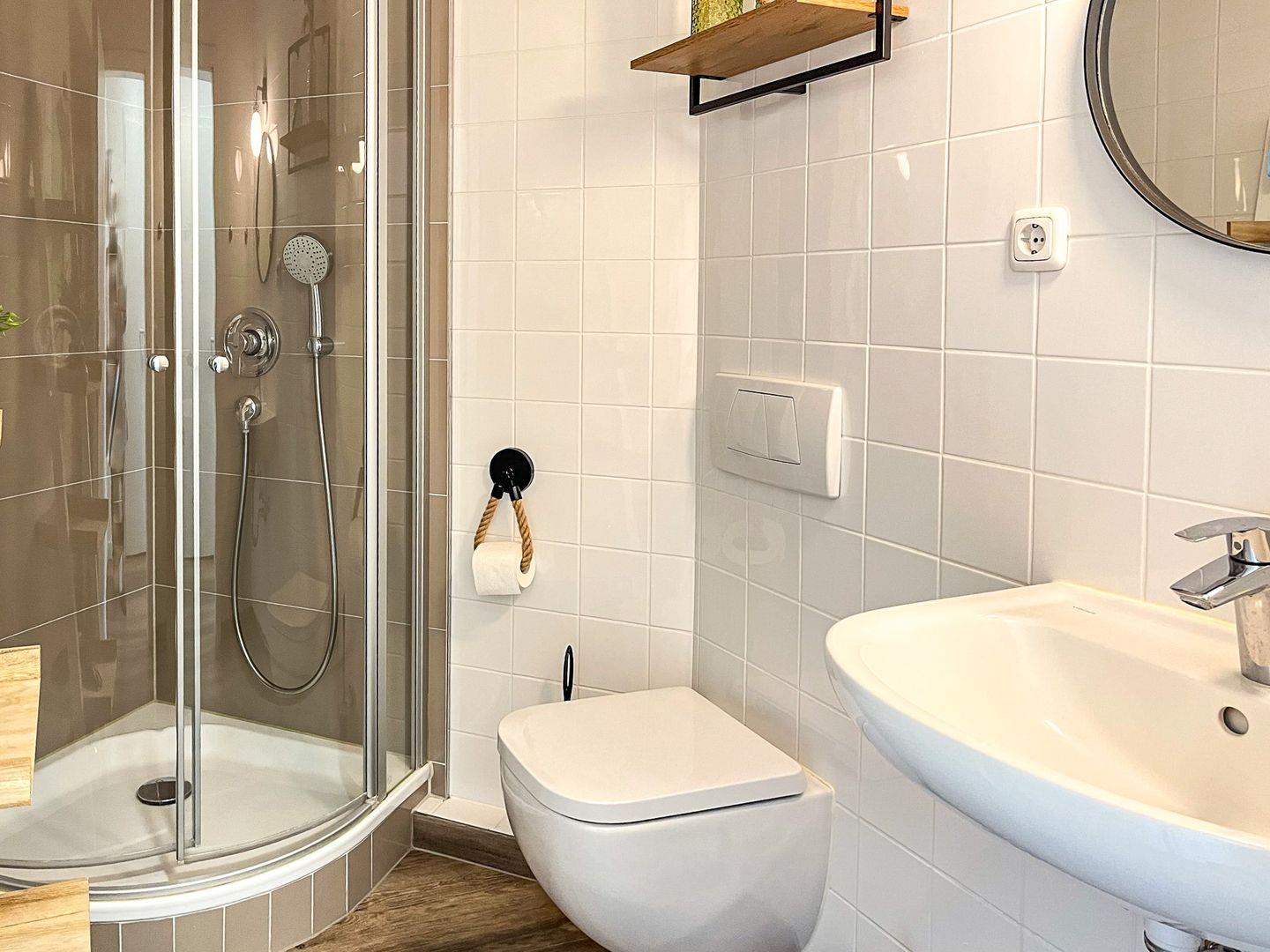 Das Duschbad ist gefliest. Der gesamte Wohnbereich wurde mit Vinyl-Belag ausgelegt.