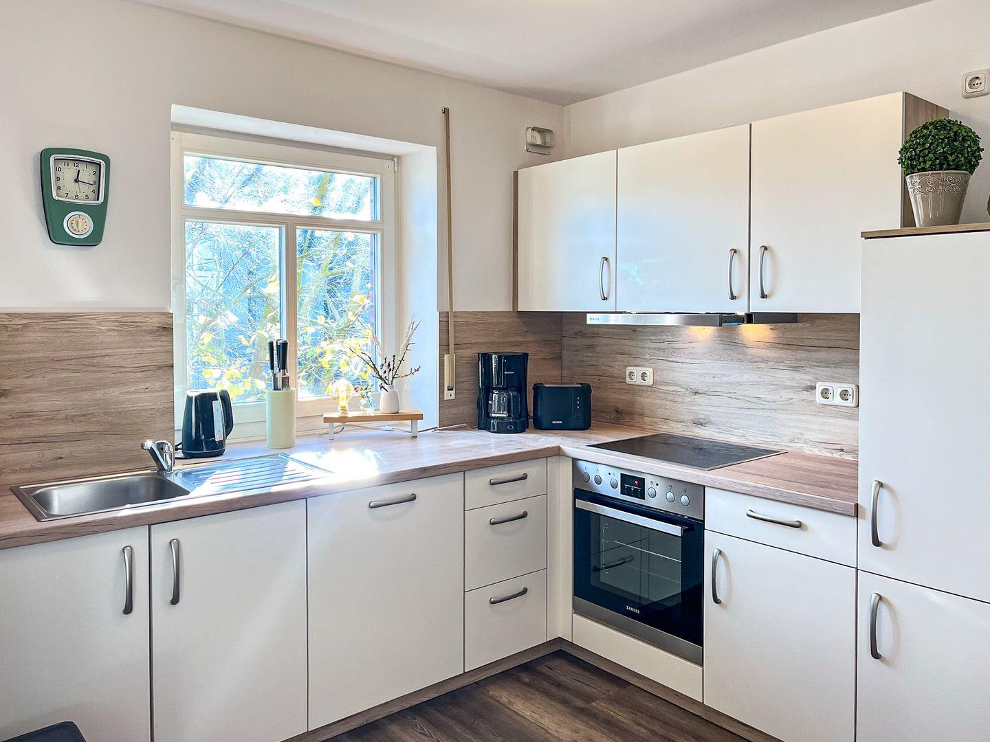 Der vollständig ausgestattete Küchenbereich ist mit einem Geschirrspüler, einem 4-Platten-Cerankochfeld mit Backofen, einer Mikrowelle sowie einem Kühlschrank mit Gefrierfach ausgestattet. Ein Essbereich für die Einnahme der Mahlzeiten ist ebenfalls vorhanden.