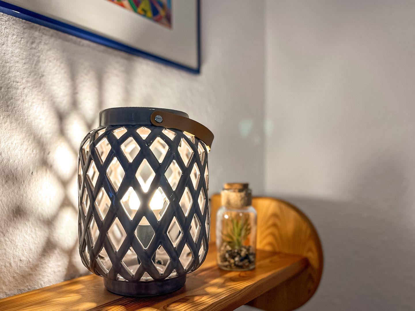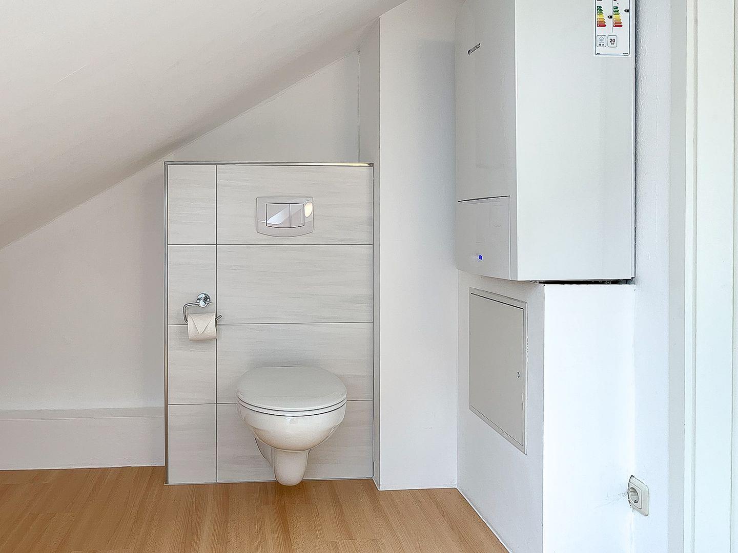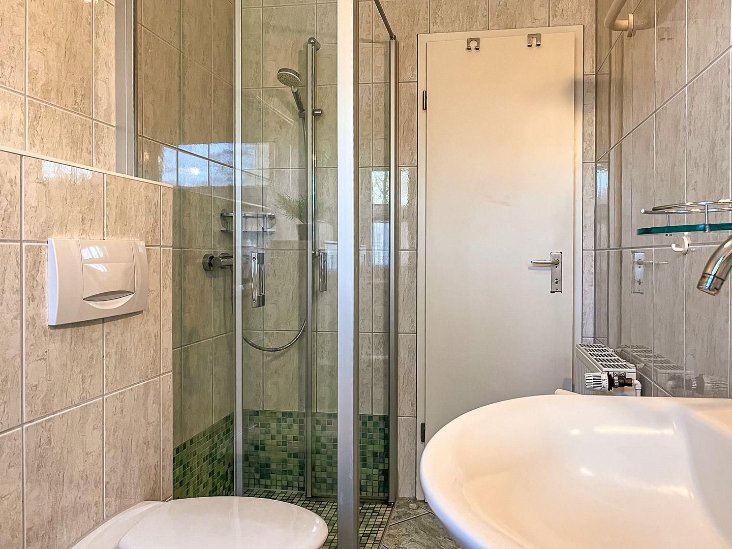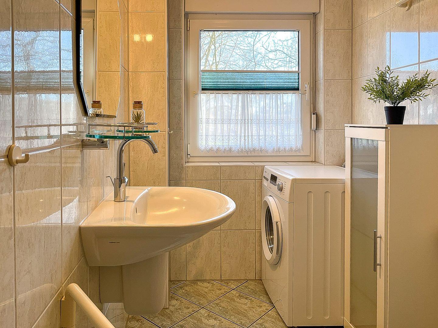 Das geflieste Bad mit WC und Dusche befindet sich ebenfalls im Erdgeschoss. Im Obergeschoss steht ein zusätzliches Gäste-WC zur Verfügung. Für die Wäsche zwischendurch nutzt du die Waschmaschine.