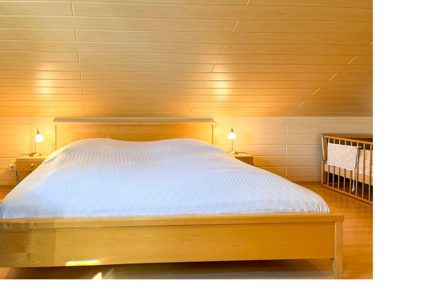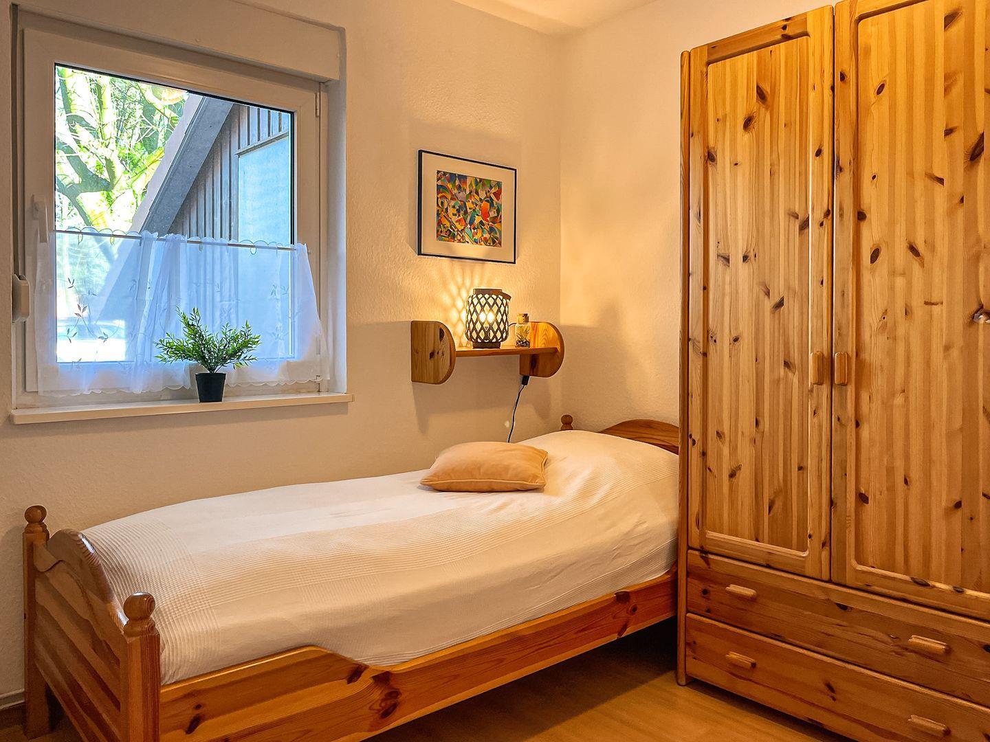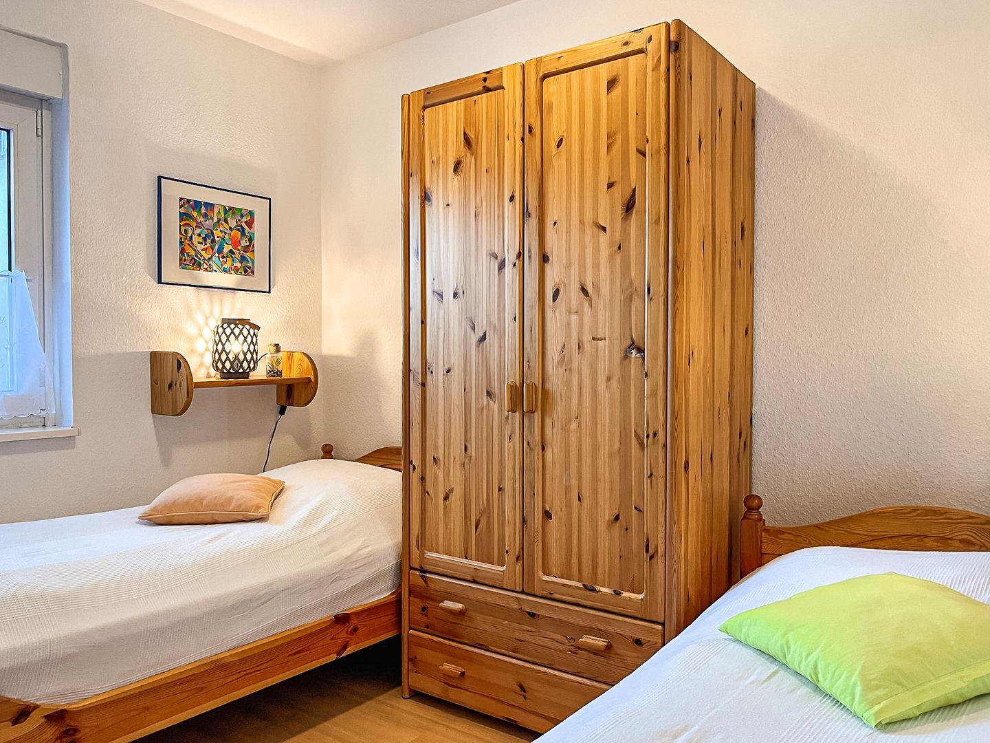 Im Erdgeschoss befindet sich ein Schlafzimmer mit 2 Einzelbetten (je 90 x 200 cm). Ein weiteres, geschmackvoll eingerichtetes Schlafzimmer mit Doppelbett (2 x 100 x 200 cm), großem Kleiderschrank und Sat/TV befindet sich im Obergeschoss. Für die kleinsten Gäste steht ein massives Baby-/Kinderbett sowie ein Bollerwagen bereit.
