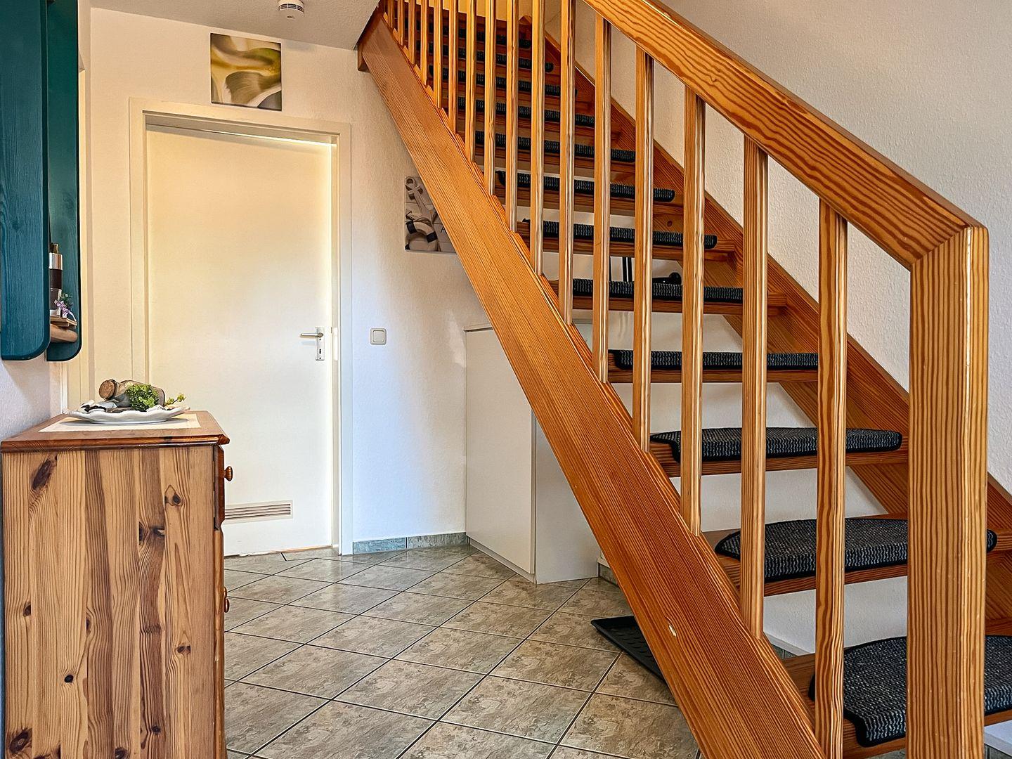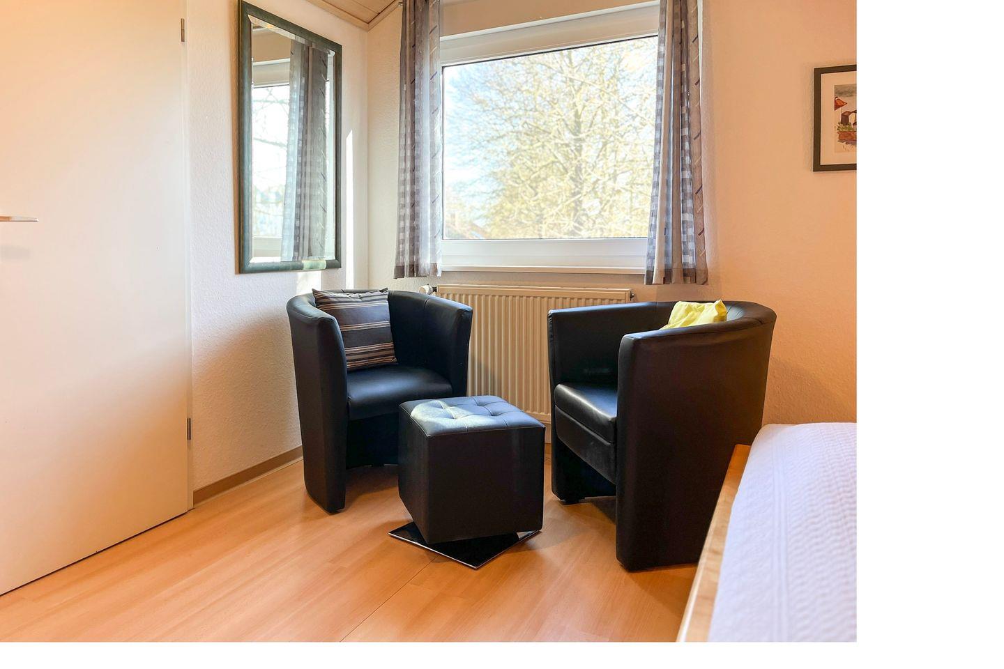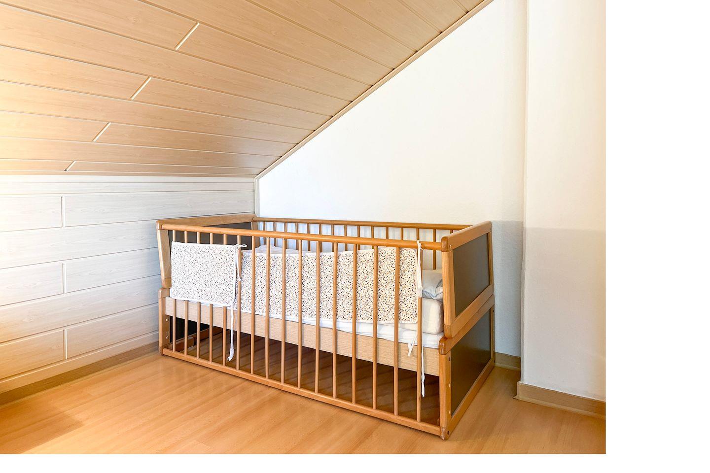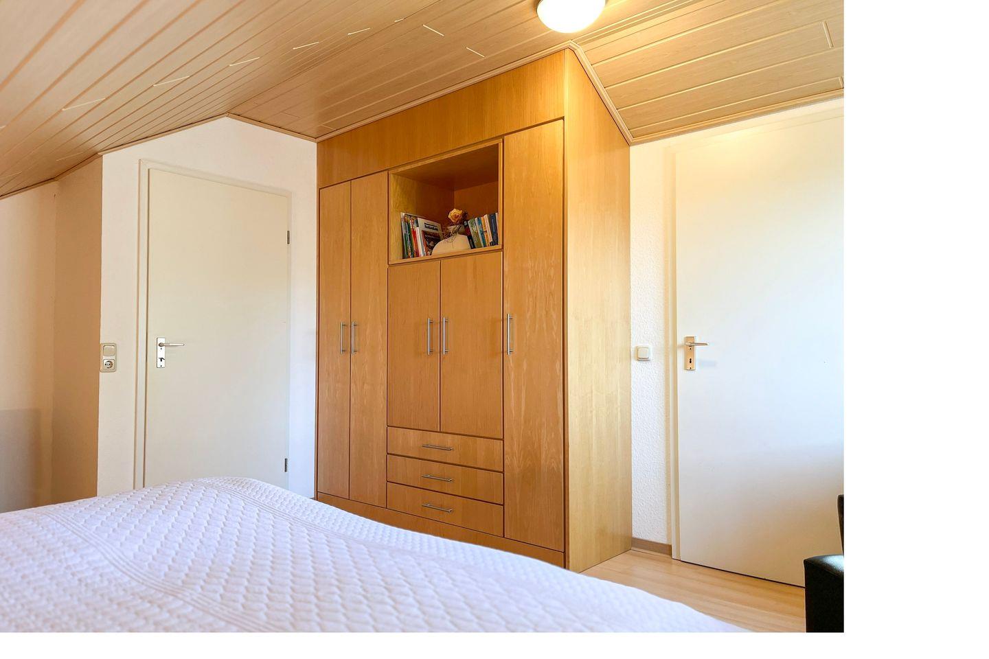 Im Erdgeschoss befindet sich ein Schlafzimmer mit 2 Einzelbetten (je 90 x 200 cm). Ein weiteres, geschmackvoll eingerichtetes Schlafzimmer mit Doppelbett (2 x 100 x 200 cm), großem Kleiderschrank und Sat/TV befindet sich im Obergeschoss. Für die kleinsten Gäste steht ein massives Baby-/Kinderbett sowie ein Bollerwagen bereit.
