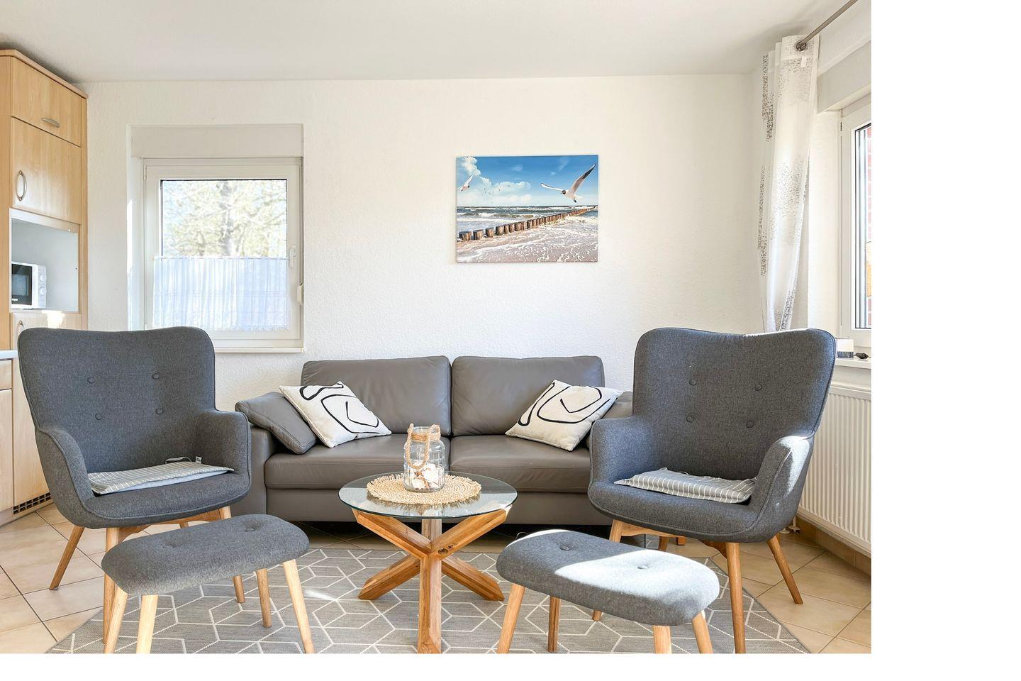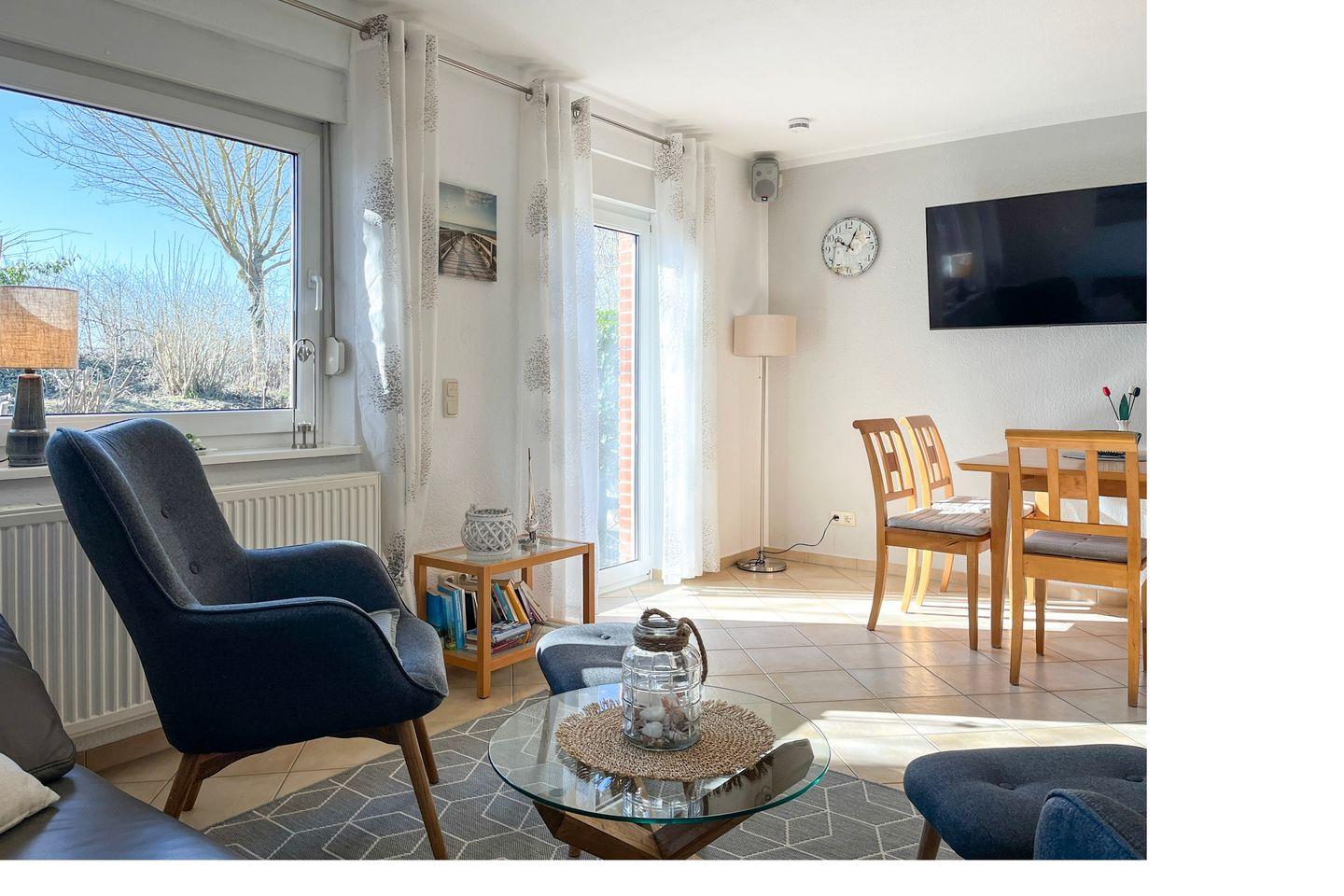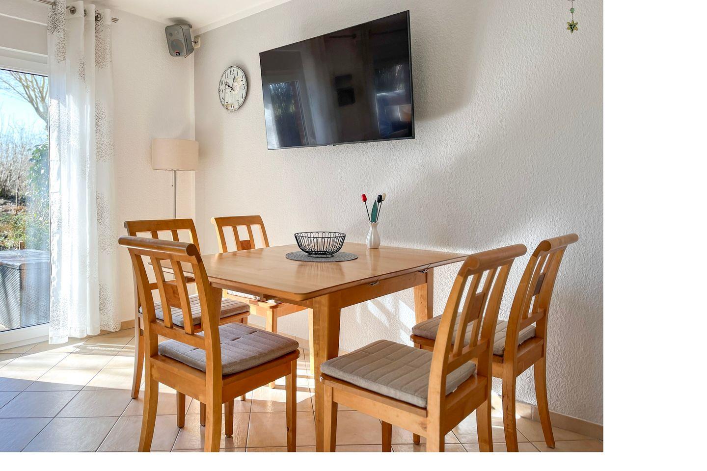 Der Essbereich in unmittelbarer Nähe der Küchenzeile bietet Platz für gemeinsame Mahlzeiten. Selbstverständlich stehen dir in diesem Ferienhaus Gartenmöbel mit Auflagen und ein Strandkorb zum Entspannen auf der großen Süd-West-Terrasse zur Verfügung. Genieße die lauen Sommerabende. Eine Markise schützt vor zu viel Sonne.