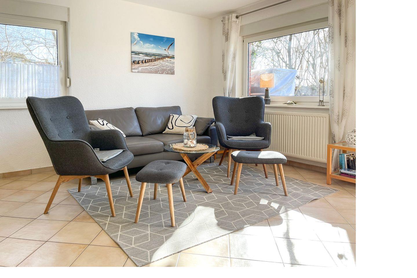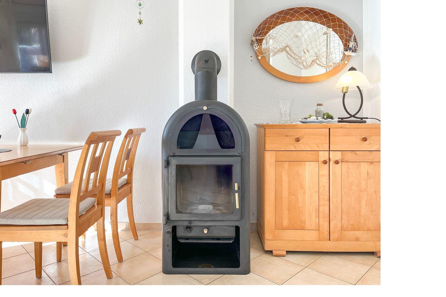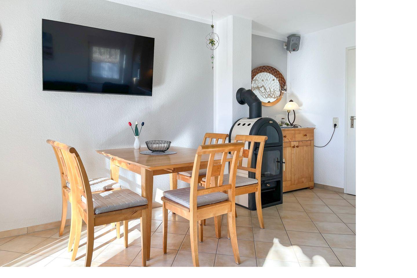 Im Erdgeschoss befindet sich das gemütliche Wohnzimmer – mit seiner gemütlichen Sitzecke und dem Kamin bietet es die besten Voraussetzungen für einen entspannten Urlaub. Neben einem großen Flatscreen -TV ( 40 Zoll ) sorgt eine hochwertige Stereoanlage der Marke Bose für Unterhaltung.