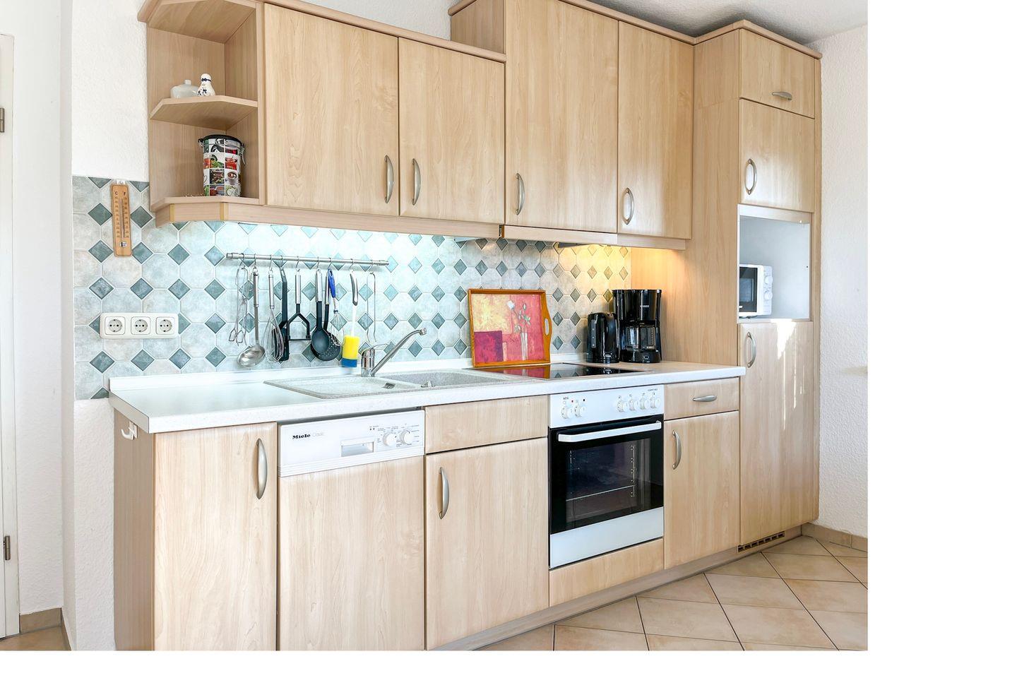 Die moderne Küchenzeile beinhaltet einen Kühlschrank mit Gefrierfach, Backofen, 4-Platten-Ceranfeld, Geschirrspüler, Mikrowelle und natürlich Kaffeemaschine und Wasserkocher.