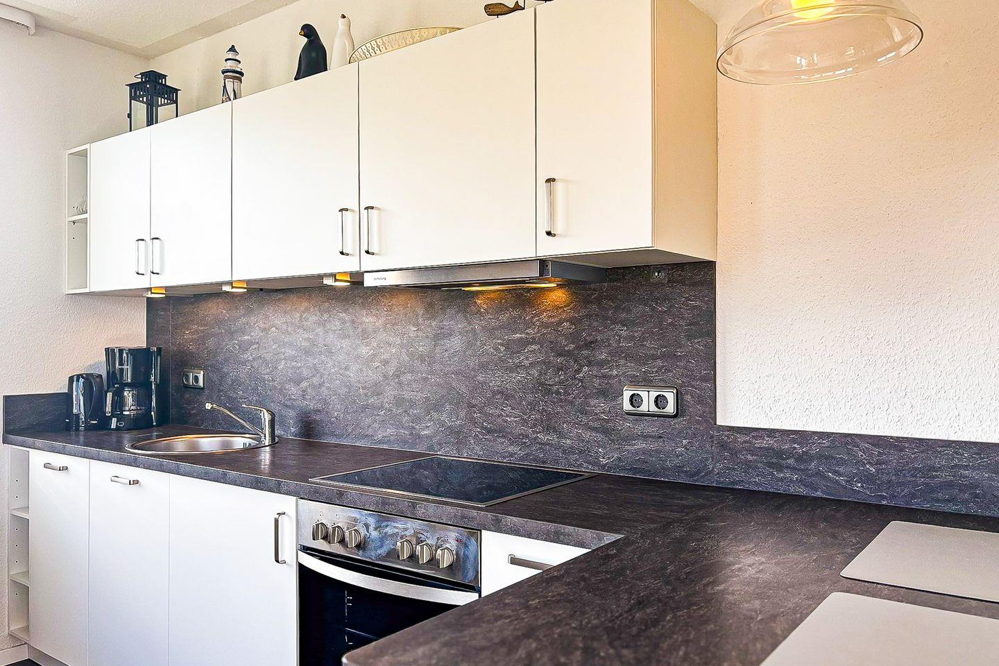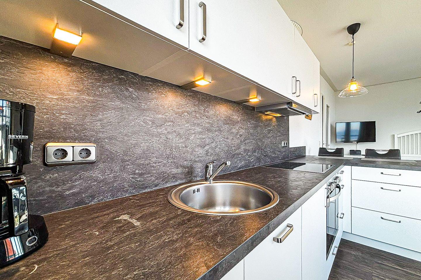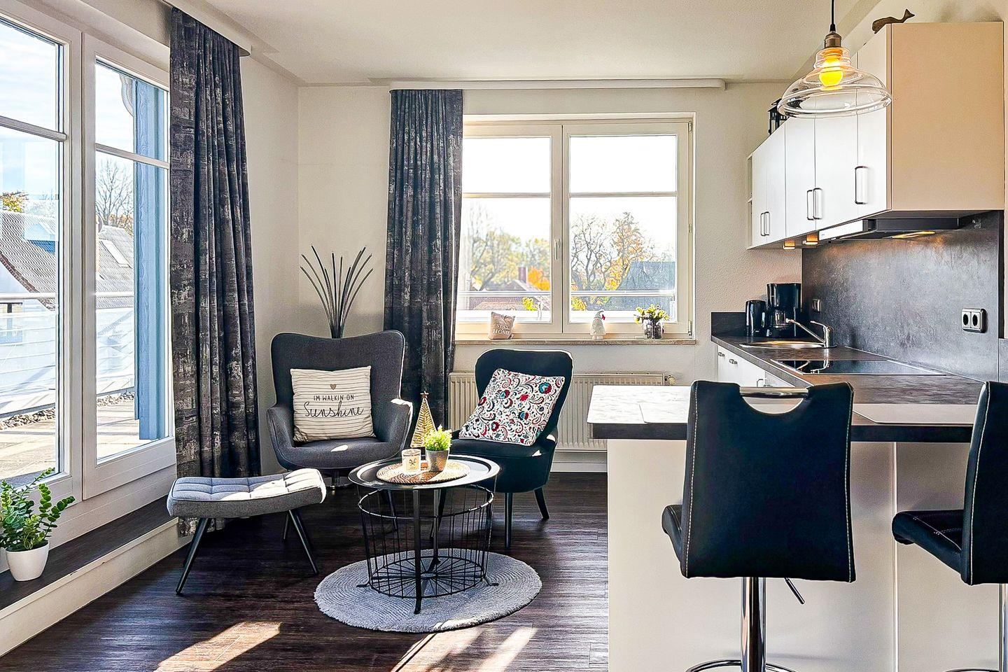 Die integrierte Küchenzeile ist ausgestattet mit einem Backofen, einem 4-Platten-Cerankochfeld, ein Geschirrspüler und einem Kühlschrank mit Gefrierfach. Der Essbereich schließt sich hier in Form eines Tresens mit zwei Stühlen direkt an. Für entspannte Momente stehen zwei Sessel zur Verfügung. An den Fenstern wurden Vorhänge angebracht.