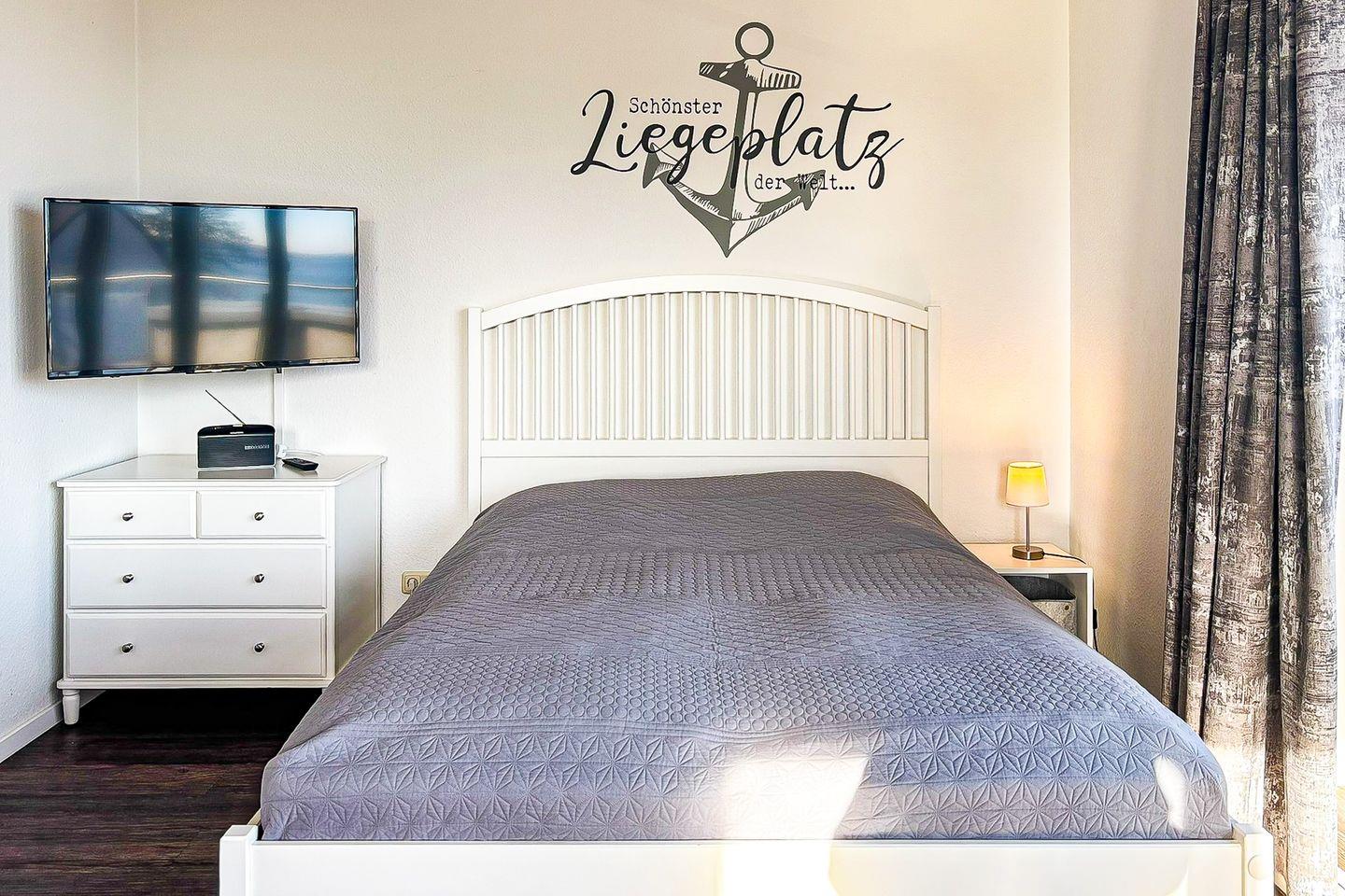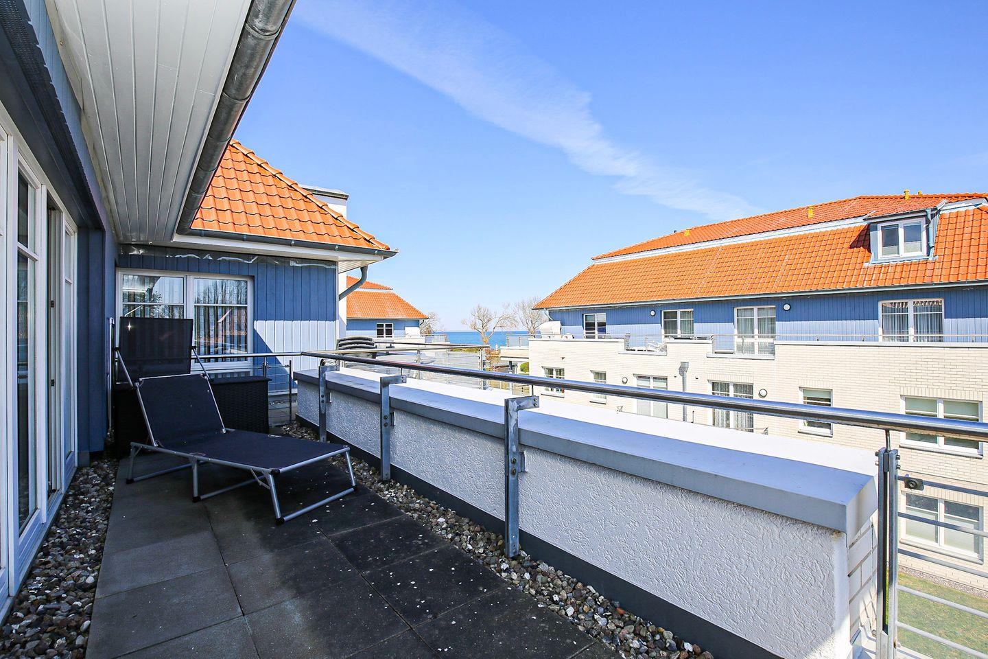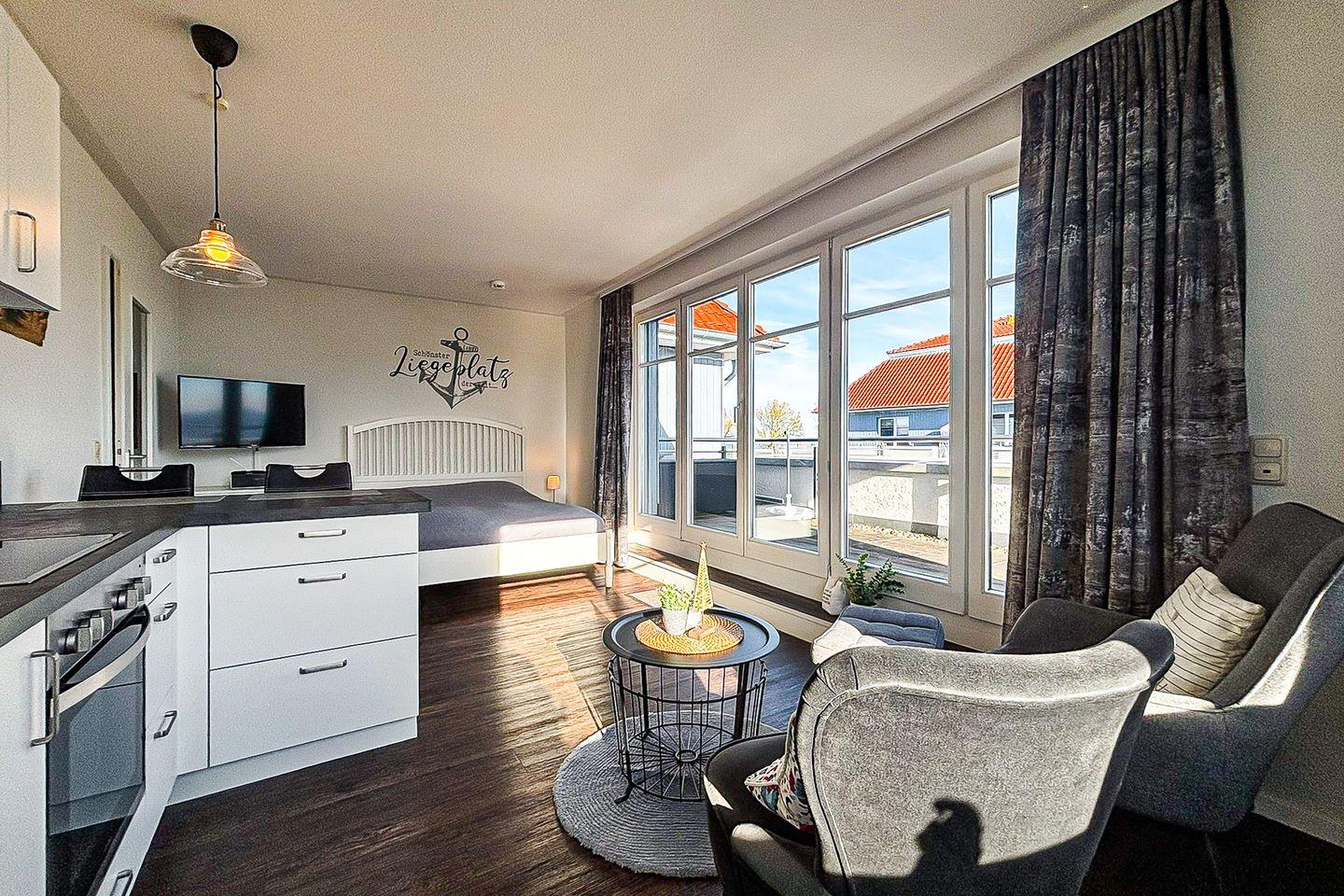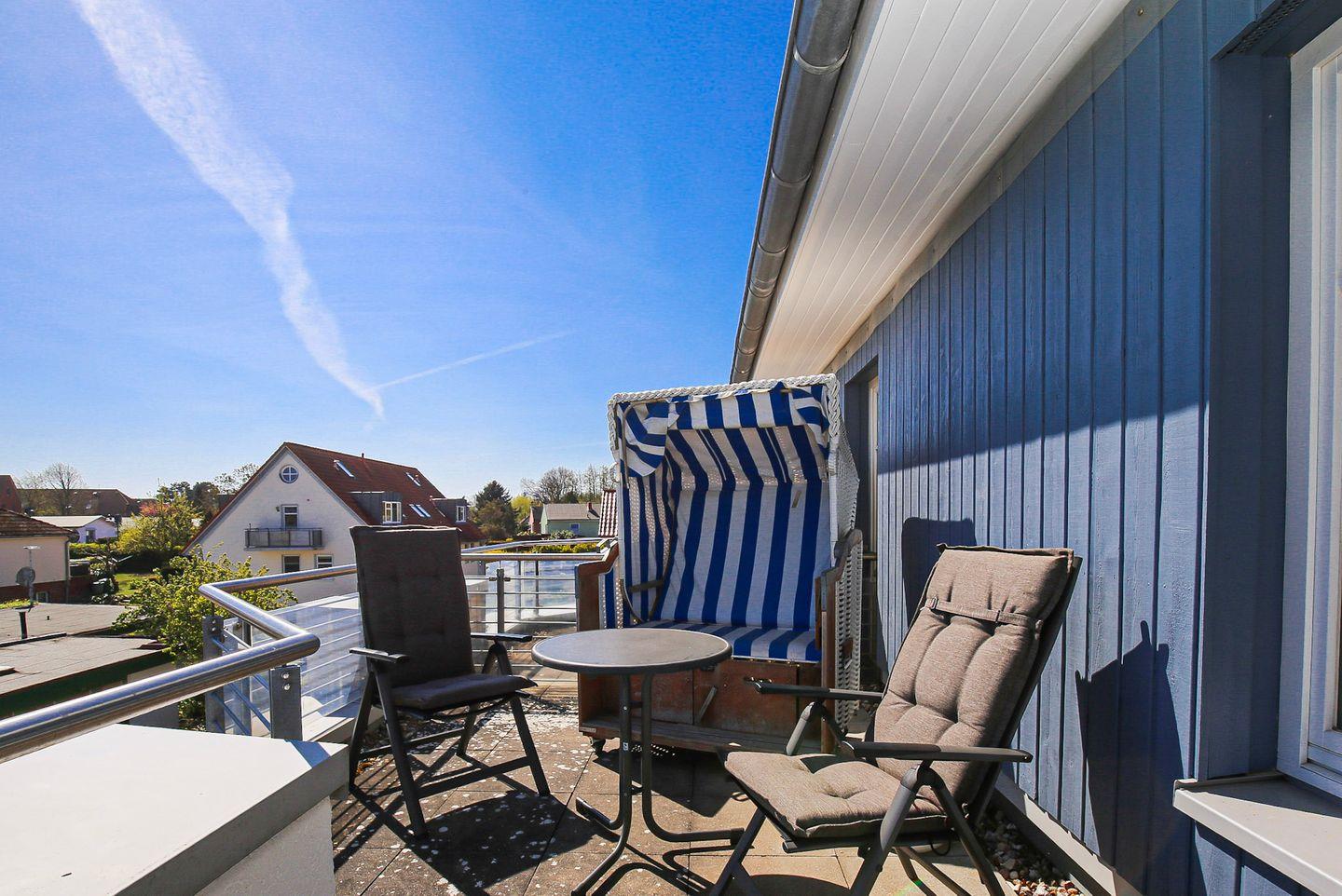 Vom Wohnraum aus gelangen Sie auf die möblierte Dachterrasse mit einem eigenen Strandkorb, einer Liege, einer Sitzgruppe mit Tisch sowie Seeblick. Der praktische Wohn- und Schlafbereich ist mit einem Bett (2x 80er x 200 cm) ausgestattet. Für Unterhaltung sorgen ein Flachbild-TV und ein Radio.