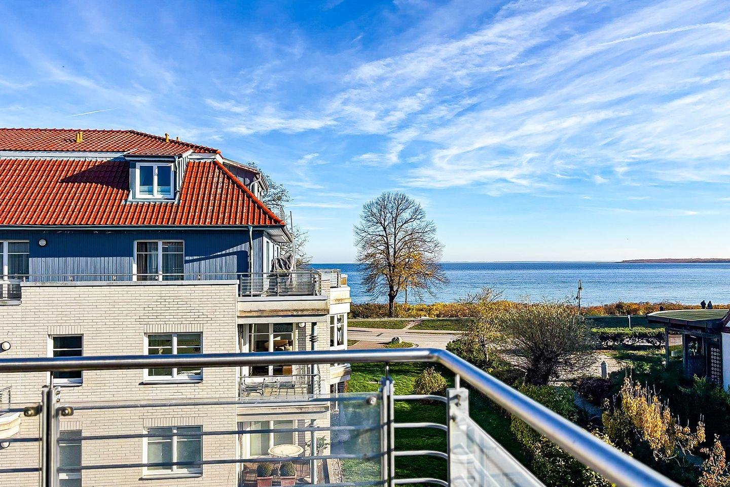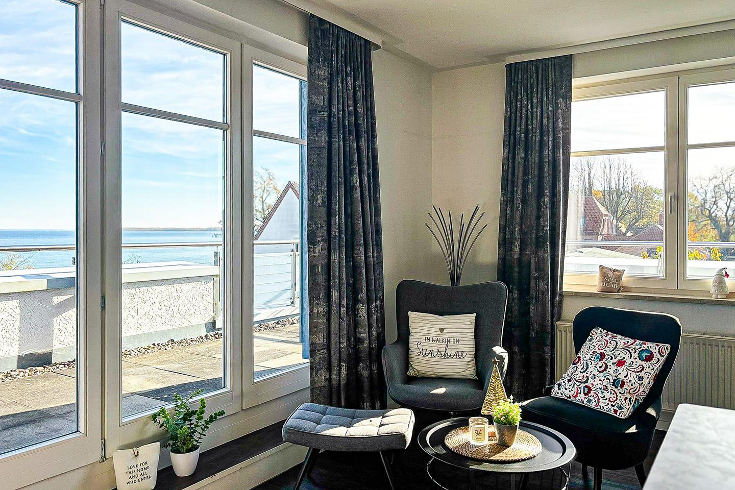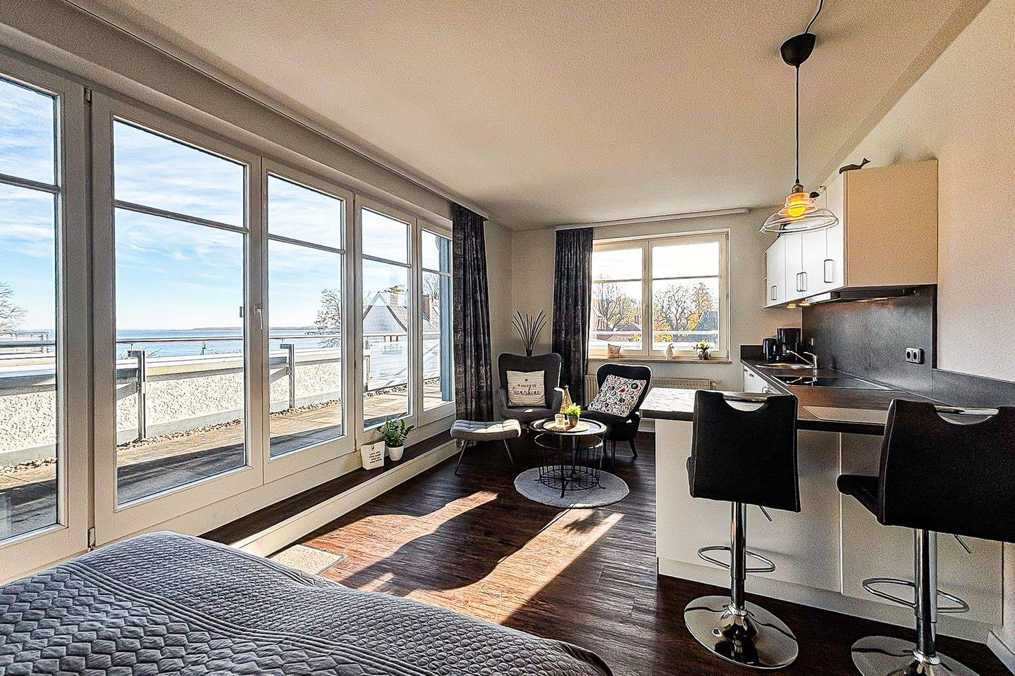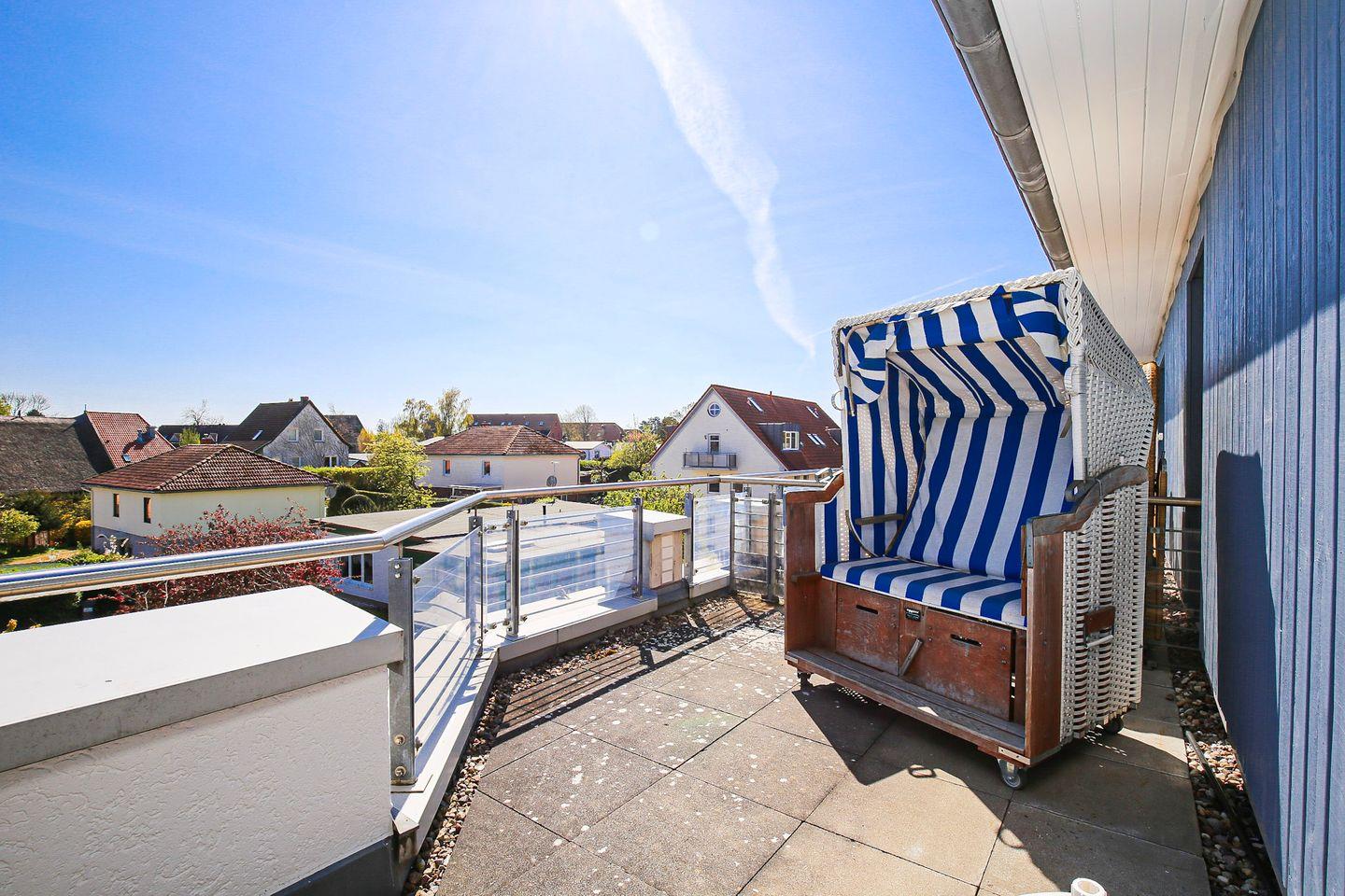 Vom Wohnraum aus gelangen Sie auf die möblierte Dachterrasse mit einem eigenen Strandkorb, einer Liege, einer Sitzgruppe mit Tisch sowie Seeblick. Der praktische Wohn- und Schlafbereich ist mit einem Bett (2x 80er x 200 cm) ausgestattet. Für Unterhaltung sorgen ein Flachbild-TV und ein Radio.