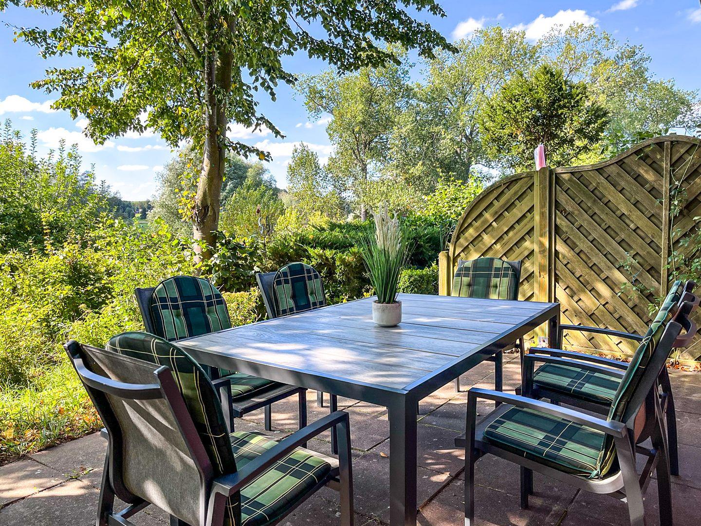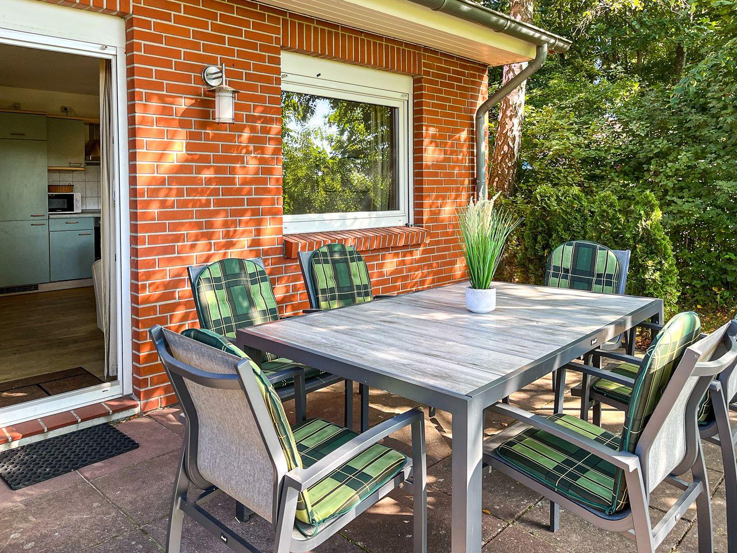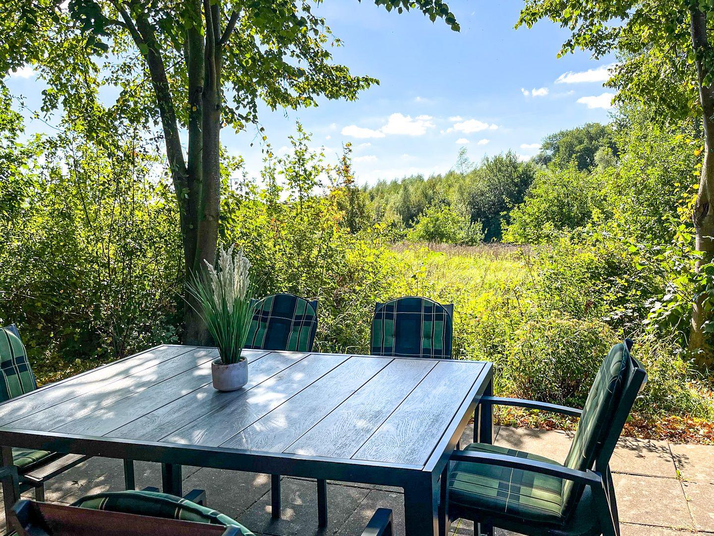Auf der geschützten Terrasse in Süd-West-Lage mit unverbautem Blick kannst du die herrliche Natur genießen. Zum Haus gehören Gartenstühle mit Auflagen, Tisch und Sonnenschirm.