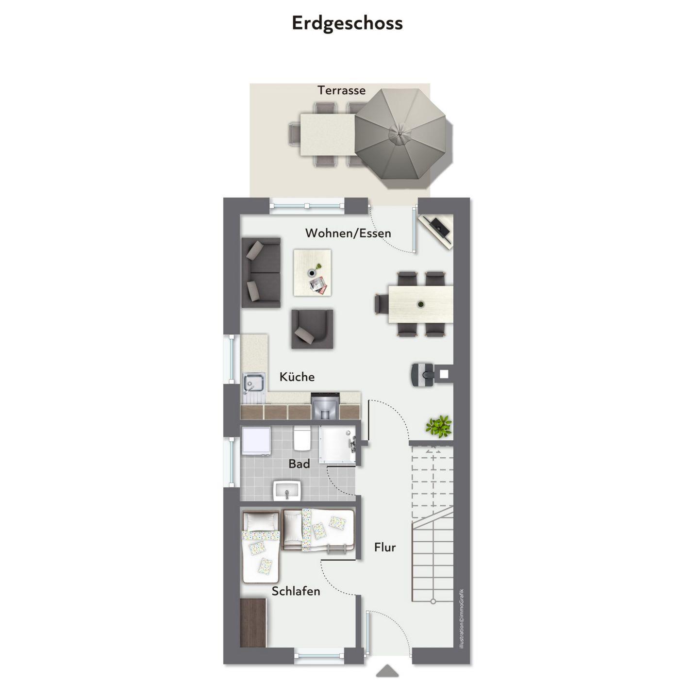 Vom Wohnbereich aus gelangst du direkt auf die Terrasse. Im hellen Wohn- und Essbereich befindet sich das moderne Sofa. Für Unterhaltung sorgen der Smart-TV und die Stereoanlage. In unmittelbarer Nähe der Küchenzeile befindet sich der Essplatz. Die im Wohnzimmer integrierte Küchenzeile ist unter anderem ausgestattet mit Geschirrspüler, Herd mit Backofen, Kühlschrank mit Gefrierfach und Mikrowelle.