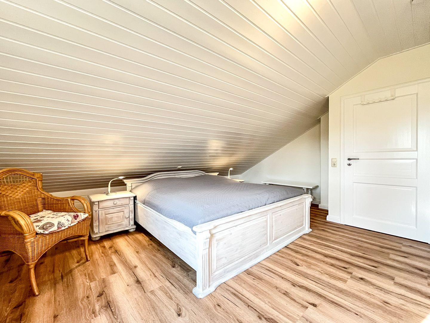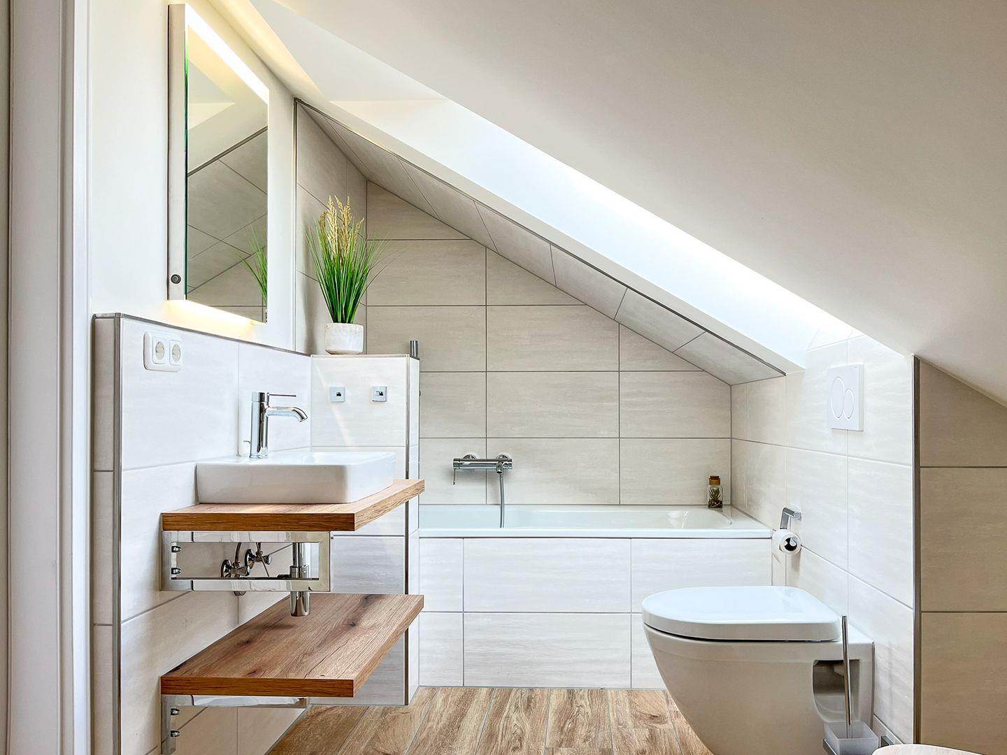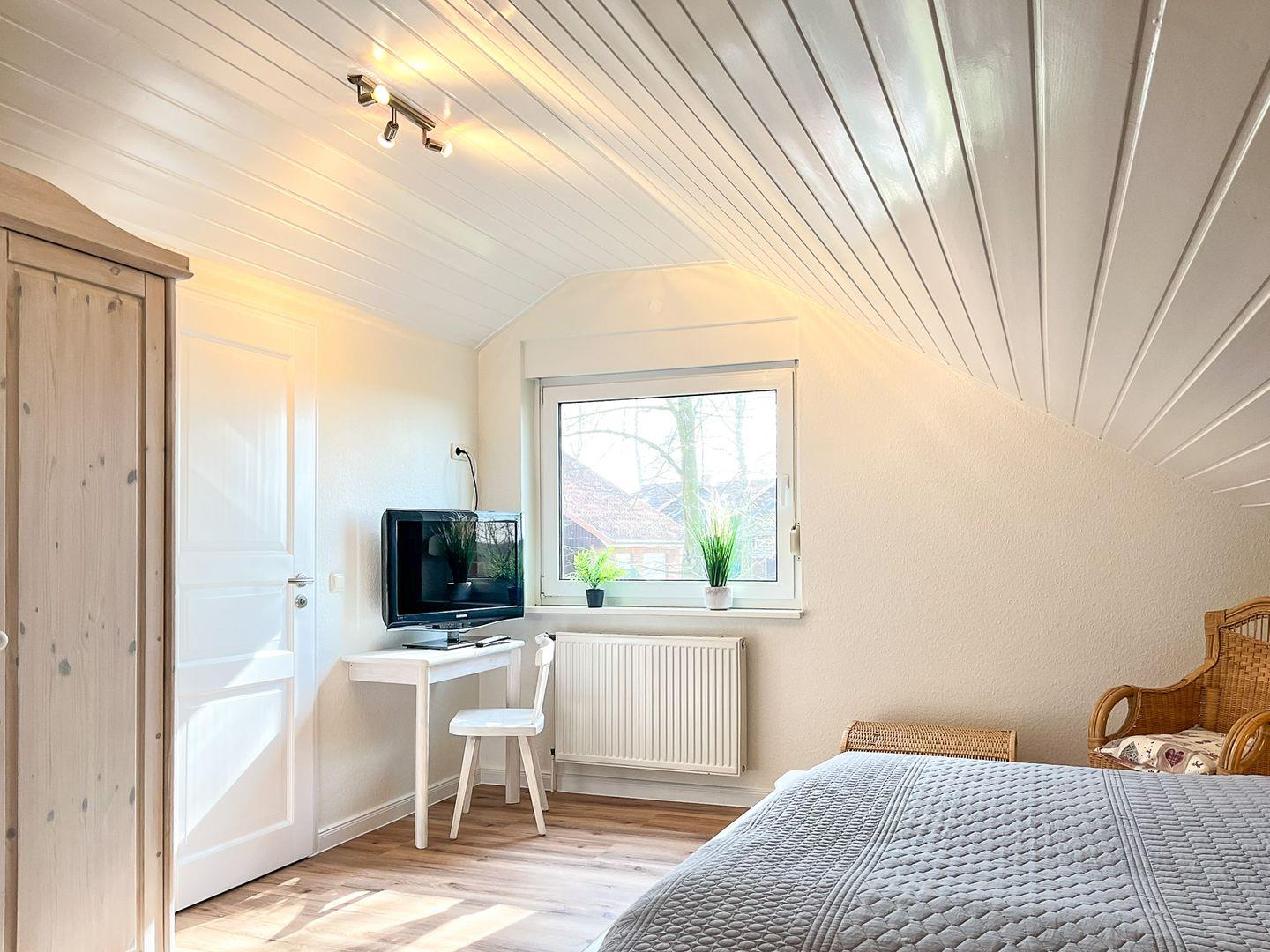 In der oberen Etage befindet sich ein Schlafzimmer mit Doppelbett (2 x 90 x 200 cm) und angeschlossenem Bad mit Badewanne. Hier findest du auch die Waschmaschine zur Nutzung vor.