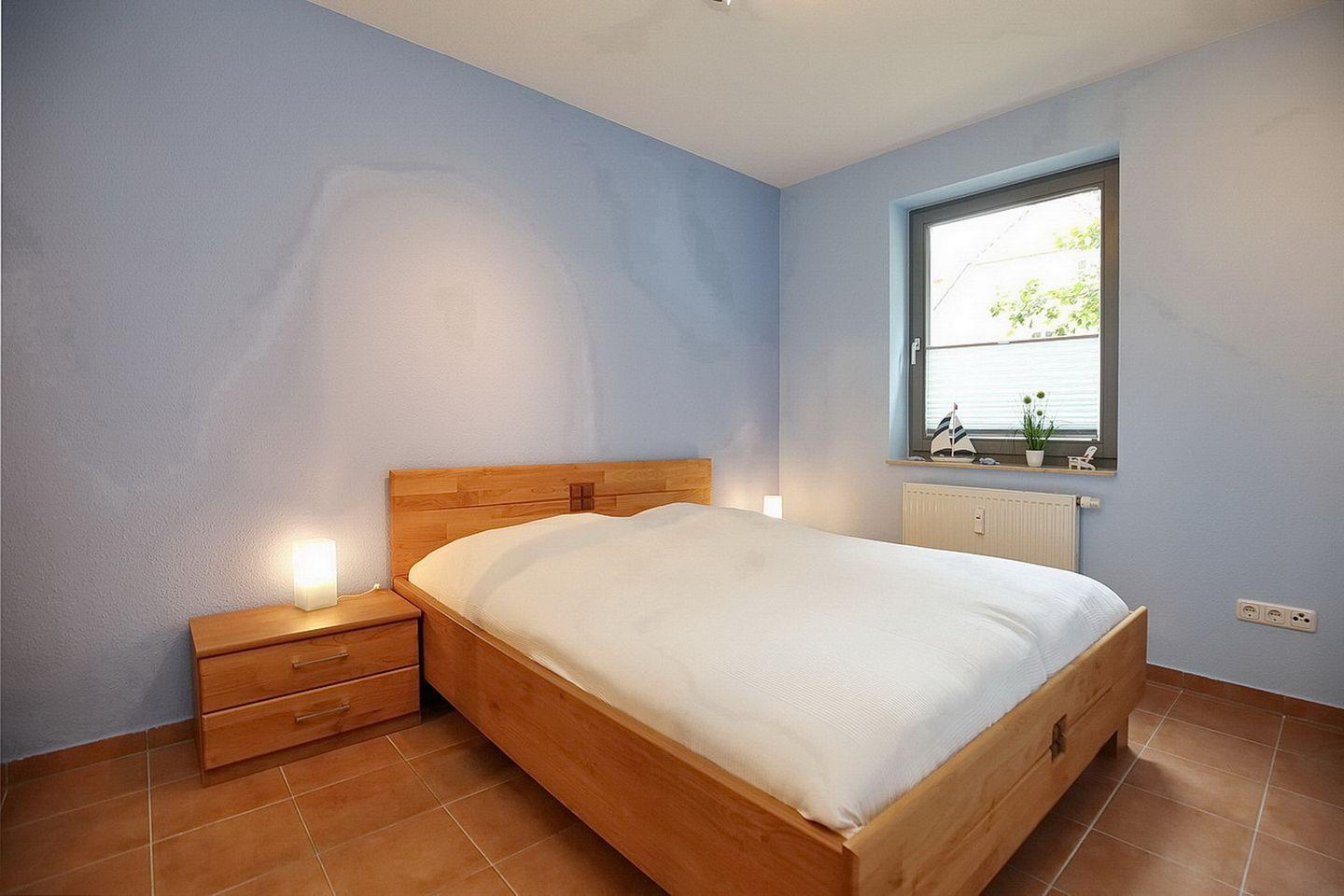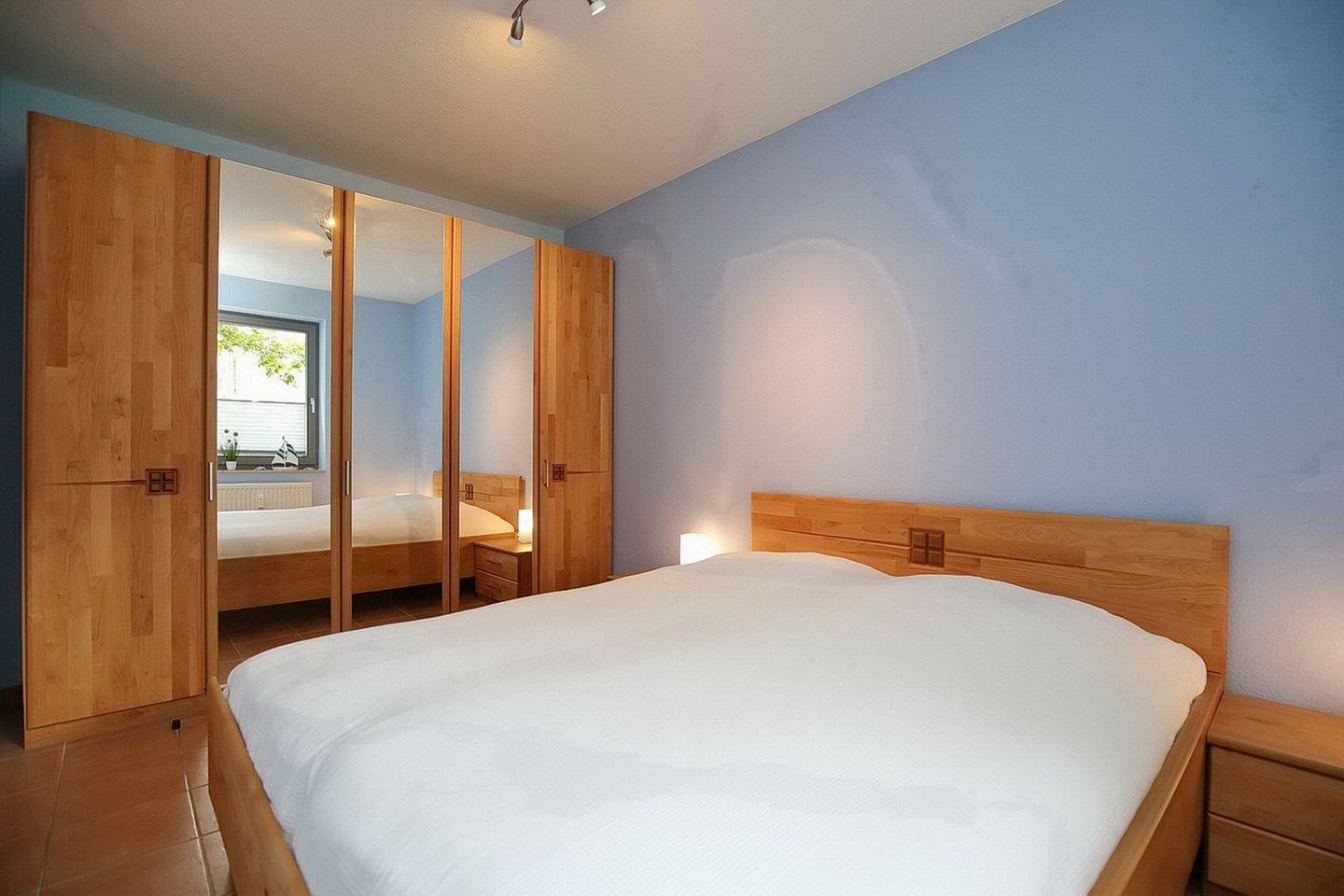 Im Schlafzimmer befindet sich neben dem Doppelbett (2 x 80 x 200 cm) auch ein großer Kleiderschrank mit genügend Platz für deine Urlaubsgarderobe.